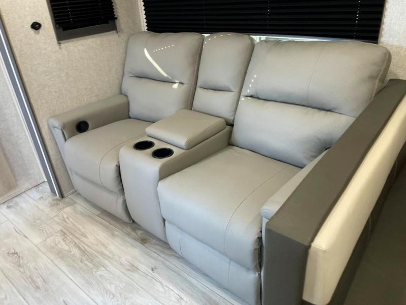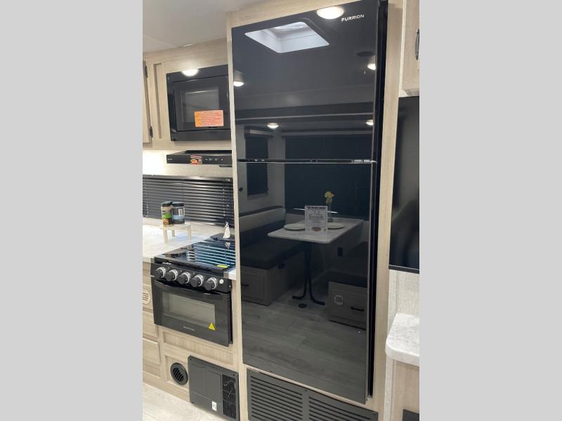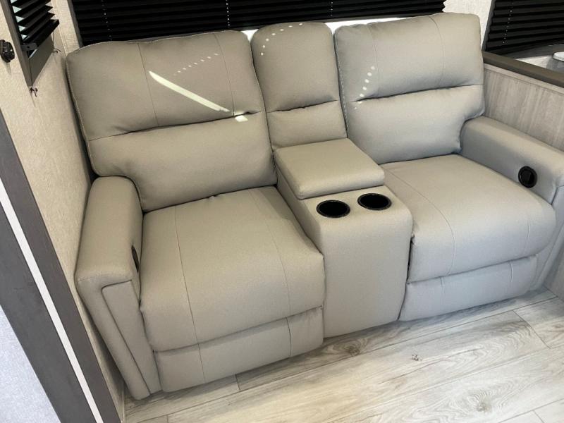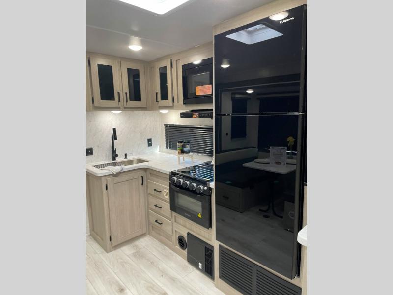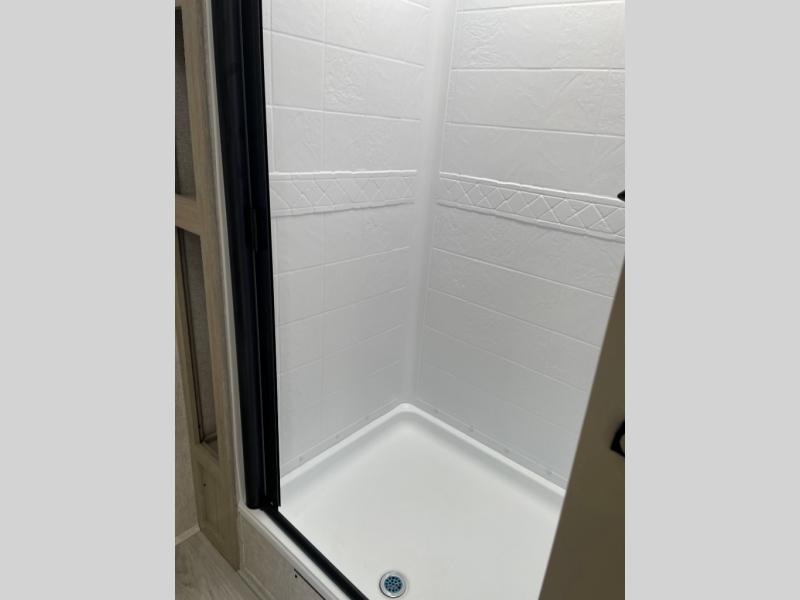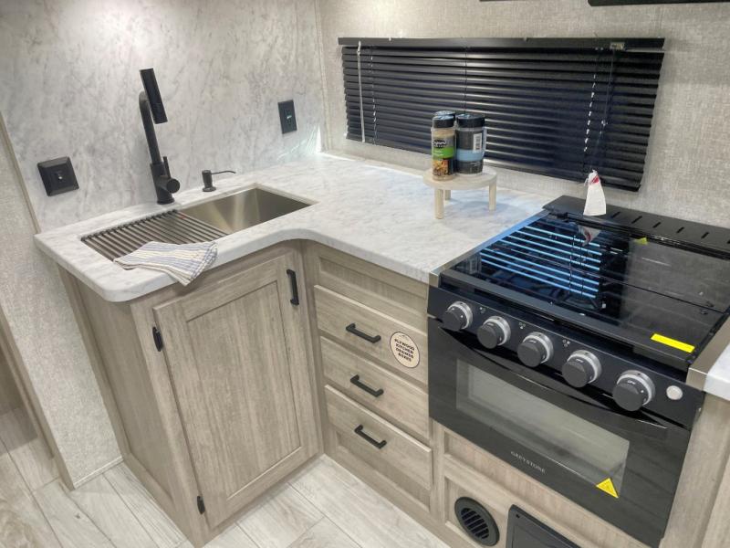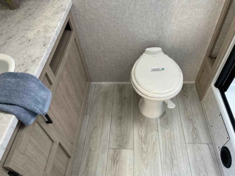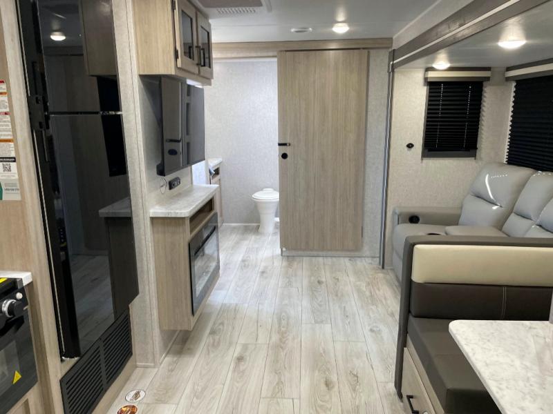 When you are wanting a little more interior space in your next travel trailer, take a look inside! This large slide out widens the center so you can easily make meals using full amenities without having to move for someone walking from the front private bedroom to the rear spacious bathroom. There is a king-size bed with storage on both sides, underneath and above, plus a space saving sliding door. The booth dinette and jiffy sofa offer comfortable seating as well as extra sleeping space for overnight guests. The fireplace is just a nice feature to enjoy, and the large pantry with washer/dryer prep gives you the option to make laundry day easier!