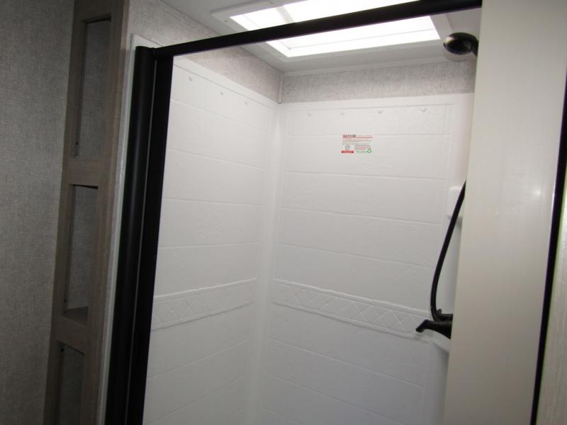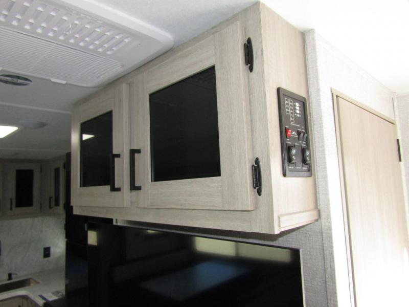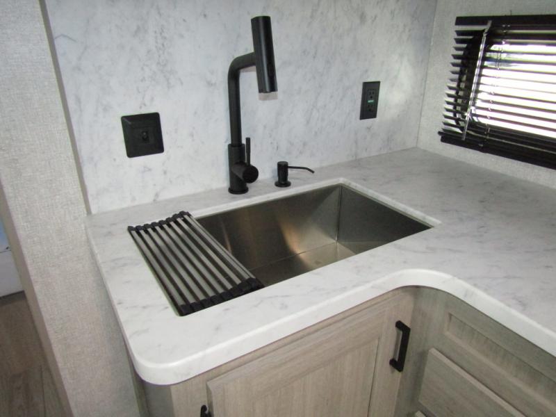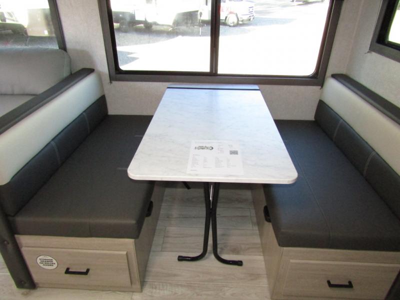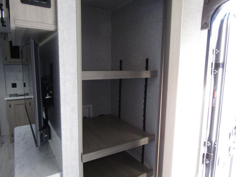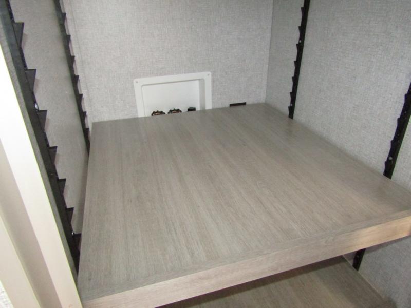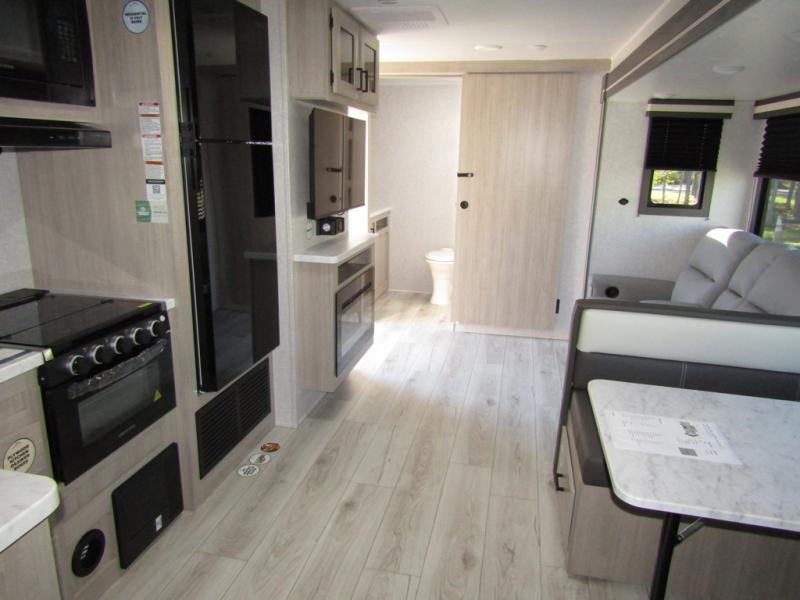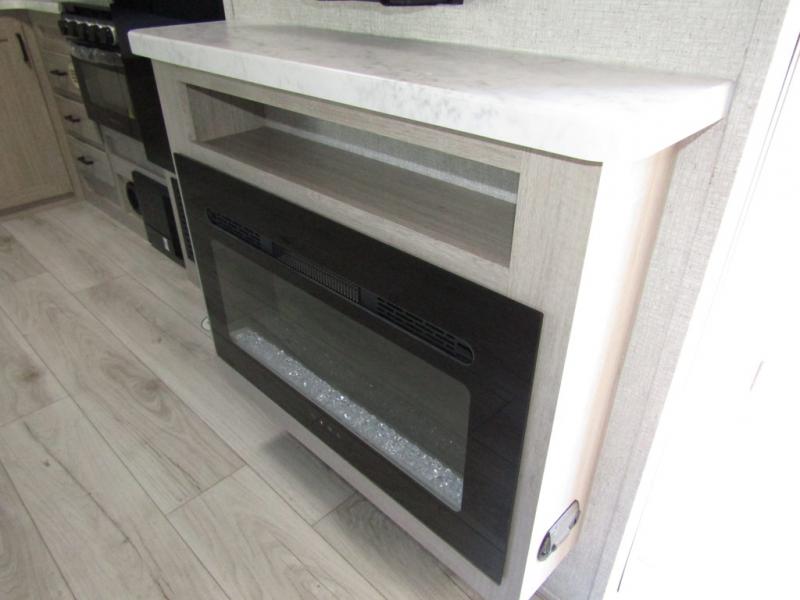 When you are wanting a little more interior space in your next travel trailer, take a look inside! This large slide out widens the center so you can easily make meals using full amenities without having to move for someone walking from the front private bedroom to the rear spacious bathroom. There is a king-size bed with storage on both sides, underneath and above, plus a space saving sliding door. The booth dinette and jiffy sofa offer comfortable seating as well as extra sleeping space for overnight guests. The fireplace is just a nice feature to enjoy, and the large pantry with washer/dryer prep gives you the option to make laundry day easier!