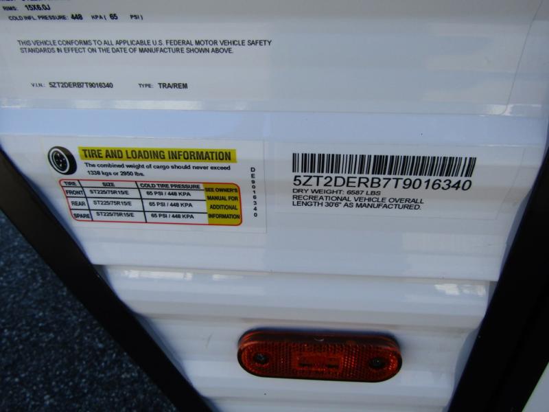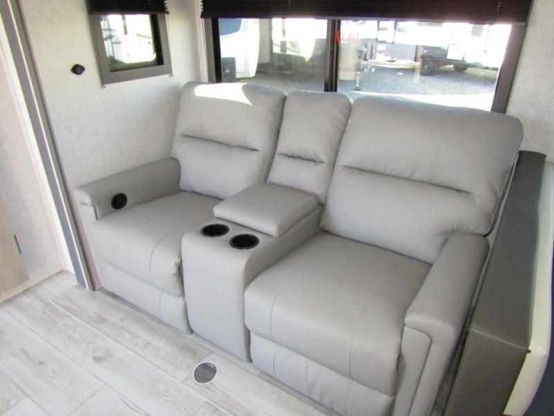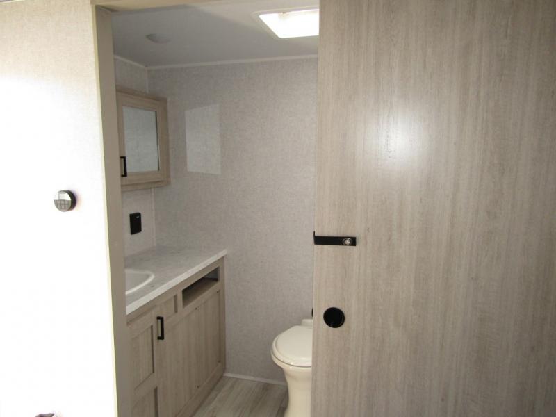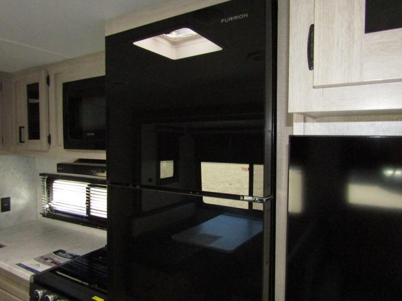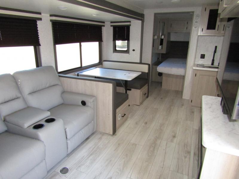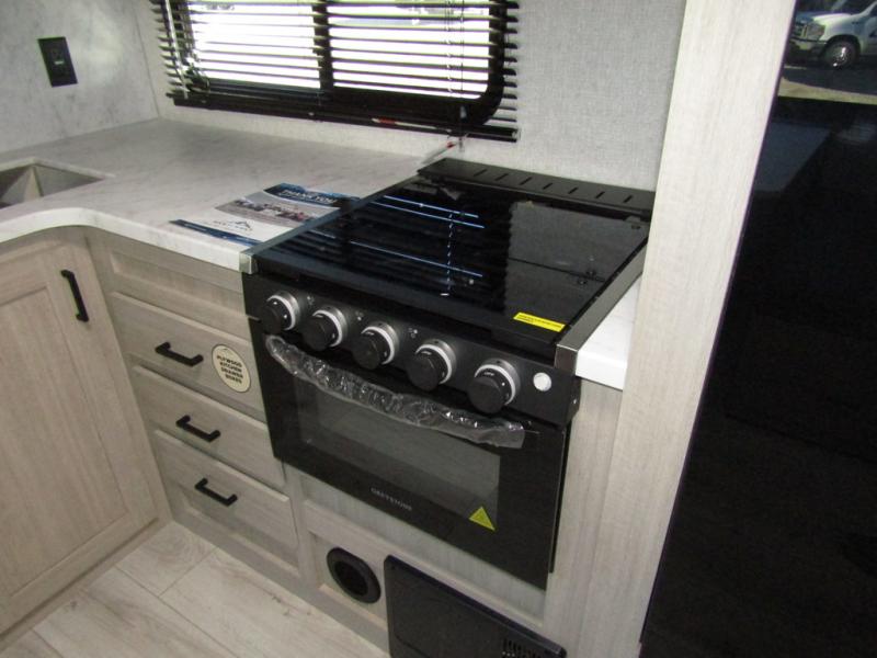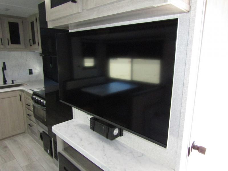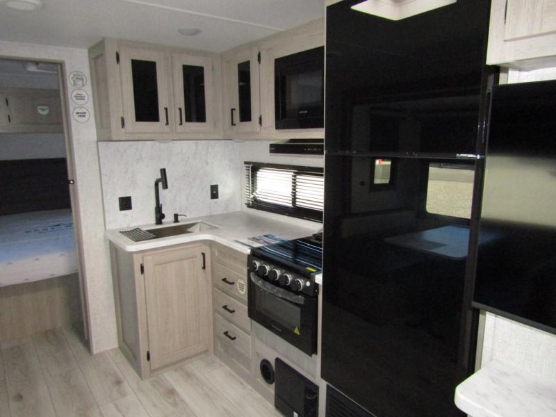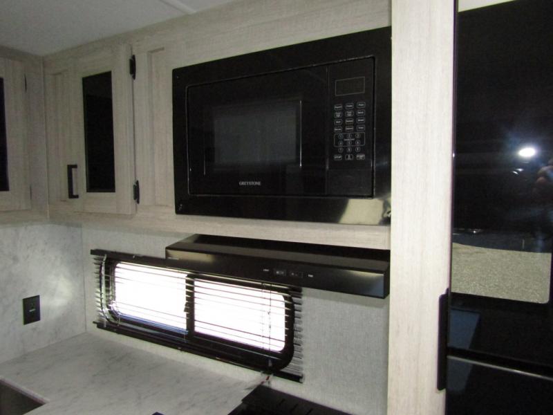 When you are wanting a little more interior space in your next travel trailer, take a look inside! This large slide out widens the center so you can easily make meals using full amenities without having to move for someone walking from the front private bedroom to the rear spacious bathroom. There is a king-size bed with storage on both sides, underneath and above, plus a space saving sliding door. The booth dinette and jiffy sofa offer comfortable seating as well as extra sleeping space for overnight guests. The fireplace is just a nice feature to enjoy, and the large pantry with washer/dryer prep gives you the option to make laundry day easier!