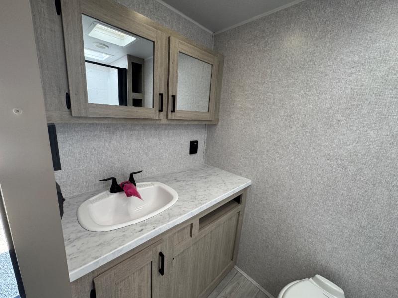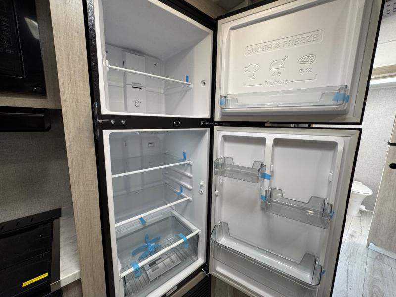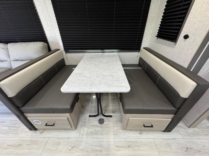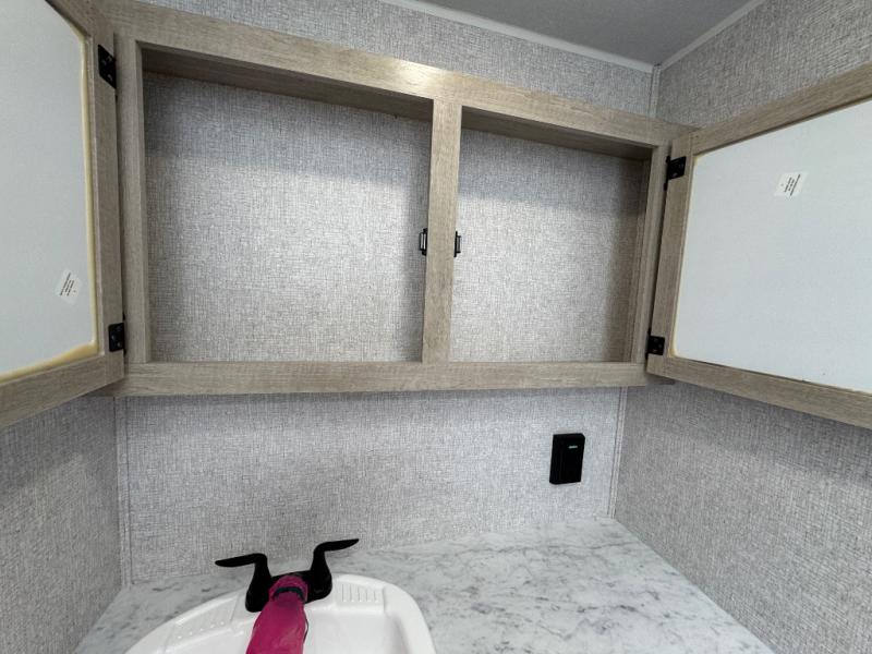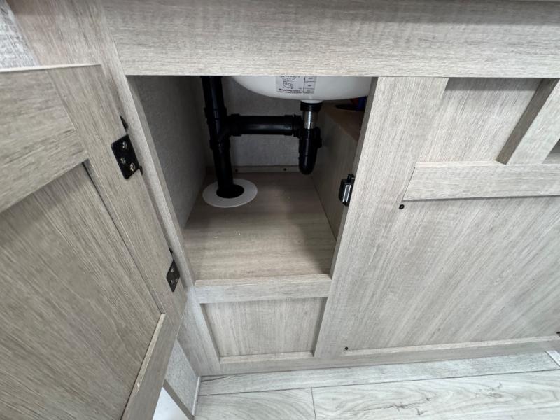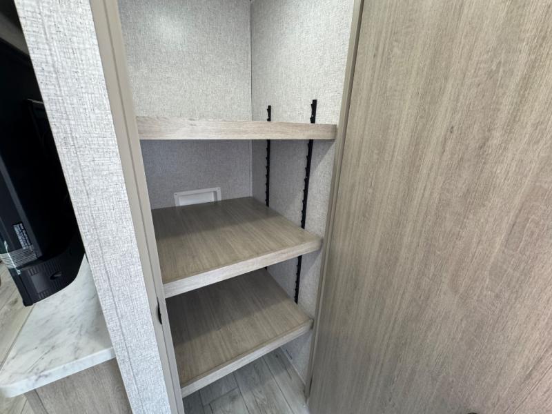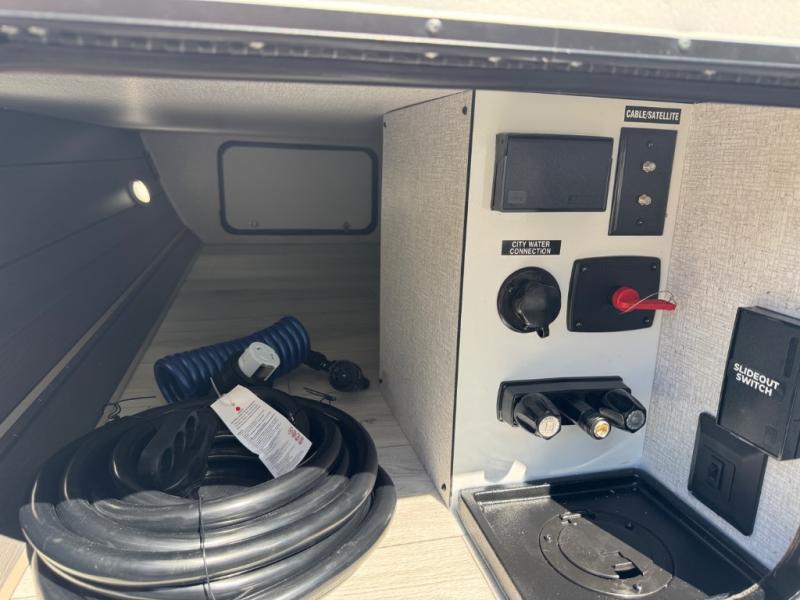 When you are wanting a little more interior space in your next travel trailer, take a look inside! This large slide out widens the center so you can easily make meals using full amenities without having to move for someone walking from the front private bedroom to the rear spacious bathroom. There is a king-size bed with storage on both sides, underneath and above, plus a space saving sliding door. The booth dinette and jiffy sofa offer comfortable seating as well as extra sleeping space for overnight guests. The fireplace is just a nice feature to enjoy, and the large pantry with washer/dryer prep gives you the option to make laundry day easier!