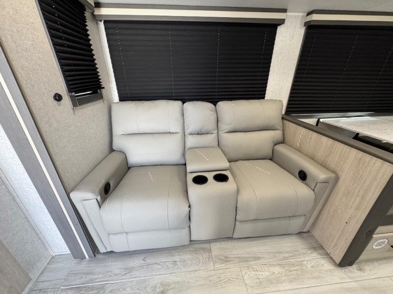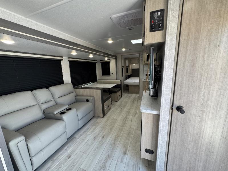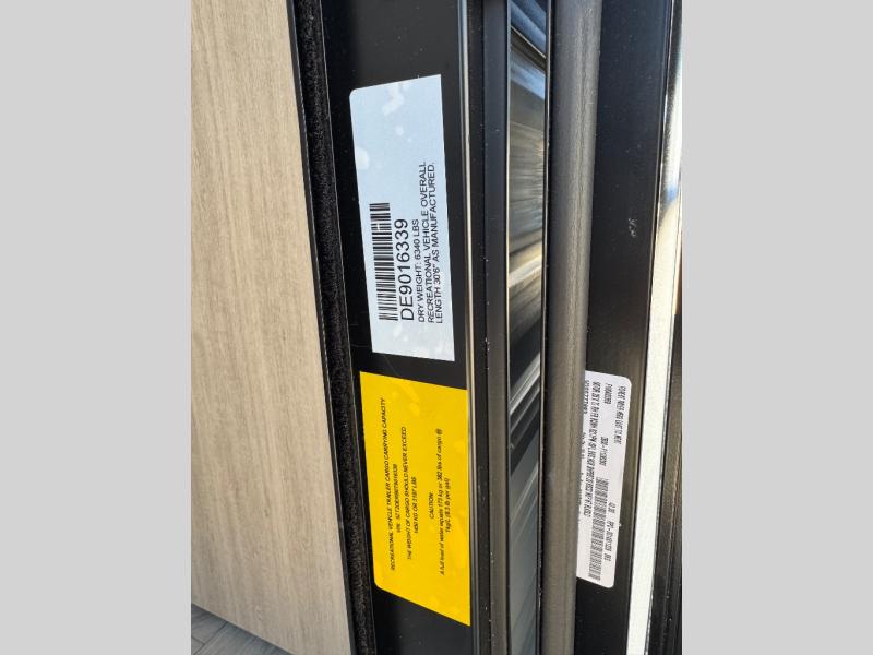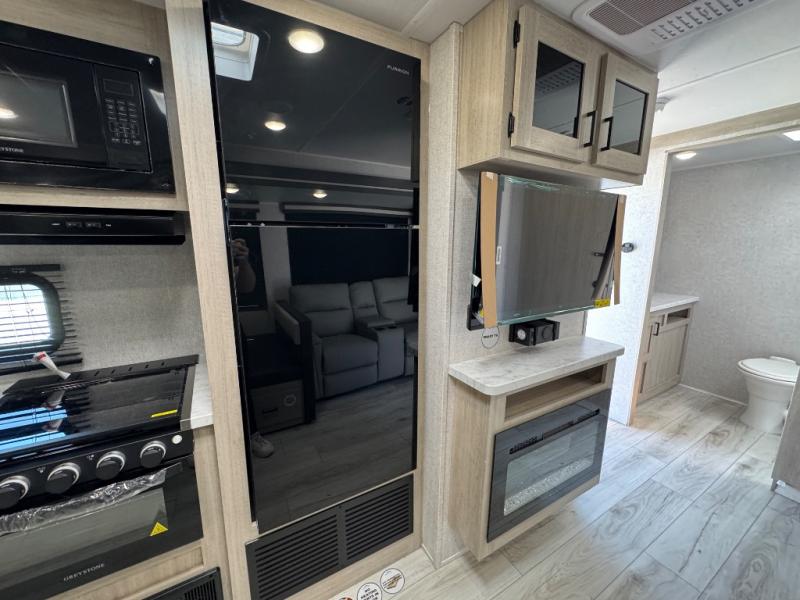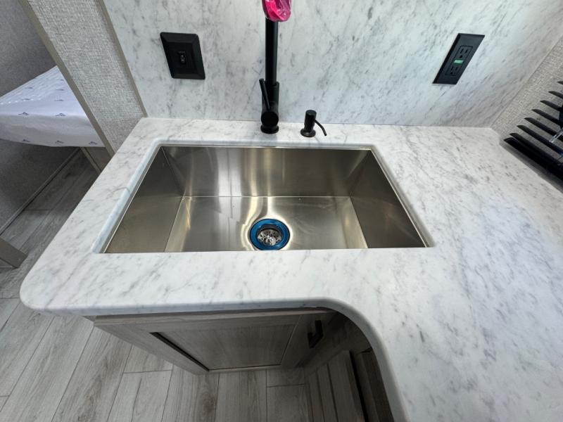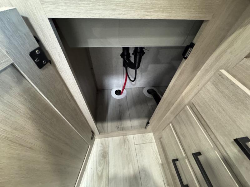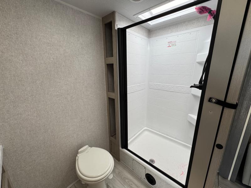 When you are wanting a little more interior space in your next travel trailer, take a look inside! This large slide out widens the center so you can easily make meals using full amenities without having to move for someone walking from the front private bedroom to the rear spacious bathroom. There is a king-size bed with storage on both sides, underneath and above, plus a space saving sliding door. The booth dinette and jiffy sofa offer comfortable seating as well as extra sleeping space for overnight guests. The fireplace is just a nice feature to enjoy, and the large pantry with washer/dryer prep gives you the option to make laundry day easier!