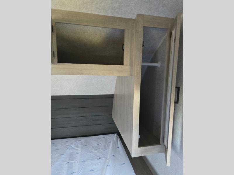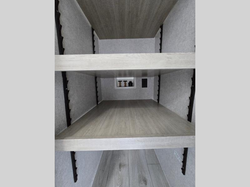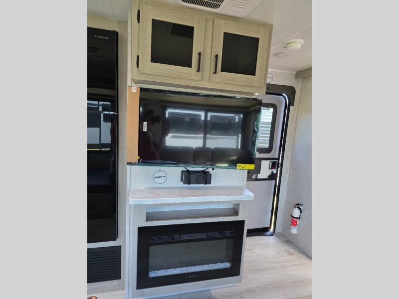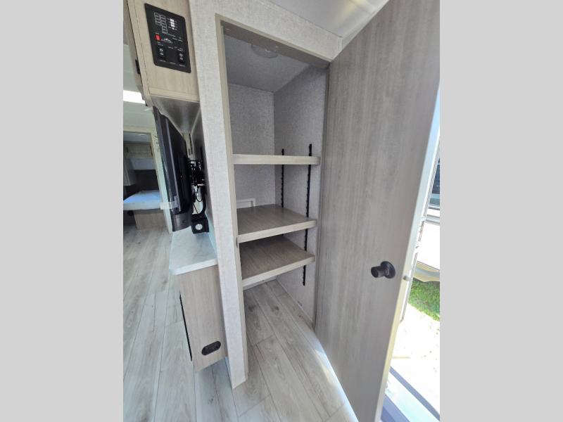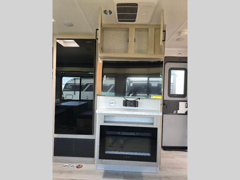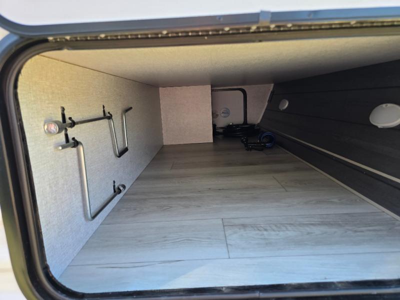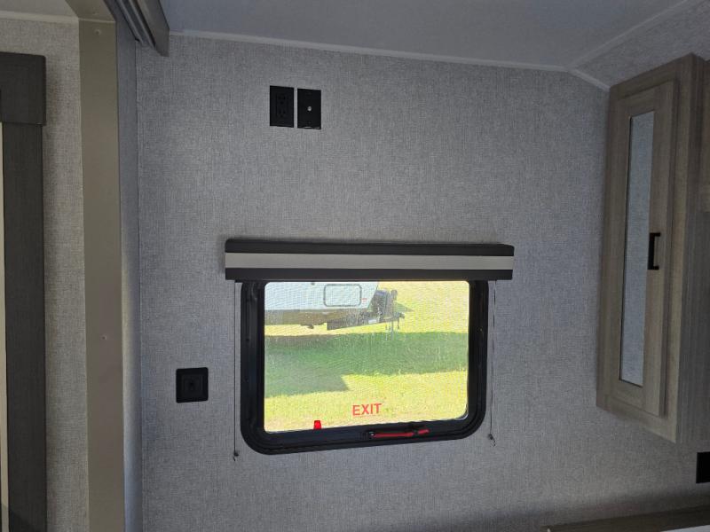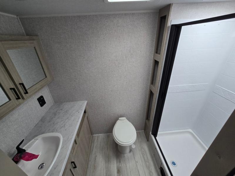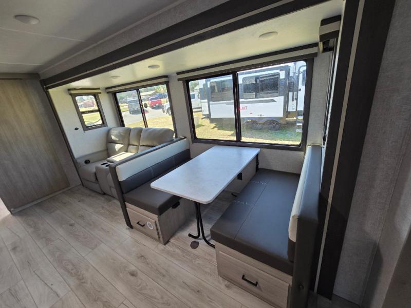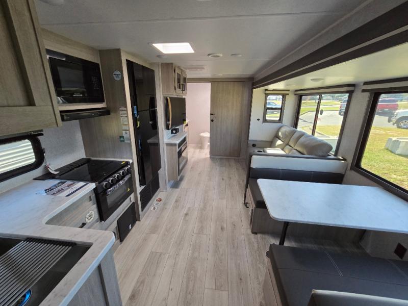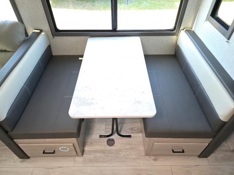 When you are wanting a little more interior space in your next travel trailer, take a look inside! This large slide out widens the center so you can easily make meals using full amenities without having to move for someone walking from the front private bedroom to the rear spacious bathroom. There is a king-size bed with storage on both sides, underneath and above, plus a space saving sliding door. The booth dinette and jiffy sofa offer comfortable seating as well as extra sleeping space for overnight guests. The fireplace is just a nice feature to enjoy, and the large pantry with washer/dryer prep gives you the option to make laundry day easier!