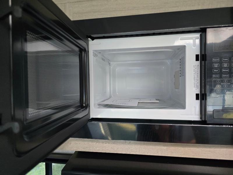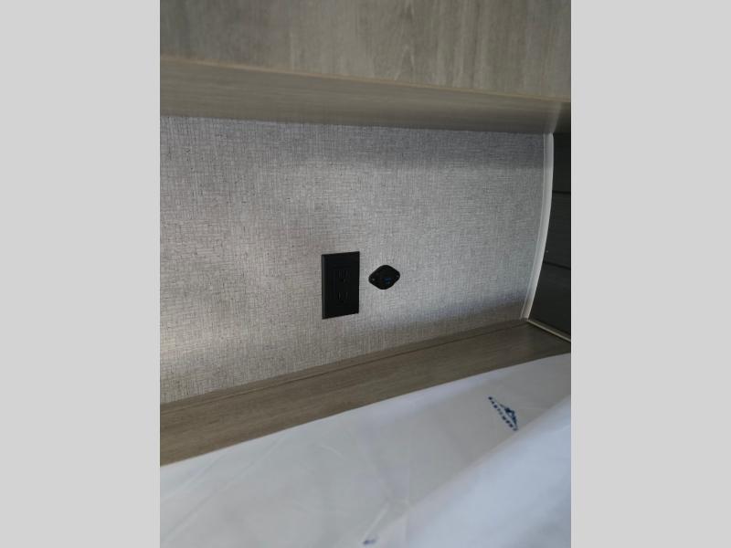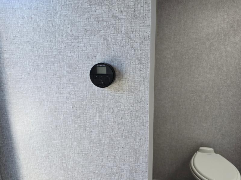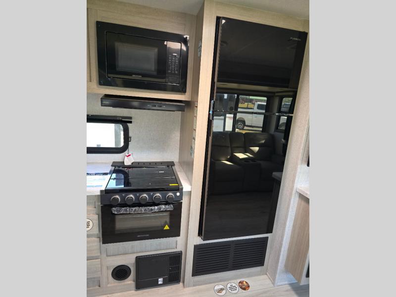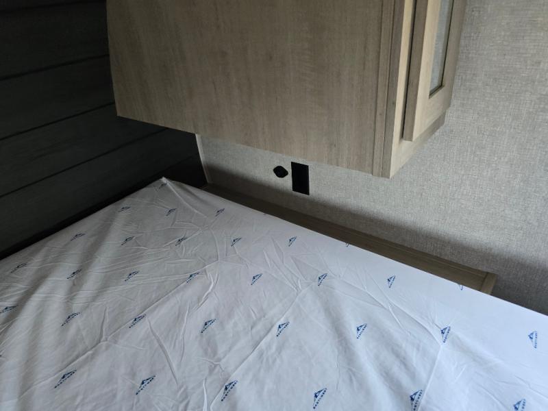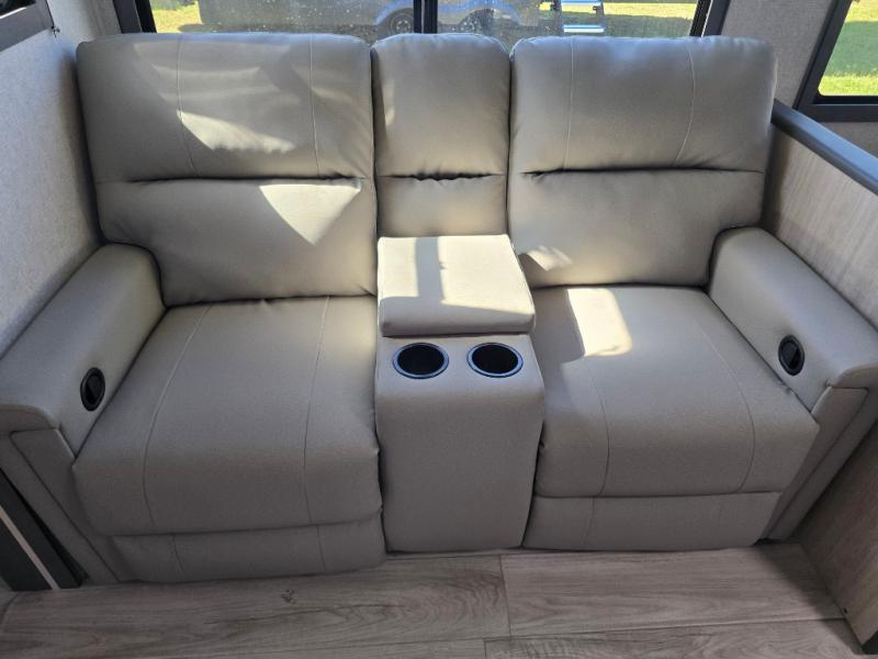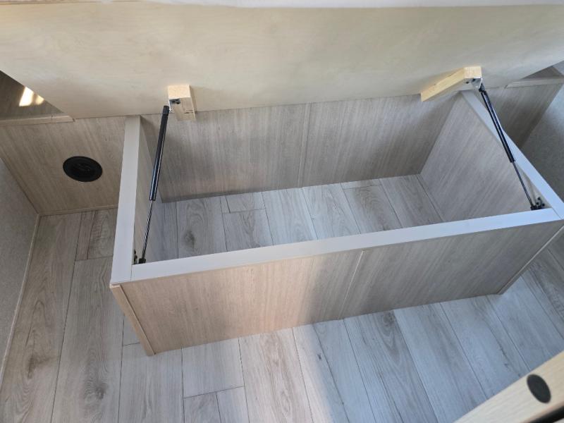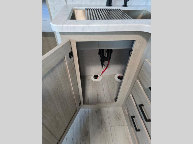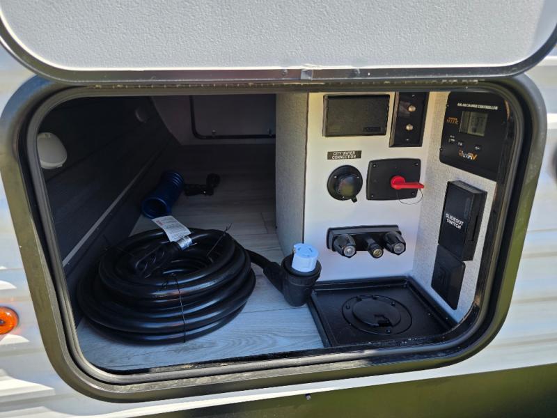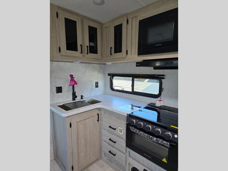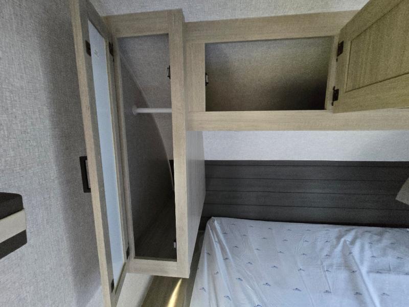 When you are wanting a little more interior space in your next travel trailer, take a look inside! This large slide out widens the center so you can easily make meals using full amenities without having to move for someone walking from the front private bedroom to the rear spacious bathroom. There is a king-size bed with storage on both sides, underneath and above, plus a space saving sliding door. The booth dinette and jiffy sofa offer comfortable seating as well as extra sleeping space for overnight guests. The fireplace is just a nice feature to enjoy, and the large pantry with washer/dryer prep gives you the option to make laundry day easier!