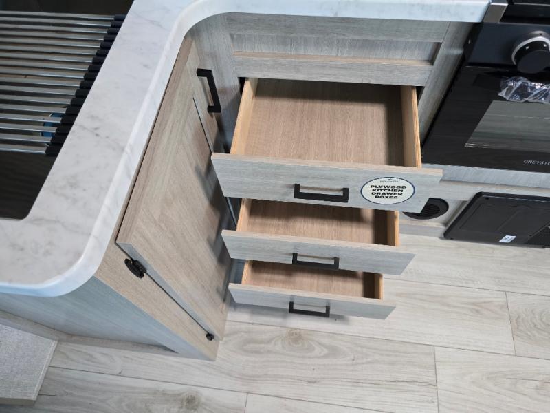 Each Della Terra travel trailer by EAST TO WEST is constructed with an enclosed and heated underbelly and enclosed holding tanks for added protection against the elements. There is also a power tongue jack with an LED light for easy set up and a power awning with LED lights you can rest under after you've unpacked. The Explore Comfort Package comes seamless pressed countertops, kitchen backsplash, window valance package with black night shades, and many more comforts. You will also appreciate the Adventure Outdoor Package with backup camera prep and solar prep, a tankless water heater, an RV grill quick disconnect, and a universal docking station with battery disconnect.