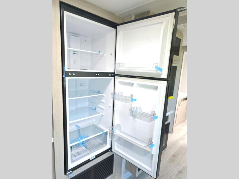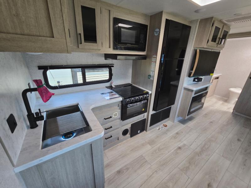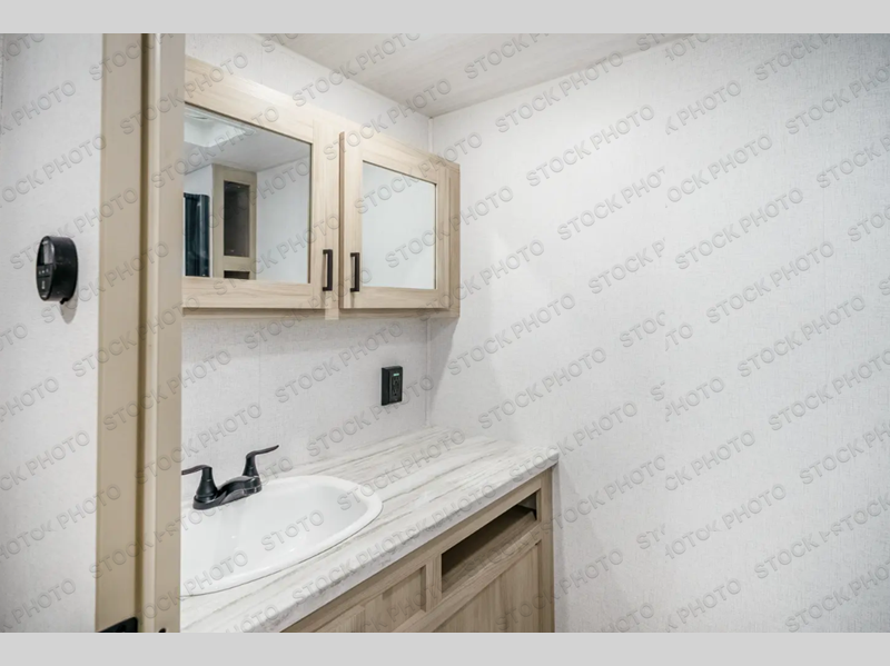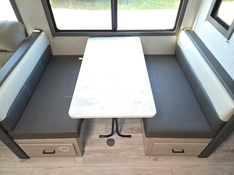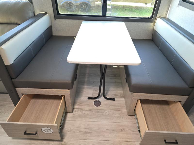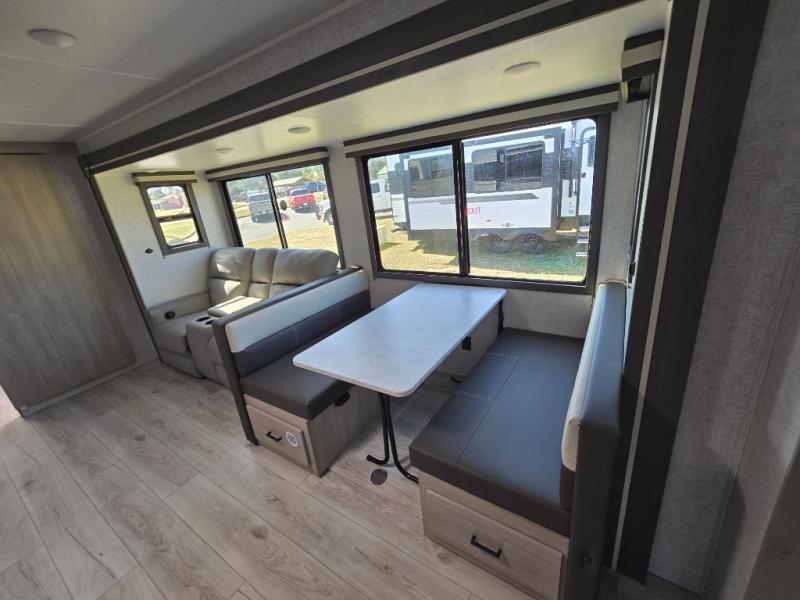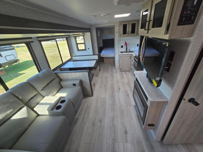 When you are wanting a little more interior space in your next travel trailer, take a look inside! This large slide out widens the center so you can easily make meals using full amenities without having to move for someone walking from the front private bedroom to the rear spacious bathroom. There is a king-size bed with storage on both sides, underneath and above, plus a space saving sliding door. The booth dinette and jiffy sofa offer comfortable seating as well as extra sleeping space for overnight guests. The fireplace is just a nice feature to enjoy, and the large pantry with washer/dryer prep gives you the option to make laundry day easier!
