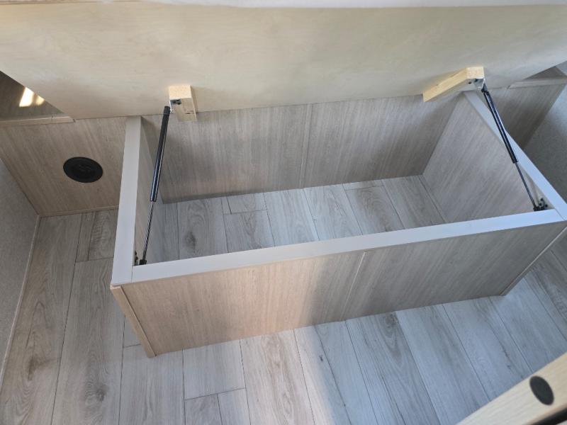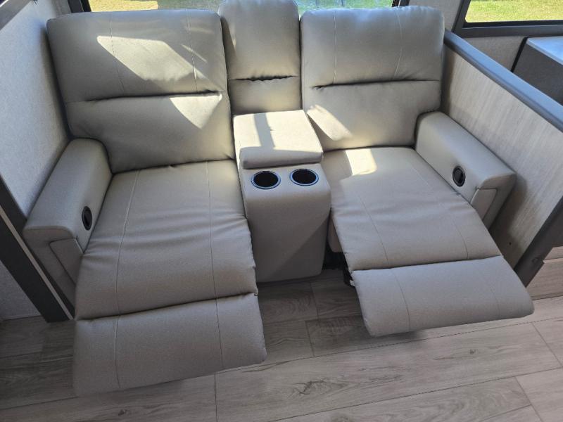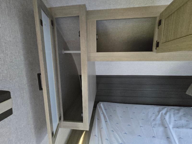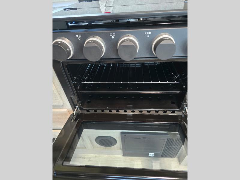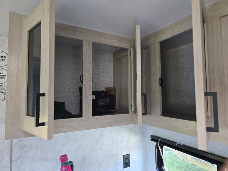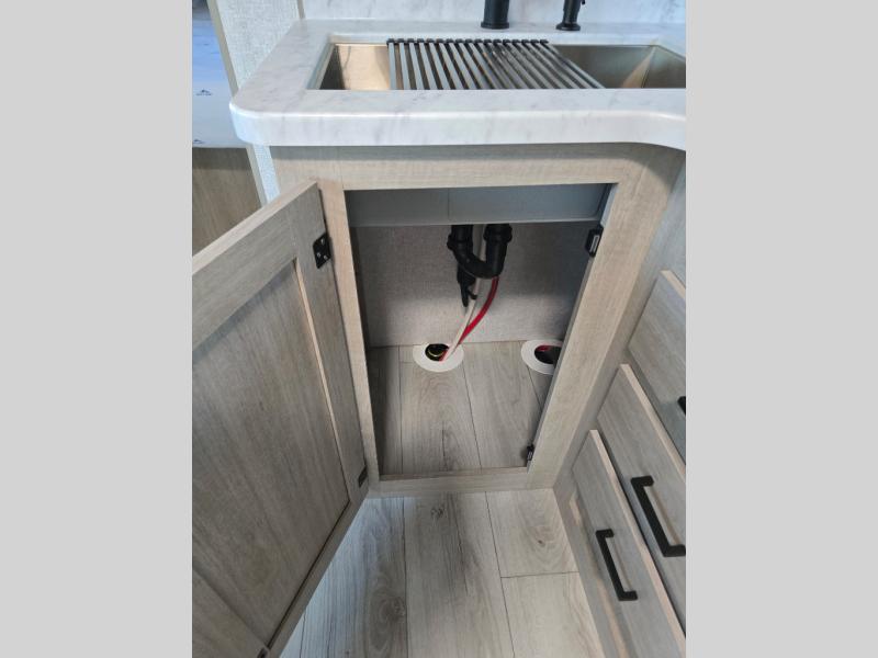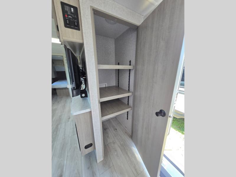 When you are wanting a little more interior space in your next travel trailer, take a look inside! This large slide out widens the center so you can easily make meals using full amenities without having to move for someone walking from the front private bedroom to the rear spacious bathroom. There is a king-size bed with storage on both sides, underneath and above, plus a space saving sliding door. The booth dinette and jiffy sofa offer comfortable seating as well as extra sleeping space for overnight guests. The fireplace is just a nice feature to enjoy, and the large pantry with washer/dryer prep gives you the option to make laundry day easier!