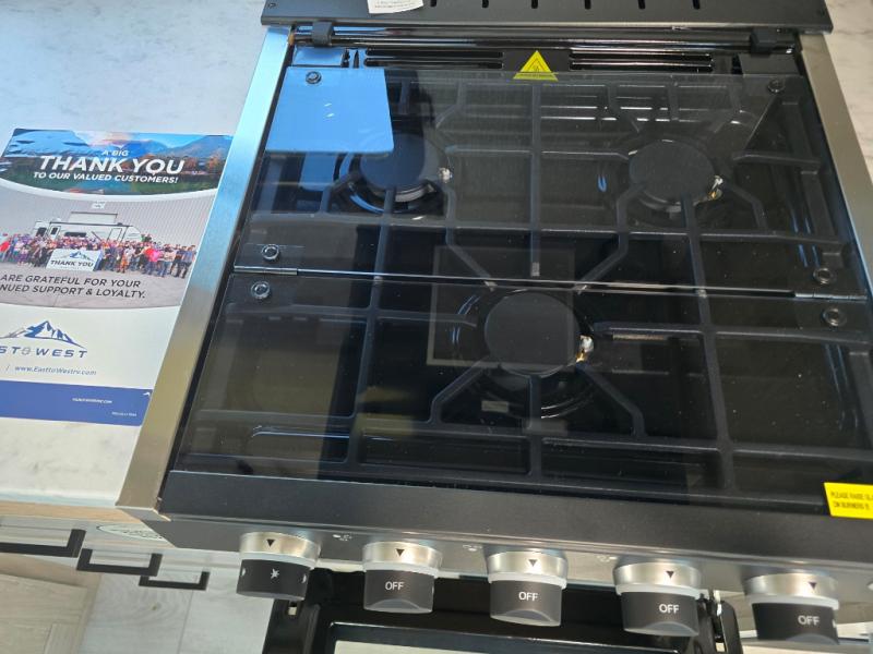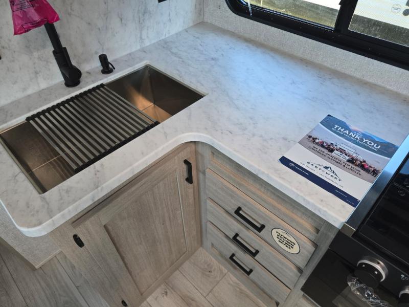 Each Della Terra travel trailer by EAST TO WEST is constructed with an enclosed and heated underbelly and enclosed holding tanks for added protection against the elements. There is also a power tongue jack with an LED light for easy set up and a power awning with LED lights you can rest under after you've unpacked. The Explore Comfort Package comes seamless pressed countertops, kitchen backsplash, window valance package with black night shades, and many more comforts. You will also appreciate the Adventure Outdoor Package with backup camera prep and solar prep, a tankless water heater, an RV grill quick disconnect, and a universal docking station with battery disconnect.