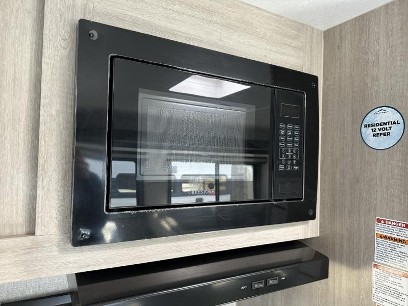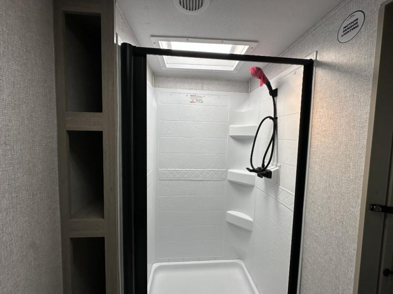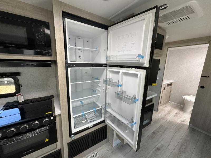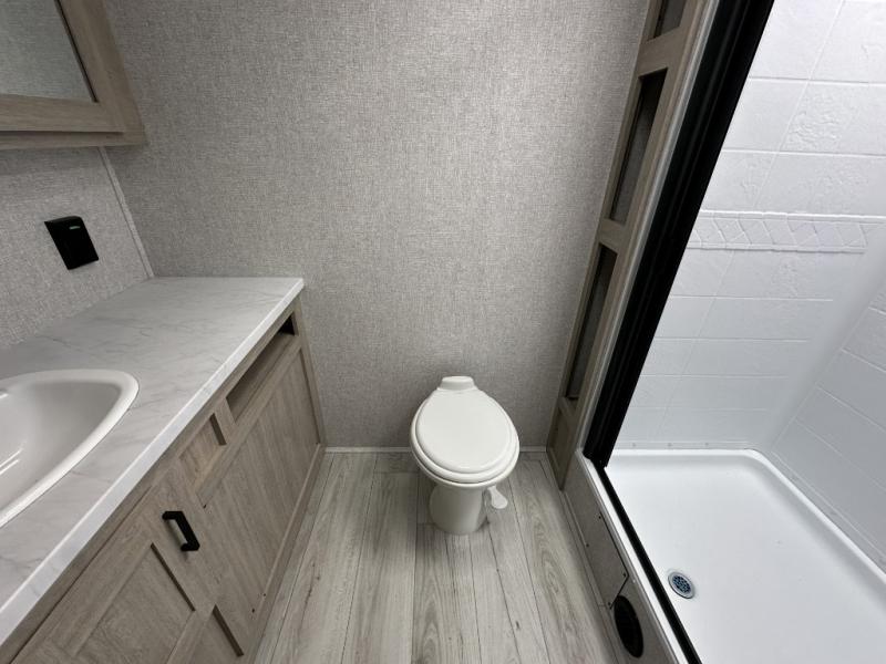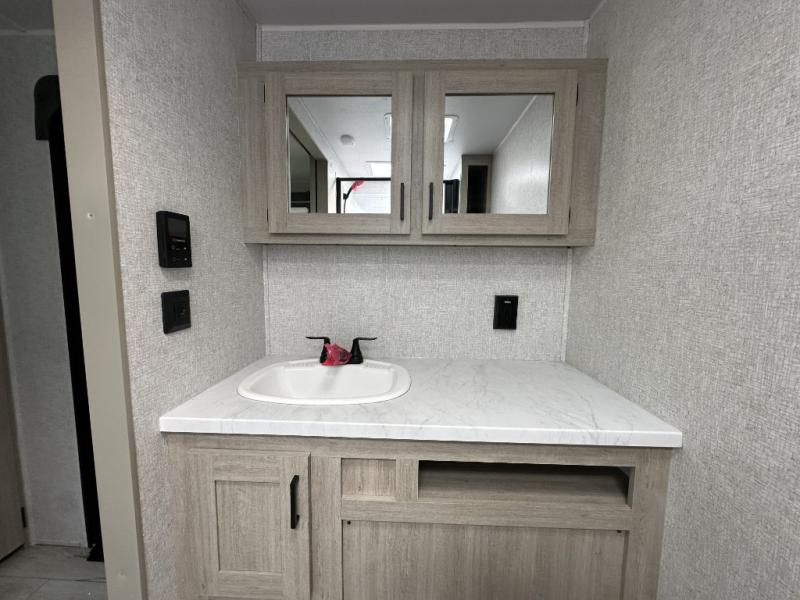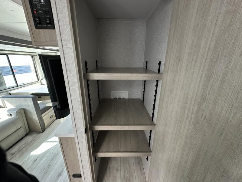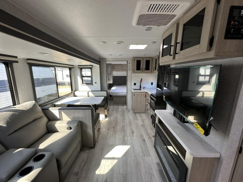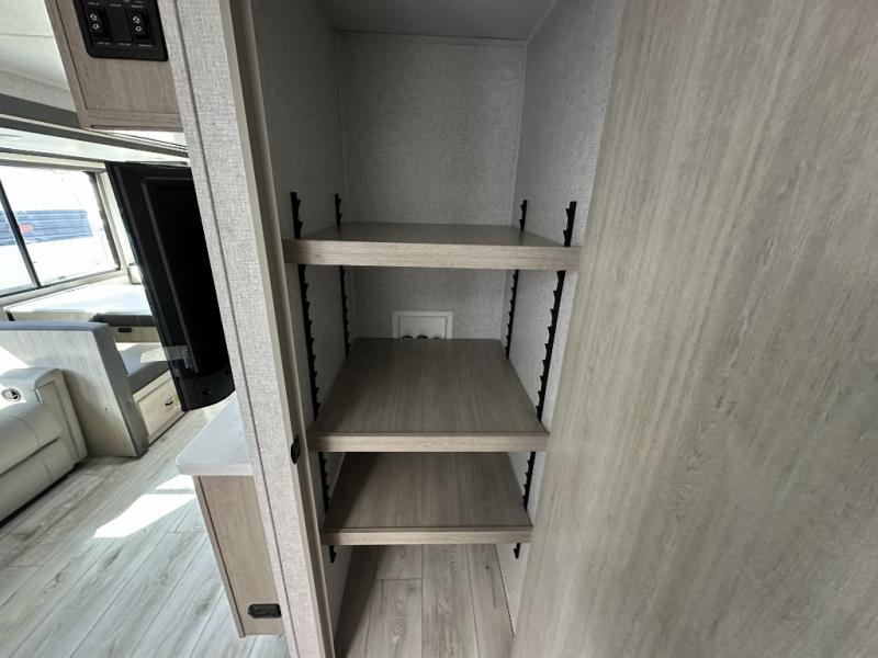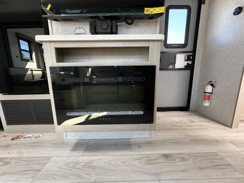 When you are wanting a little more interior space in your next travel trailer, take a look inside! This large slide out widens the center so you can easily make meals using full amenities without having to move for someone walking from the front private bedroom to the rear spacious bathroom. There is a king-size bed with storage on both sides, underneath and above, plus a space saving sliding door. The booth dinette and jiffy sofa offer comfortable seating as well as extra sleeping space for overnight guests. The fireplace is just a nice feature to enjoy, and the large pantry with washer/dryer prep gives you the option to make laundry day easier!