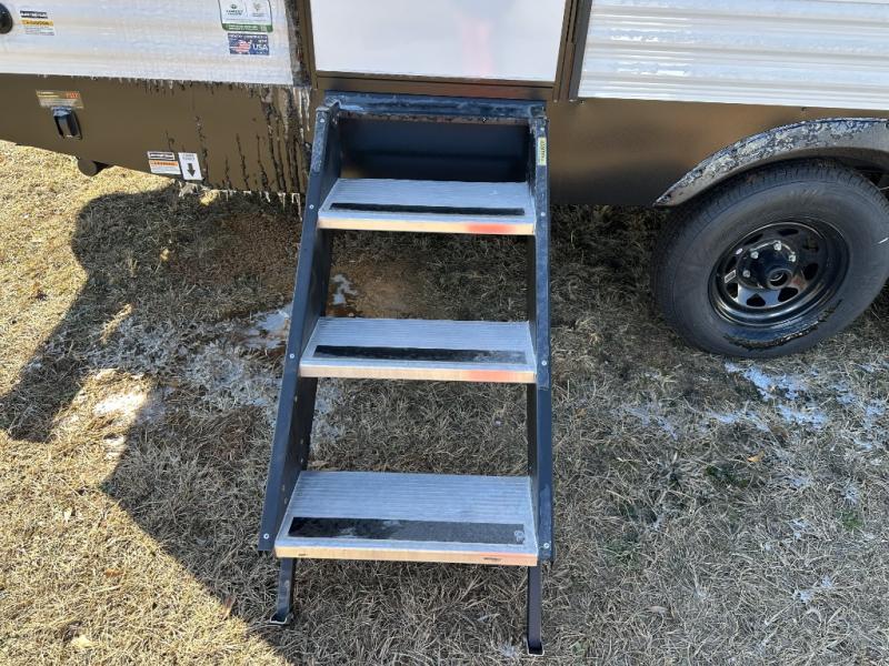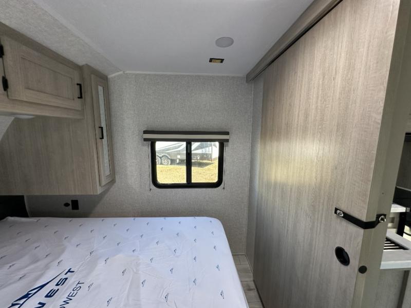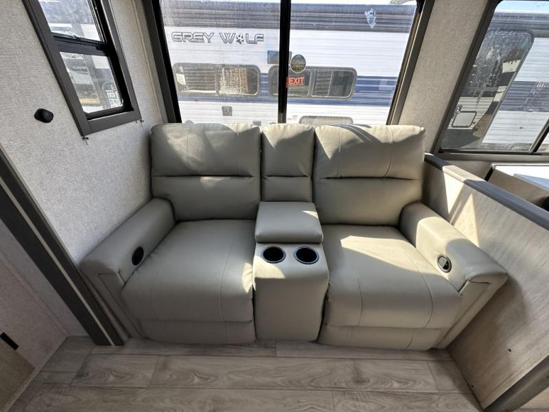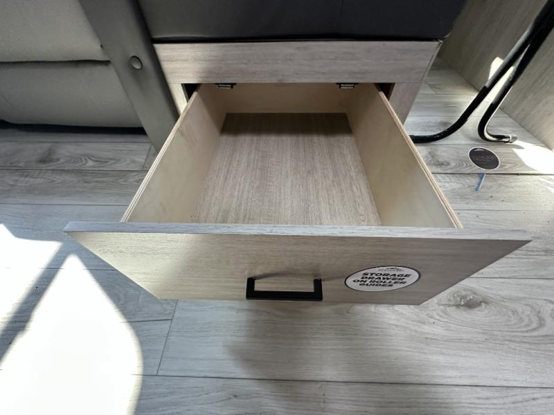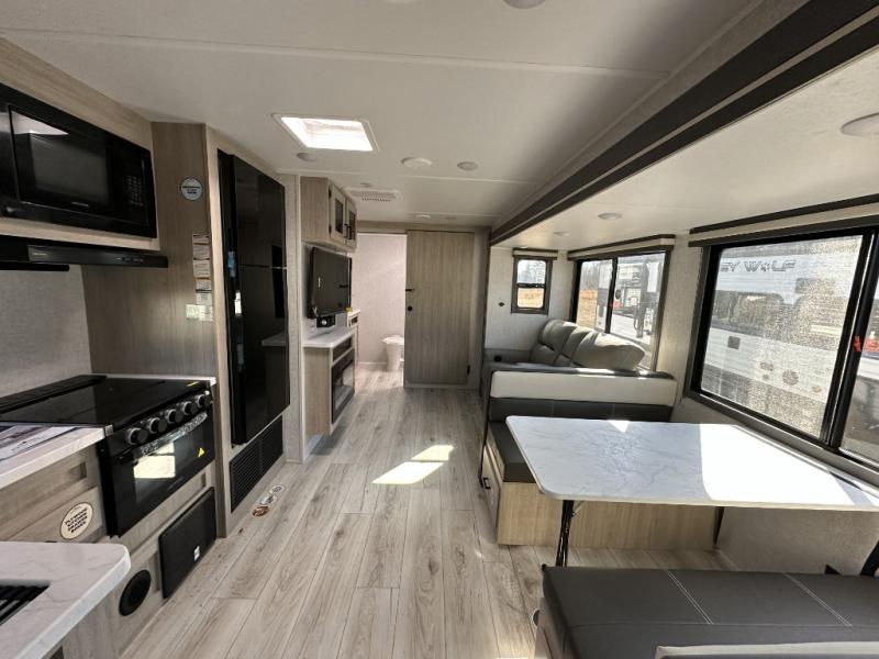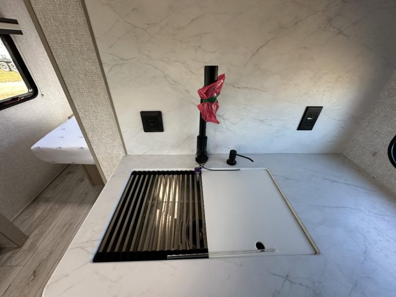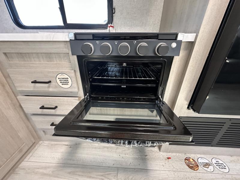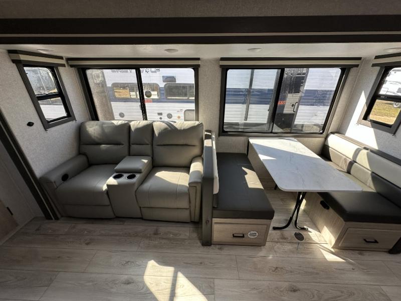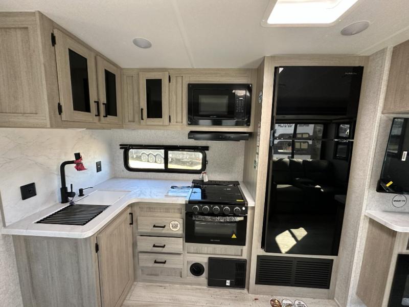 When you are wanting a little more interior space in your next travel trailer, take a look inside! This large slide out widens the center so you can easily make meals using full amenities without having to move for someone walking from the front private bedroom to the rear spacious bathroom. There is a king-size bed with storage on both sides, underneath and above, plus a space saving sliding door. The booth dinette and jiffy sofa offer comfortable seating as well as extra sleeping space for overnight guests. The fireplace is just a nice feature to enjoy, and the large pantry with washer/dryer prep gives you the option to make laundry day easier!
