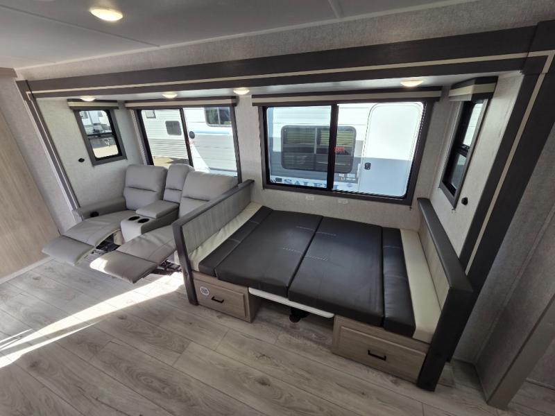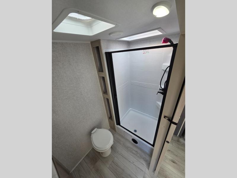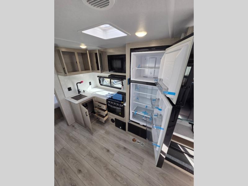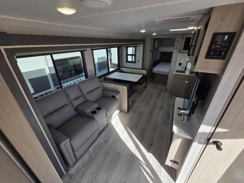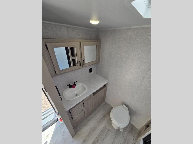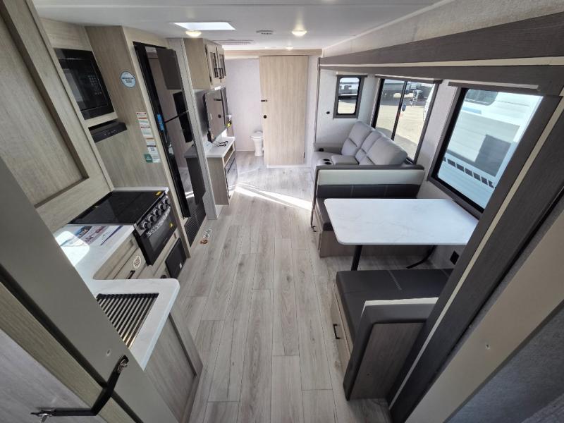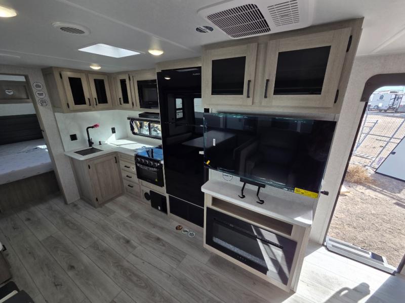 When you are wanting a little more interior space in your next travel trailer, take a look inside! This large slide out widens the center so you can easily make meals using full amenities without having to move for someone walking from the front private bedroom to the rear spacious bathroom. There is a king-size bed with storage on both sides, underneath and above, plus a space saving sliding door. The booth dinette and jiffy sofa offer comfortable seating as well as extra sleeping space for overnight guests. The fireplace is just a nice feature to enjoy, and the large pantry with washer/dryer prep gives you the option to make laundry day easier!