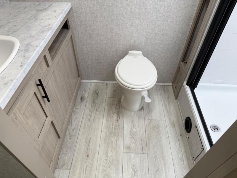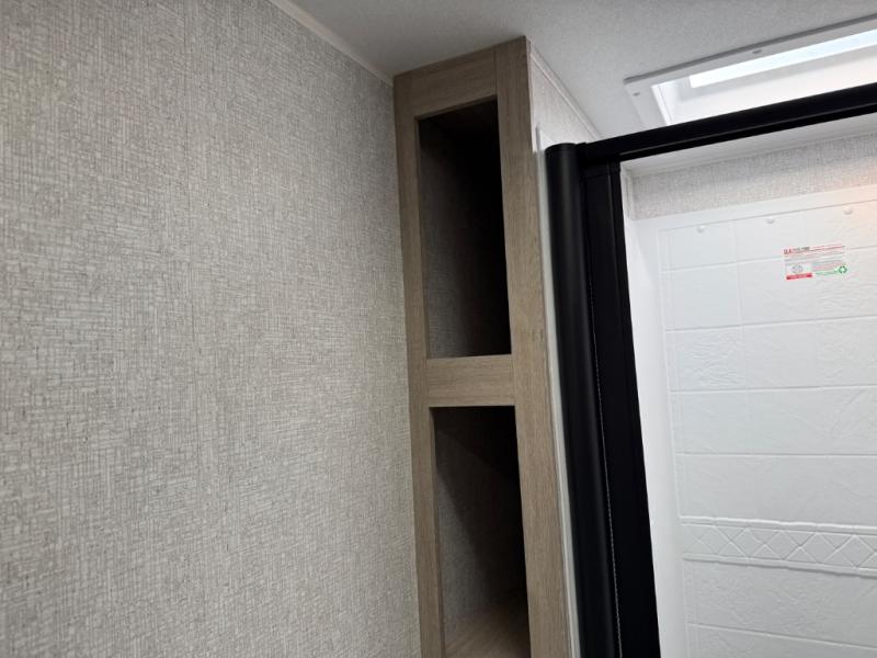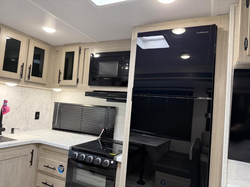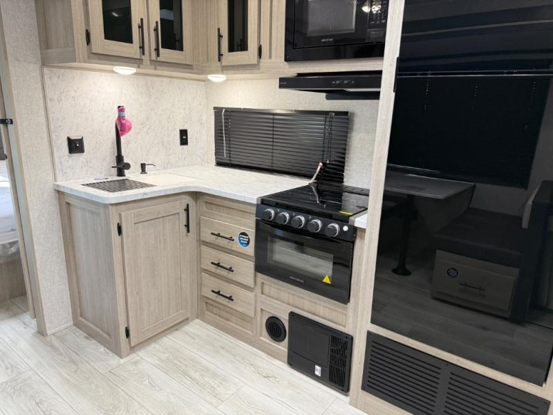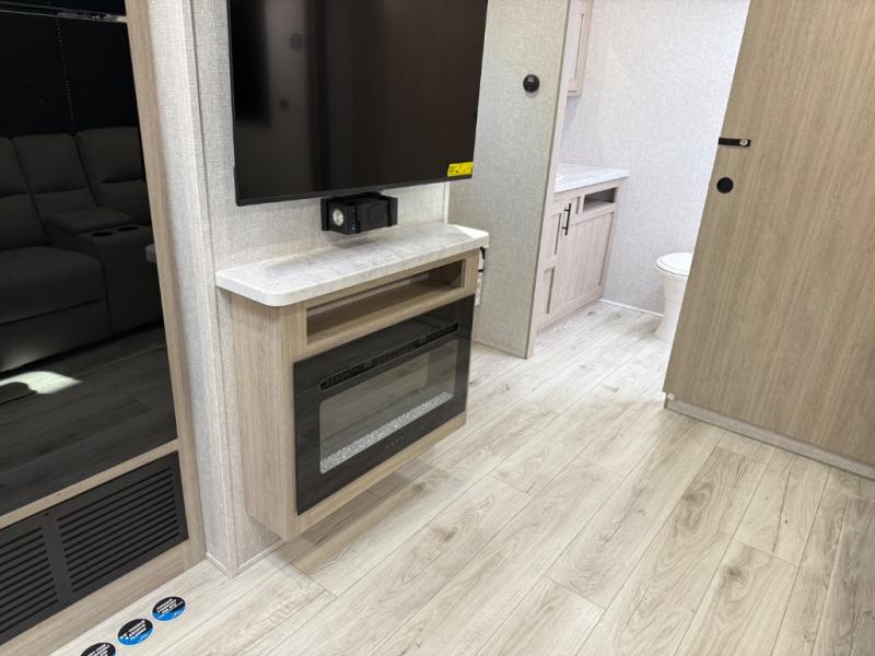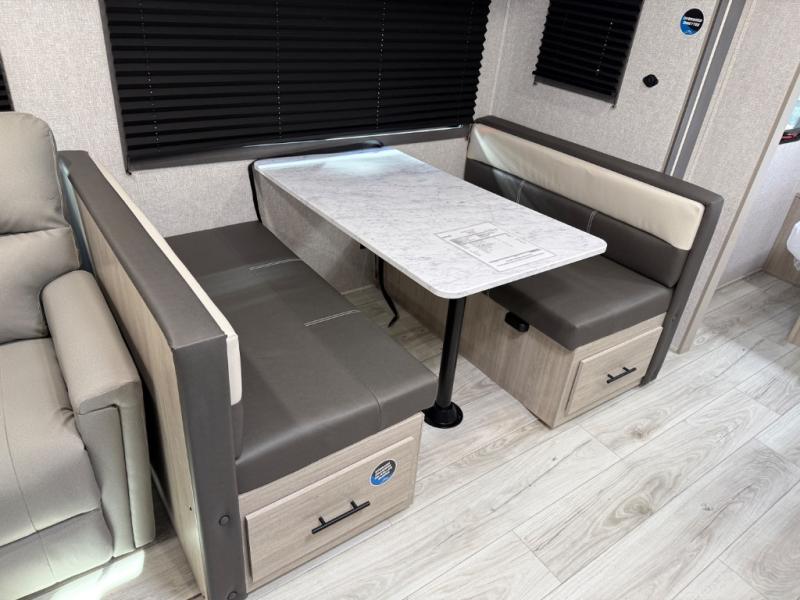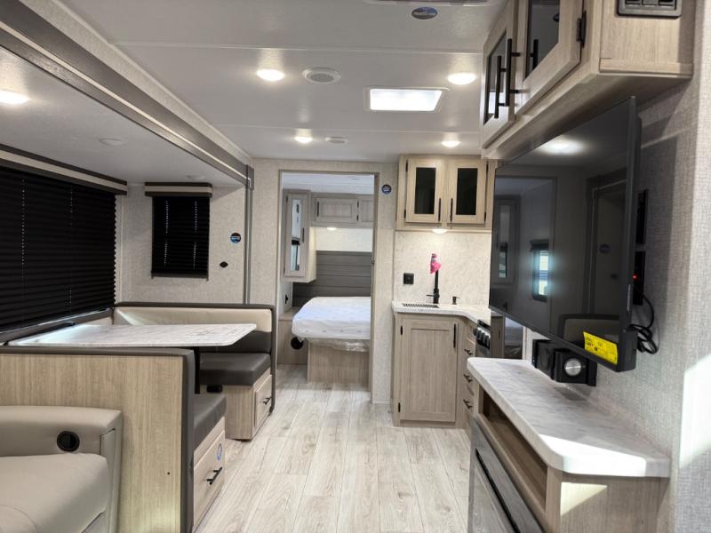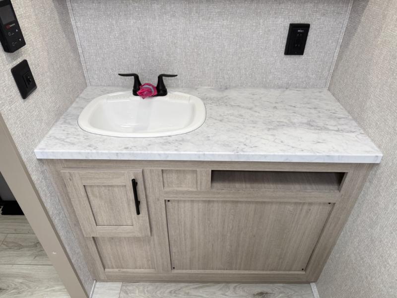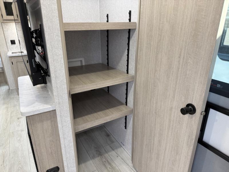 When you are wanting a little more interior space in your next travel trailer, take a look inside! This large slide out widens the center so you can easily make meals using full amenities without having to move for someone walking from the front private bedroom to the rear spacious bathroom. There is a king-size bed with storage on both sides, underneath and above, plus a space saving sliding door. The booth dinette and jiffy sofa offer comfortable seating as well as extra sleeping space for overnight guests. The fireplace is just a nice feature to enjoy, and the large pantry with washer/dryer prep gives you the option to make laundry day easier!