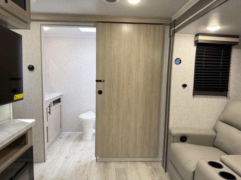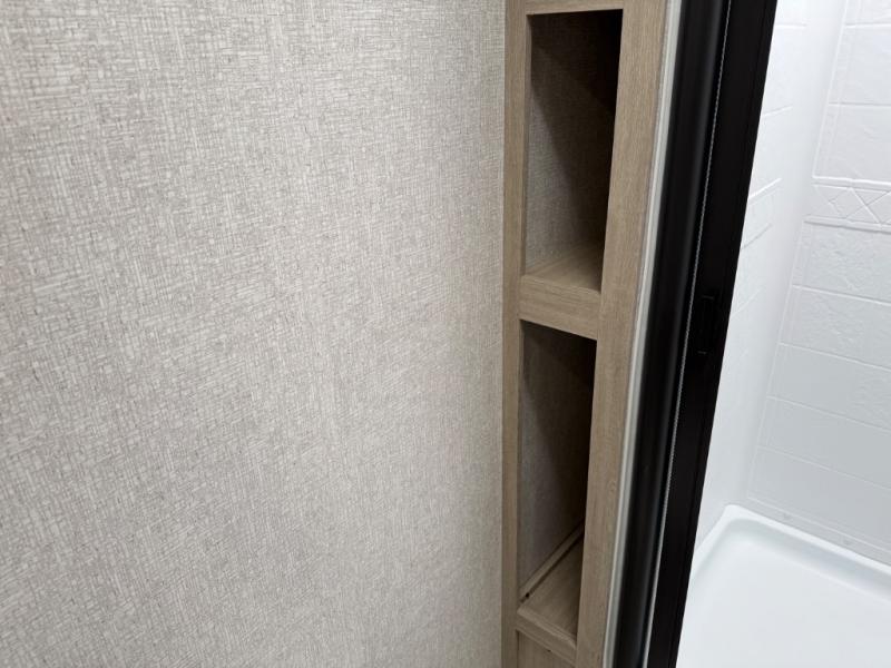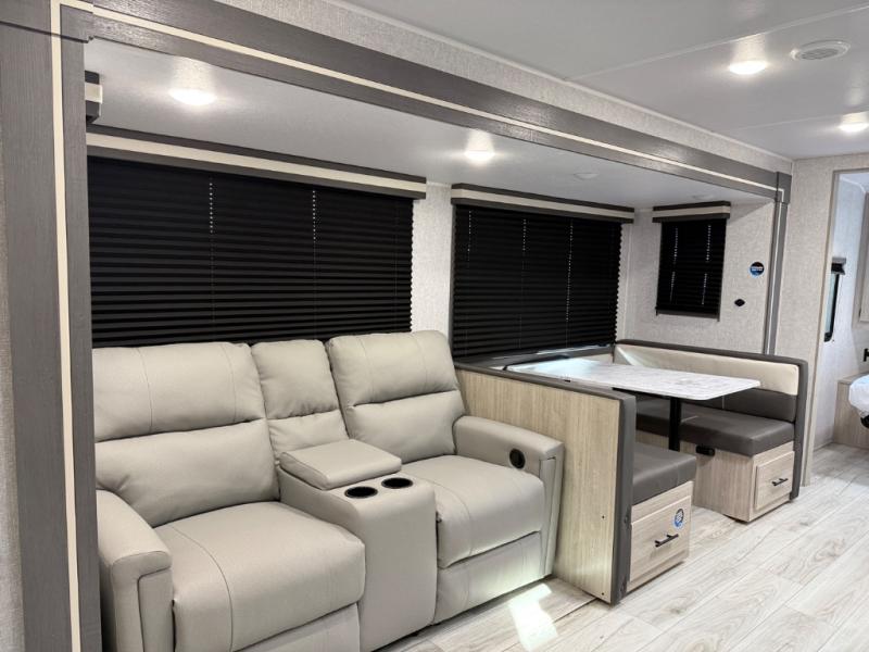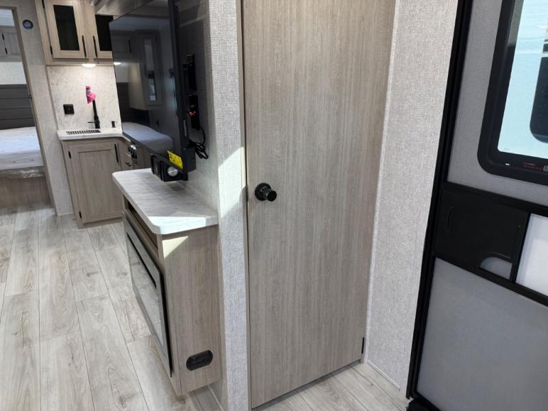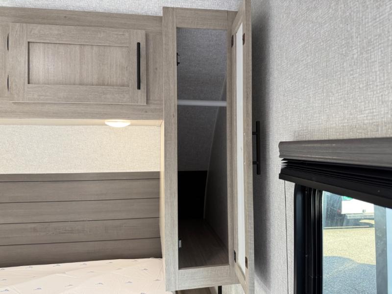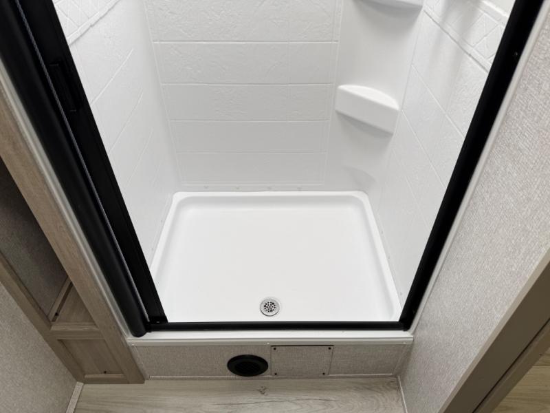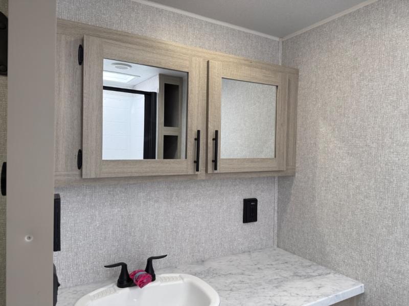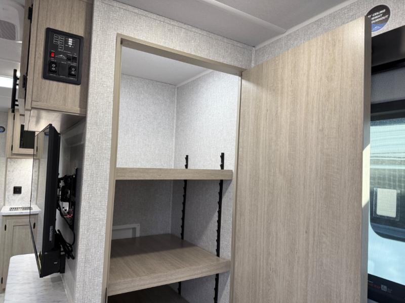 When you are wanting a little more interior space in your next travel trailer, take a look inside! This large slide out widens the center so you can easily make meals using full amenities without having to move for someone walking from the front private bedroom to the rear spacious bathroom. There is a king-size bed with storage on both sides, underneath and above, plus a space saving sliding door. The booth dinette and jiffy sofa offer comfortable seating as well as extra sleeping space for overnight guests. The fireplace is just a nice feature to enjoy, and the large pantry with washer/dryer prep gives you the option to make laundry day easier!