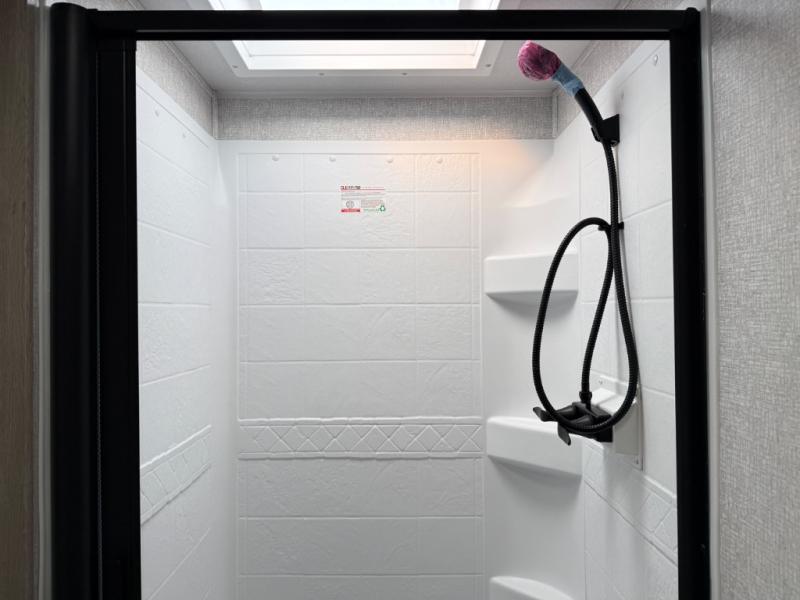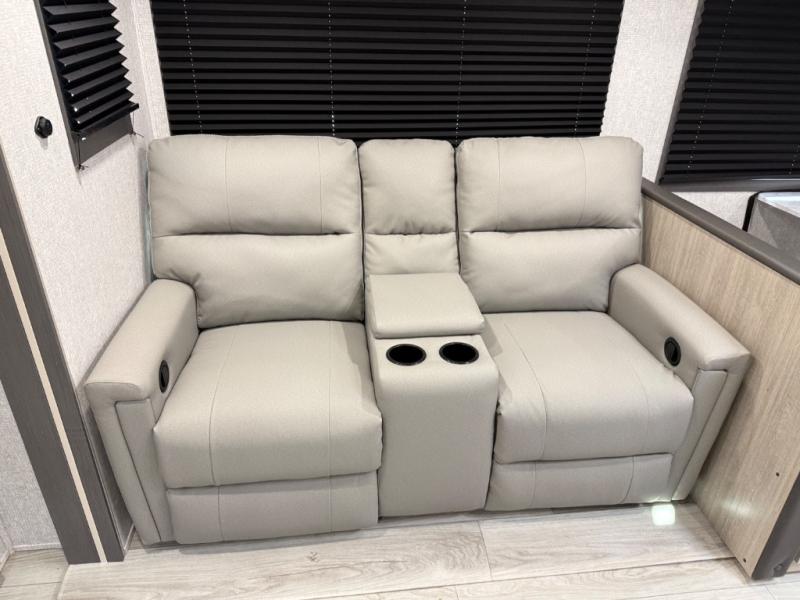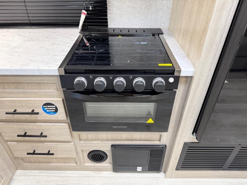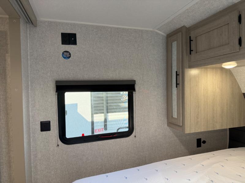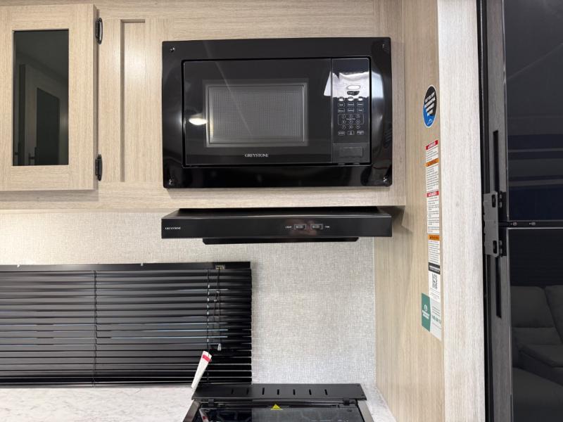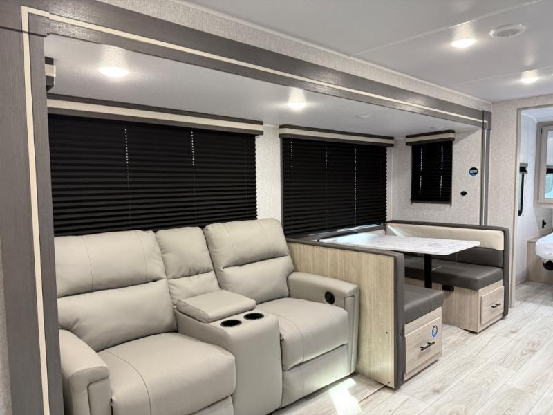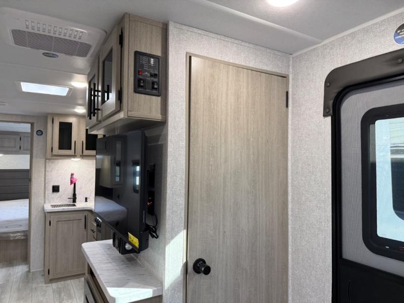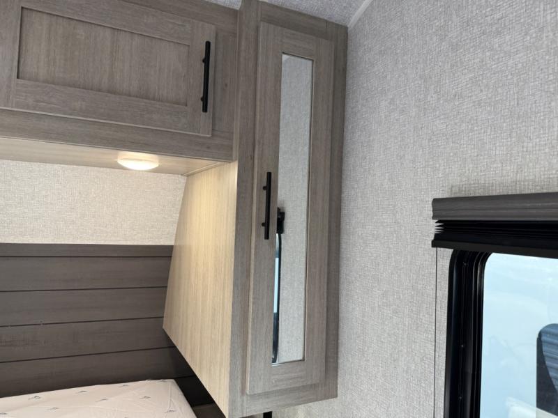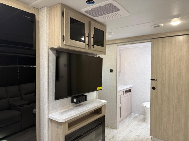 When you are wanting a little more interior space in your next travel trailer, take a look inside! This large slide out widens the center so you can easily make meals using full amenities without having to move for someone walking from the front private bedroom to the rear spacious bathroom. There is a king-size bed with storage on both sides, underneath and above, plus a space saving sliding door. The booth dinette and jiffy sofa offer comfortable seating as well as extra sleeping space for overnight guests. The fireplace is just a nice feature to enjoy, and the large pantry with washer/dryer prep gives you the option to make laundry day easier!