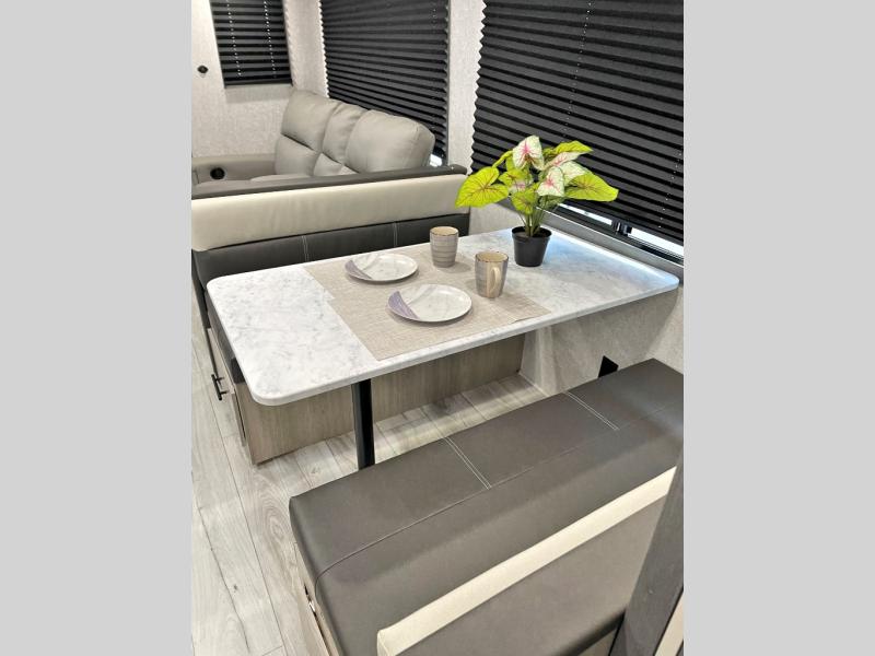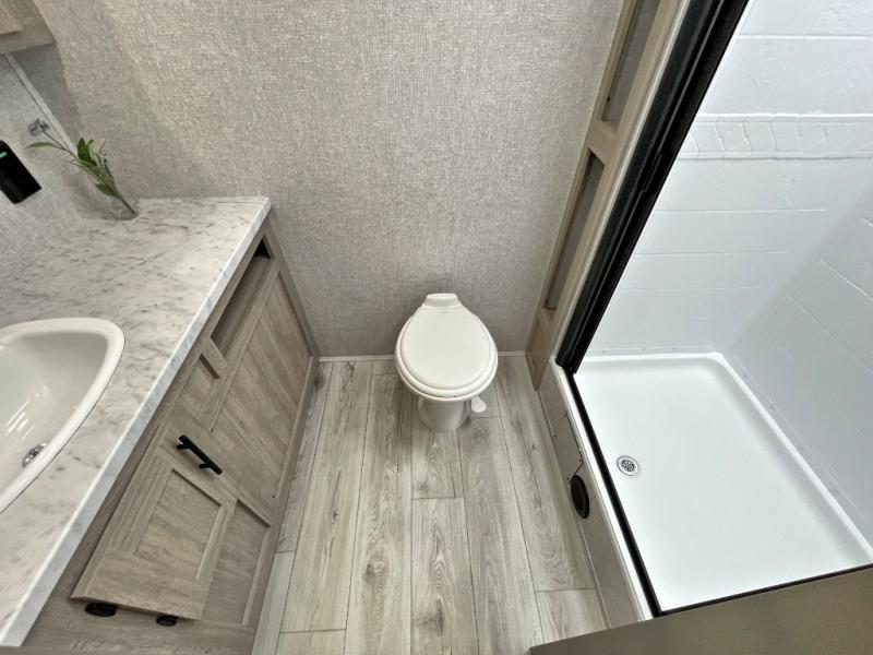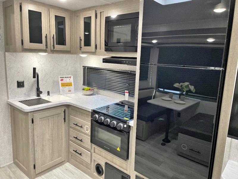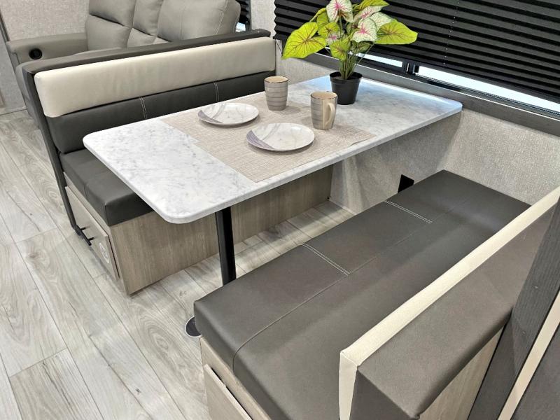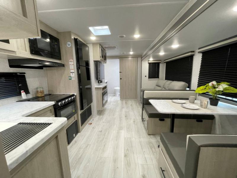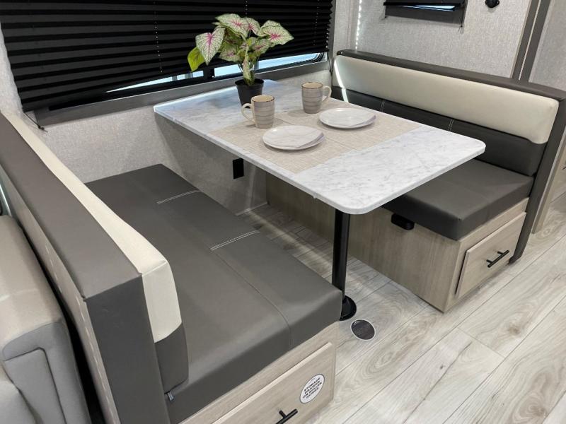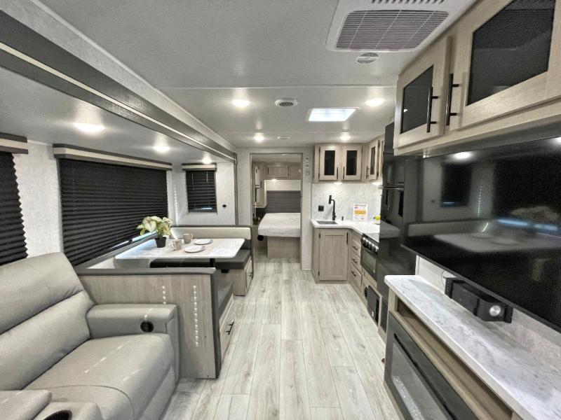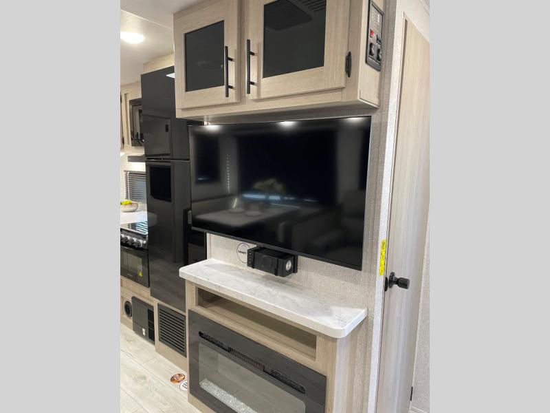 When you are wanting a little more interior space in your next travel trailer, take a look inside! This large slide out widens the center so you can easily make meals using full amenities without having to move for someone walking from the front private bedroom to the rear spacious bathroom. There is a king-size bed with storage on both sides, underneath and above, plus a space saving sliding door. The booth dinette and jiffy sofa offer comfortable seating as well as extra sleeping space for overnight guests. The fireplace is just a nice feature to enjoy, and the large pantry with washer/dryer prep gives you the option to make laundry day easier!