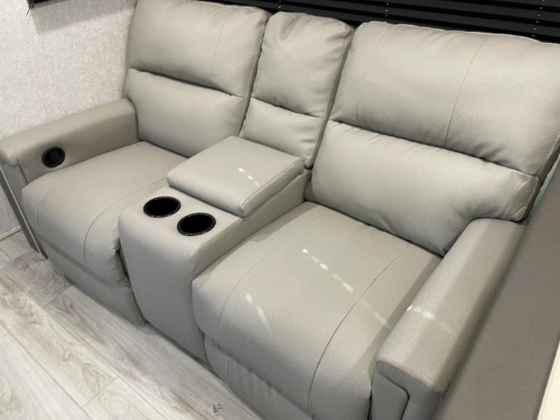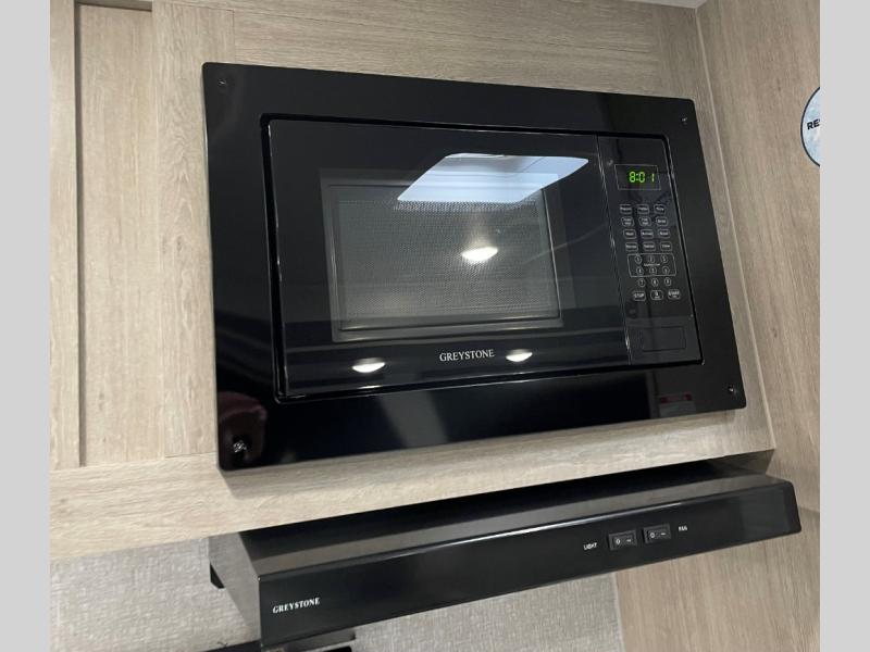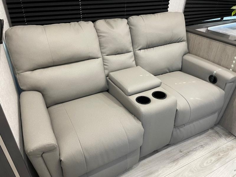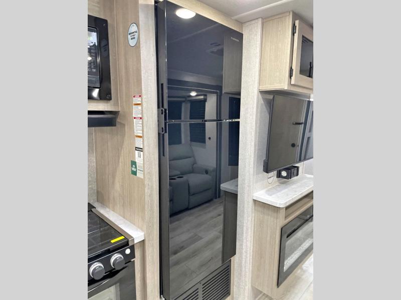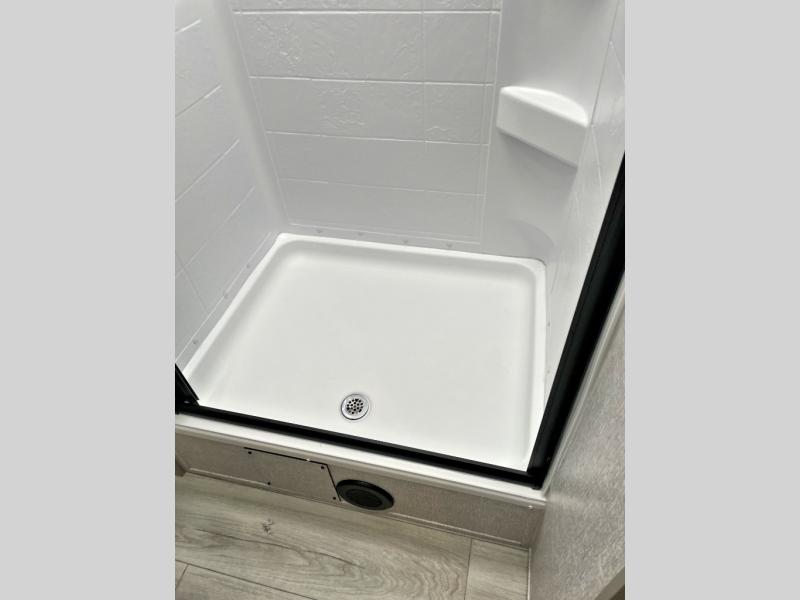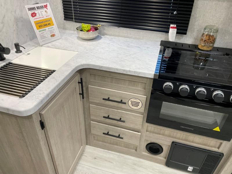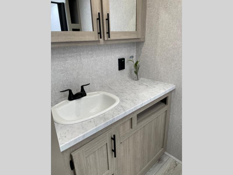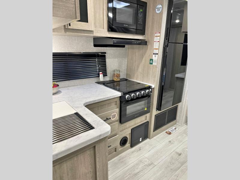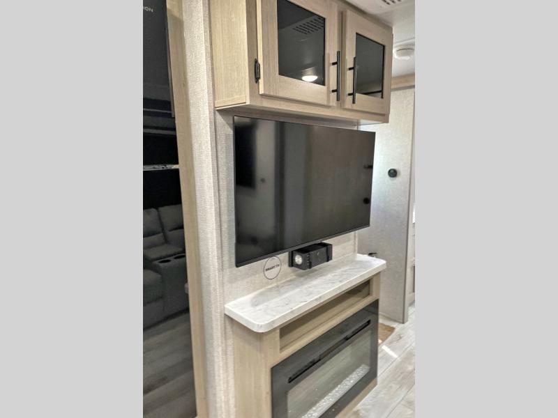 When you are wanting a little more interior space in your next travel trailer, take a look inside! This large slide out widens the center so you can easily make meals using full amenities without having to move for someone walking from the front private bedroom to the rear spacious bathroom. There is a king-size bed with storage on both sides, underneath and above, plus a space saving sliding door. The booth dinette and jiffy sofa offer comfortable seating as well as extra sleeping space for overnight guests. The fireplace is just a nice feature to enjoy, and the large pantry with washer/dryer prep gives you the option to make laundry day easier!