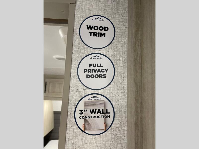 Each Della Terra travel trailer by EAST TO WEST is constructed with an enclosed and heated underbelly and enclosed holding tanks for added protection against the elements. There is also a power tongue jack with an LED light for easy set up and a power awning with LED lights you can rest under after you've unpacked. The Explore Comfort Package comes seamless pressed countertops, kitchen backsplash, window valance package with black night shades, and many more comforts. You will also appreciate the Adventure Outdoor Package with backup camera prep and solar prep, a tankless water heater, an RV grill quick disconnect, and a universal docking station with battery disconnect.
