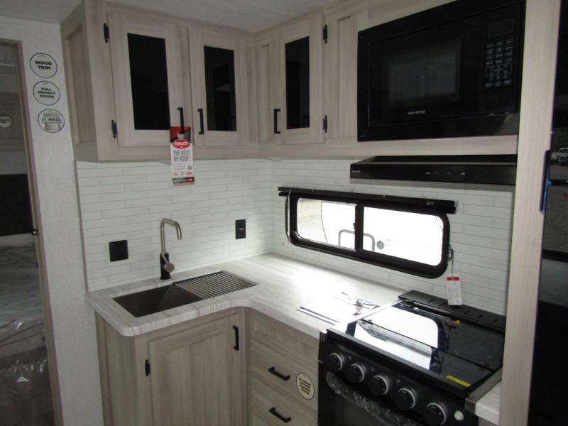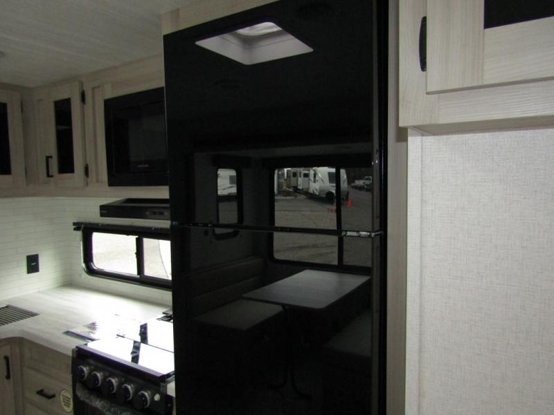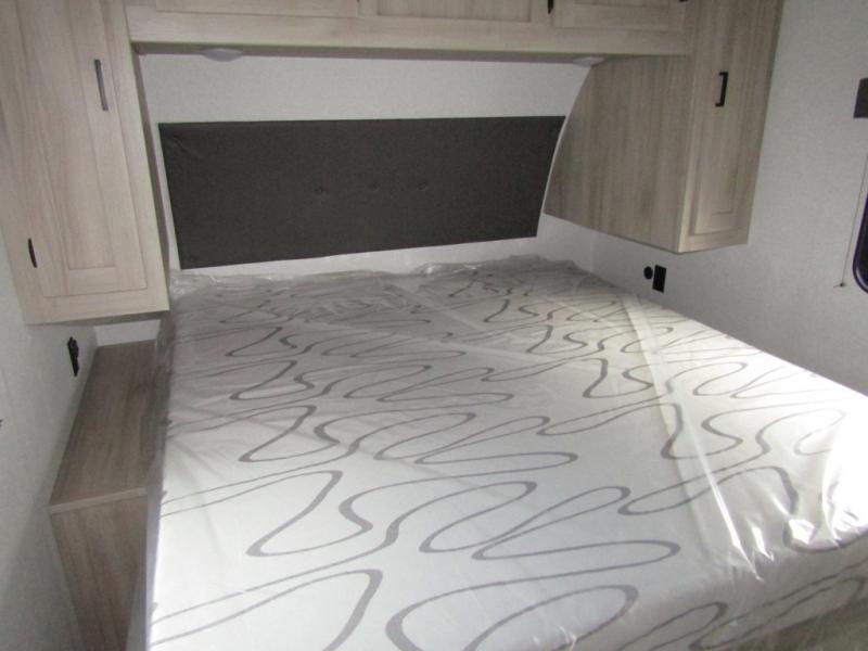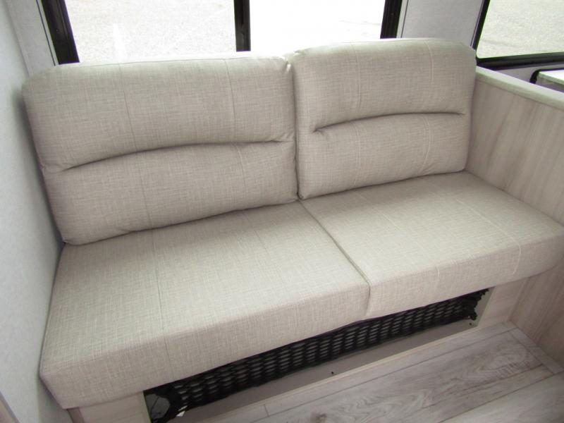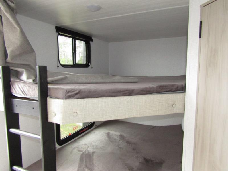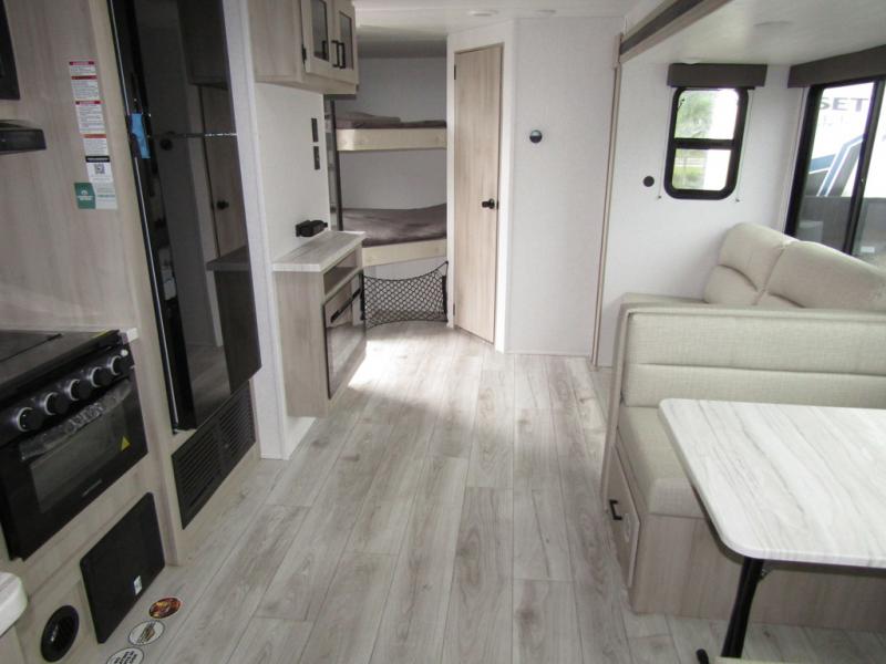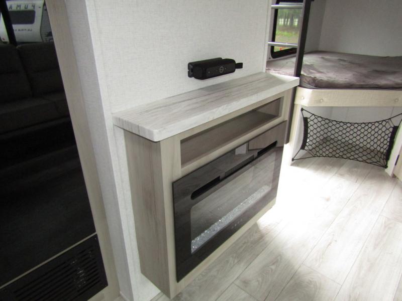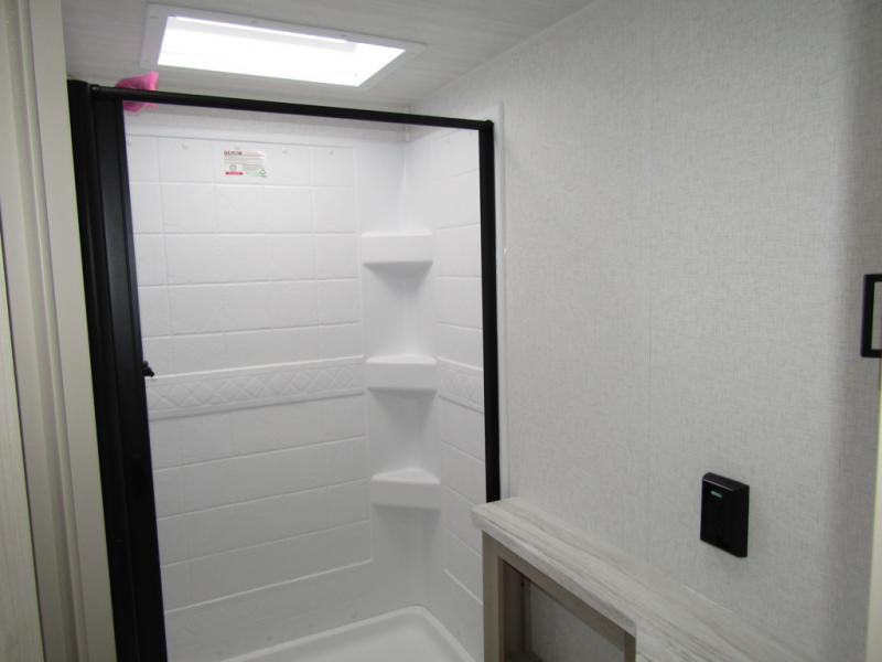 Pack up the whole gang since this unit features sleeping for eight to ten! As you enter you will find easy access to the rear corner bath including a 30" x 36" shower, toilet, and vanity with a sink, plus medicine cabinet just steps away. The slide creates an open and spacious feel for relaxing and dining inside. Here you will find a jiffy sofa and booth dinette with both featuring underneath storage. You will sleep like a king in the front private bedroom with a king bed and a space saving sliding door. Your family and or friends will love sleeping on the double-size bunks and furniture once easily setup for nighttime. This unit also features pass-through storage outside, more exterior storage beneath the double bed bunks, and an outside kitchen with a refrigerator and pull-out griddle.