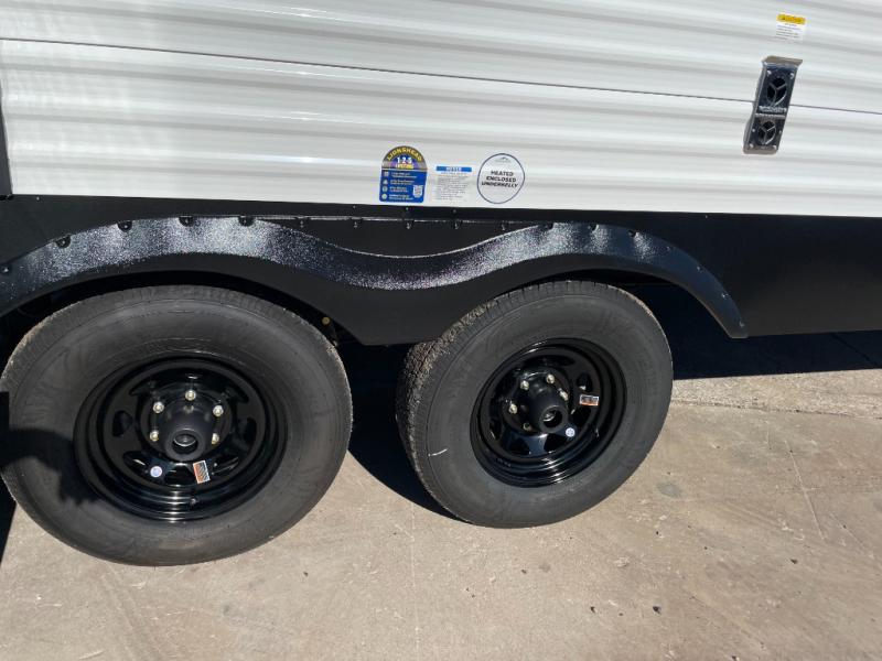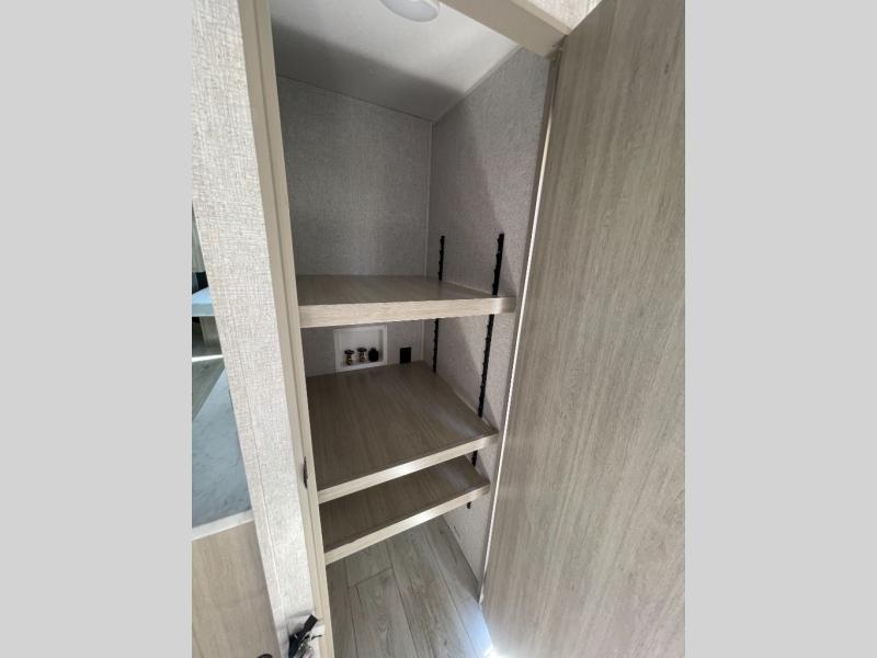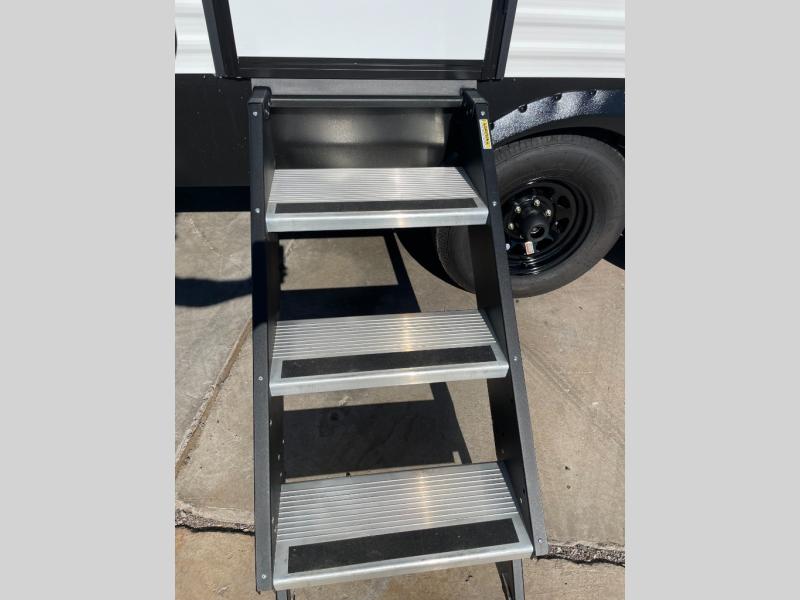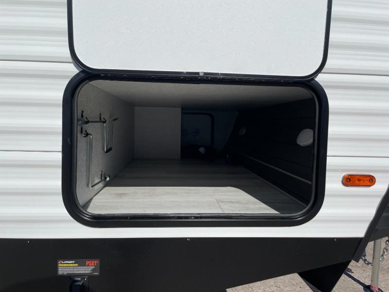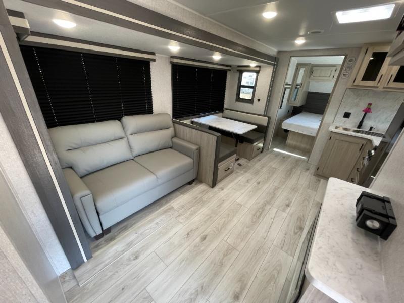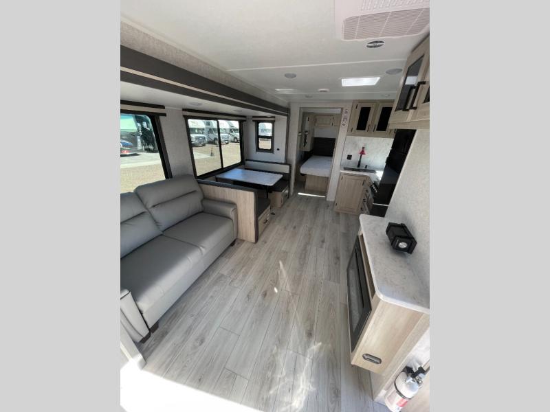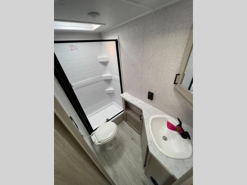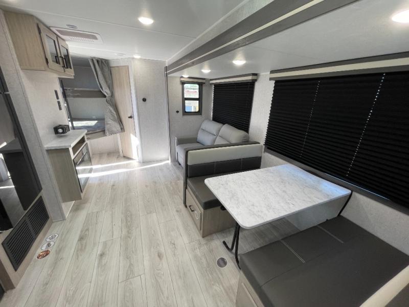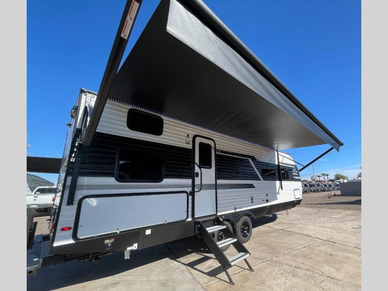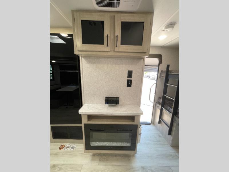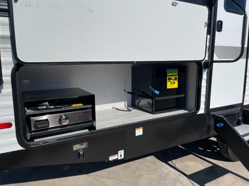 Pack up the whole gang since this unit features sleeping for eight to ten! As you enter you will find easy access to the rear corner bath including a 30" x 36" shower, toilet, and vanity with a sink, plus medicine cabinet just steps away. The slide creates an open and spacious feel for relaxing and dining inside. Here you will find a jiffy sofa and booth dinette with both featuring underneath storage. You will sleep like a king in the front private bedroom with a king bed and a space saving sliding door. Your family and or friends will love sleeping on the double-size bunks and furniture once easily setup for nighttime. This unit also features pass-through storage outside, more exterior storage beneath the double bed bunks, and an outside kitchen with a refrigerator and pull-out griddle.