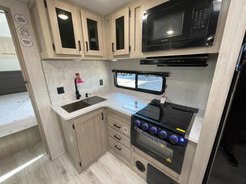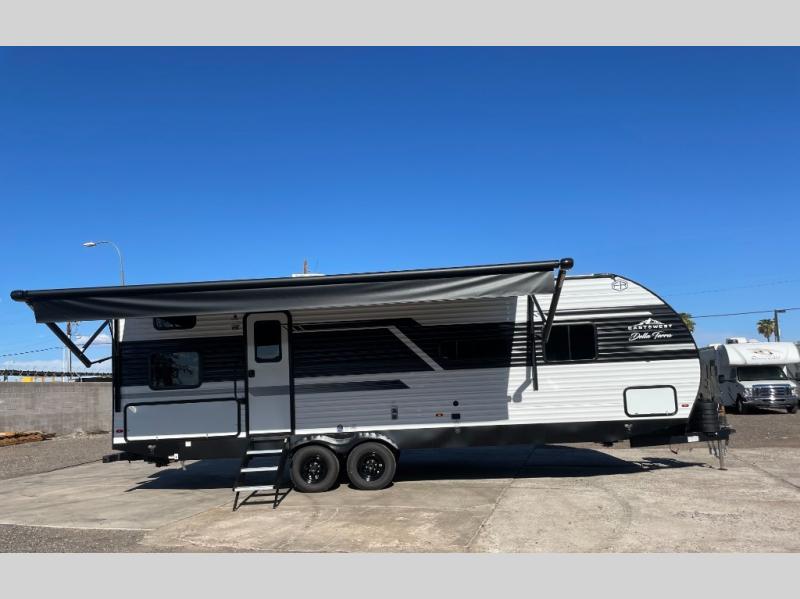Each Della Terra travel trailer by EAST TO WEST is constructed with an enclosed and heated underbelly and enclosed holding tanks for added protection against the elements. There is also a power tongue jack with an LED light for easy set up and a power awning with LED lights you can rest under after you've unpacked. The Explore Comfort Package comes seamless pressed countertops, kitchen backsplash, window valance package with black night shades, and many more comforts. You will also appreciate the Adventure Outdoor Package with backup camera prep and solar prep, a tankless water heater, an RV grill quick disconnect, and a universal docking station with battery disconnect.