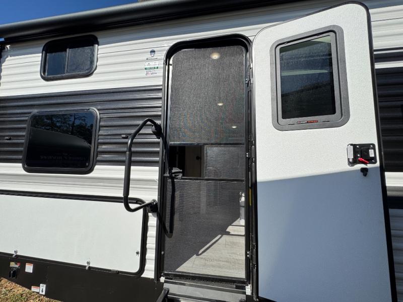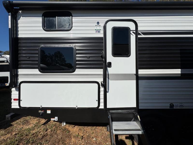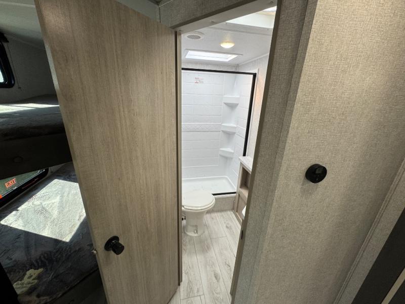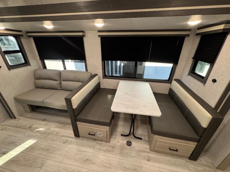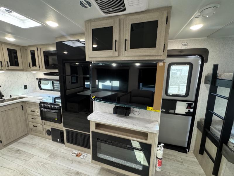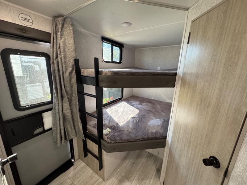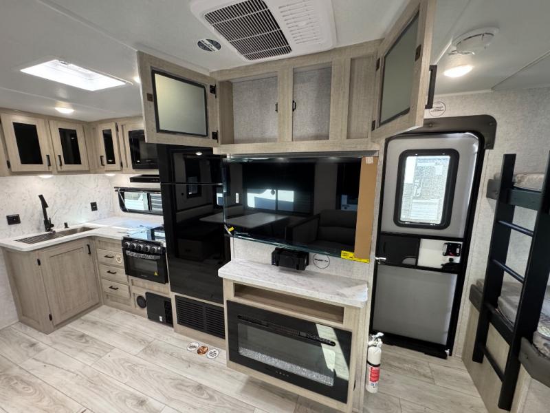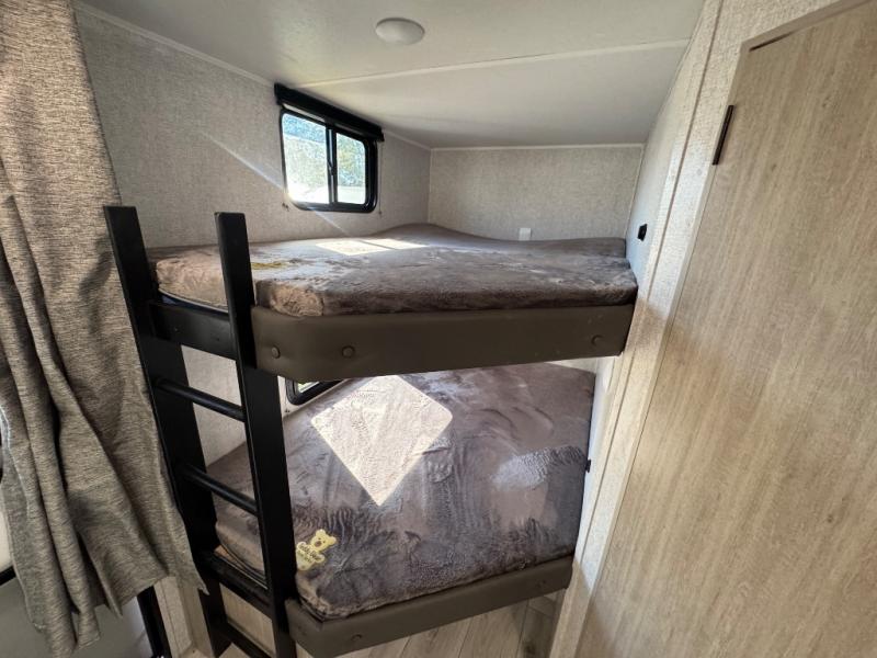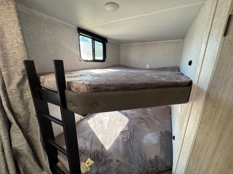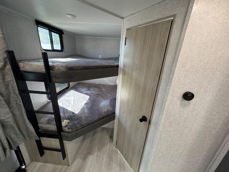 Pack up the whole gang since this unit features sleeping for eight to ten! As you enter you will find easy access to the rear corner bath including a 30" x 36" shower, toilet, and vanity with a sink, plus medicine cabinet just steps away. The slide creates an open and spacious feel for relaxing and dining inside. Here you will find a jiffy sofa and booth dinette with both featuring underneath storage. You will sleep like a king in the front private bedroom with a king bed and a space saving sliding door. Your family and or friends will love sleeping on the double-size bunks and furniture once easily setup for nighttime. This unit also features pass-through storage outside, more exterior storage beneath the double bed bunks, and an outside kitchen with a refrigerator and pull-out griddle.