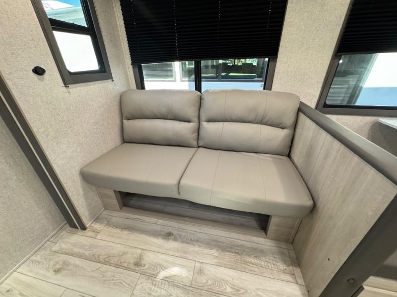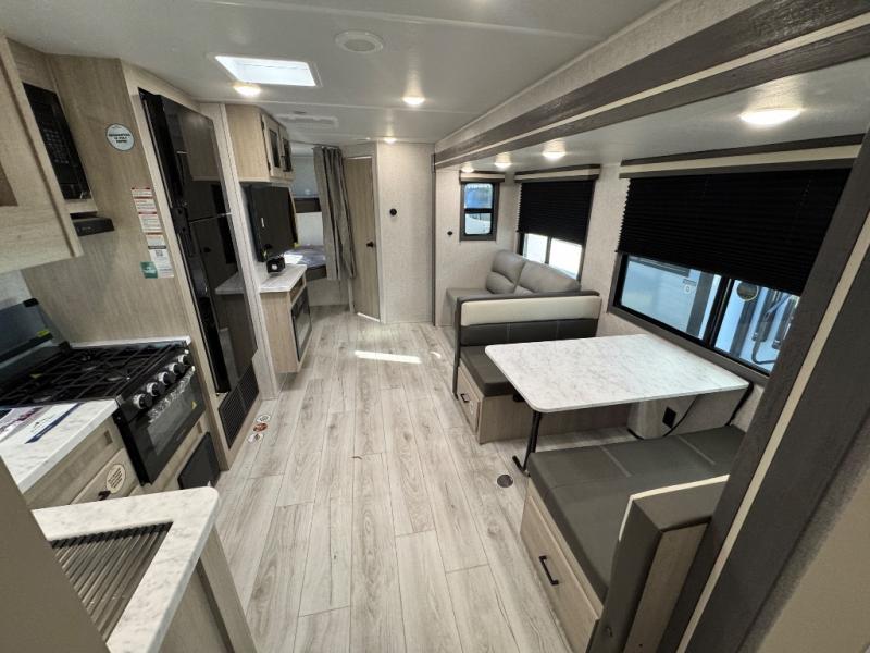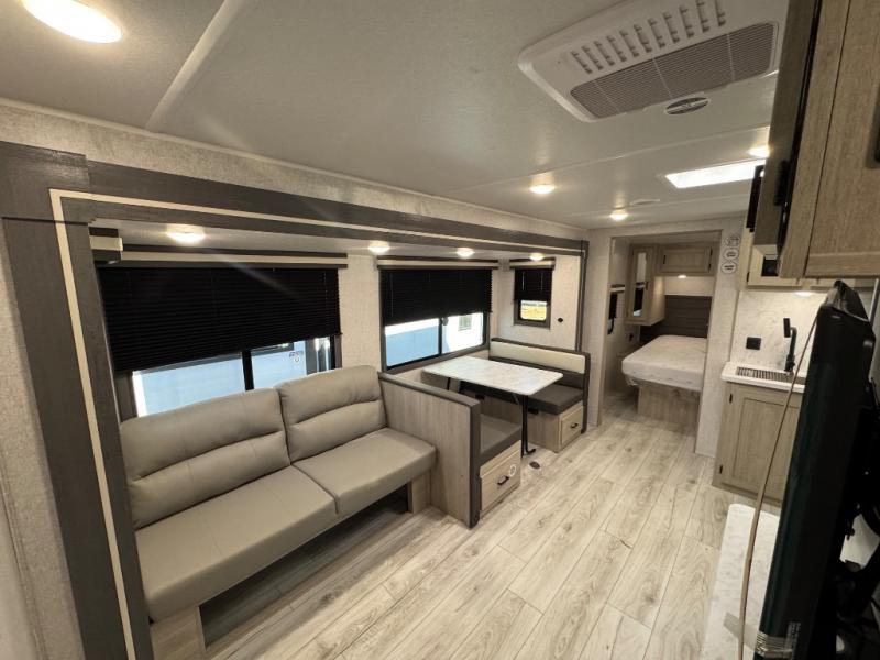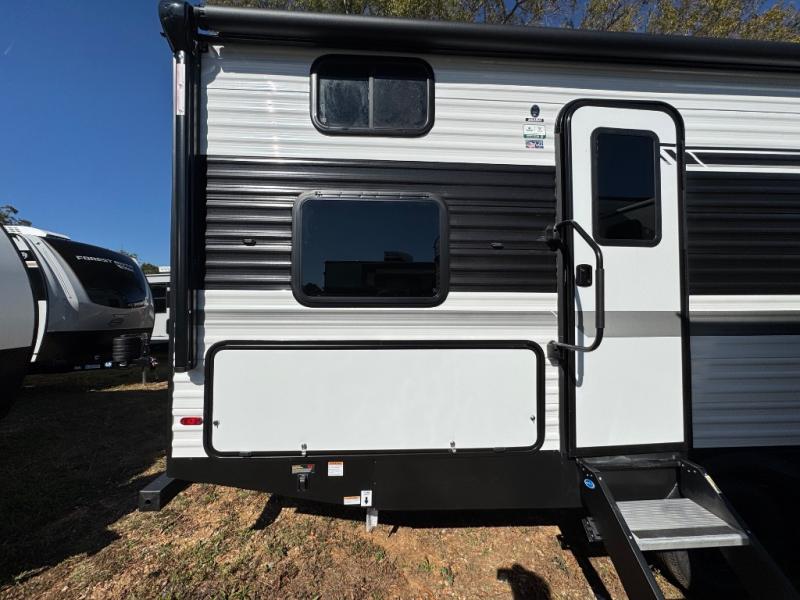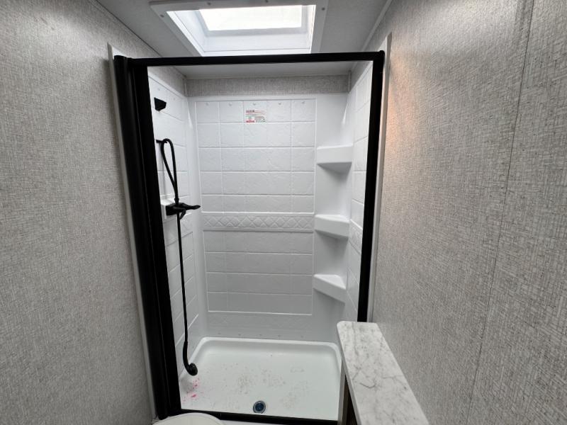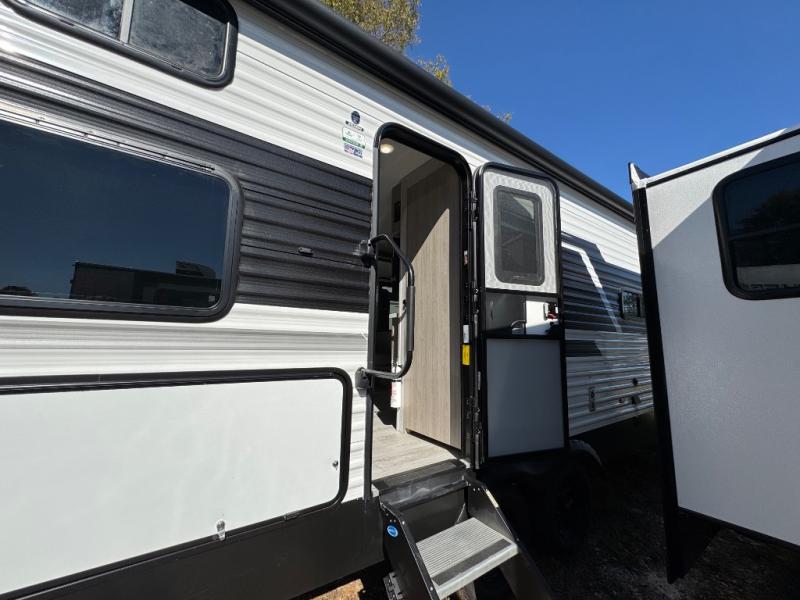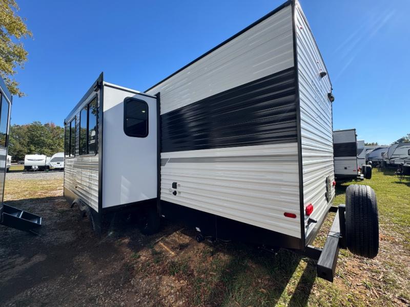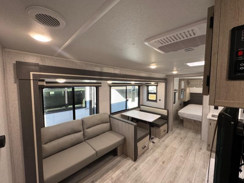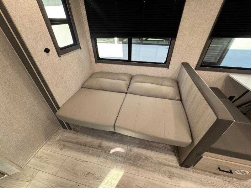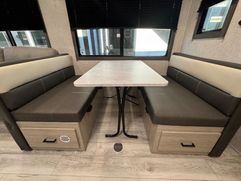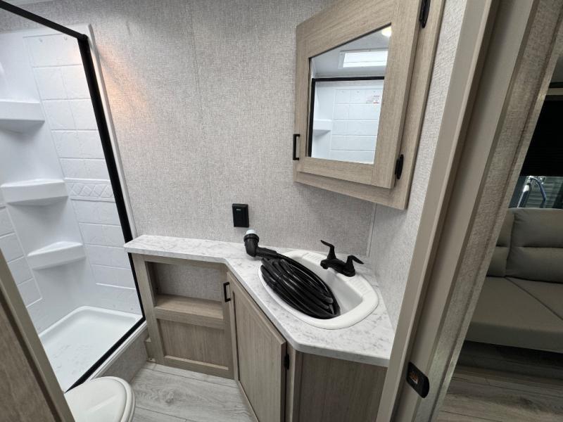 Pack up the whole gang since this unit features sleeping for eight to ten! As you enter you will find easy access to the rear corner bath including a 30" x 36" shower, toilet, and vanity with a sink, plus medicine cabinet just steps away. The slide creates an open and spacious feel for relaxing and dining inside. Here you will find a jiffy sofa and booth dinette with both featuring underneath storage. You will sleep like a king in the front private bedroom with a king bed and a space saving sliding door. Your family and or friends will love sleeping on the double-size bunks and furniture once easily setup for nighttime. This unit also features pass-through storage outside, more exterior storage beneath the double bed bunks, and an outside kitchen with a refrigerator and pull-out griddle.