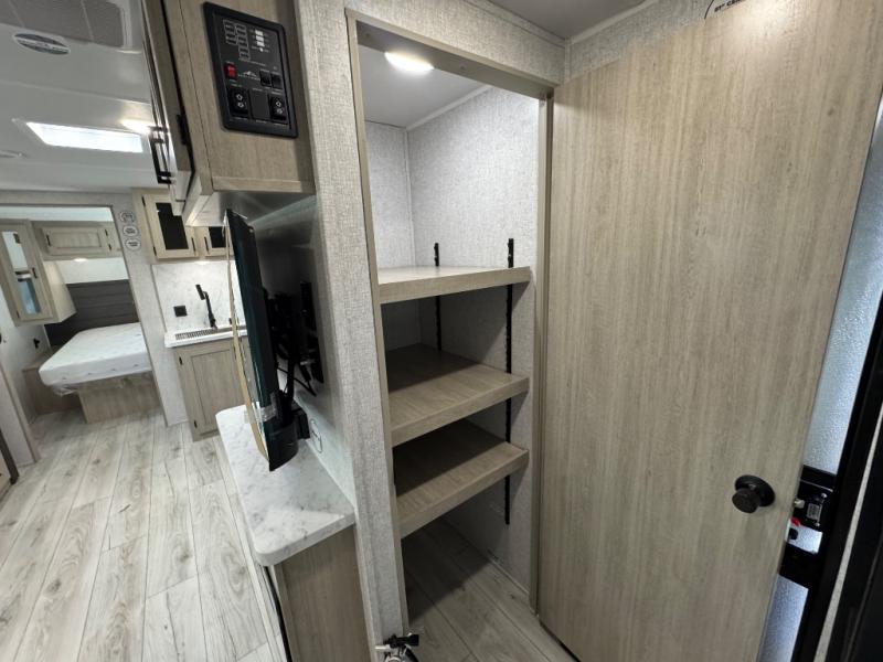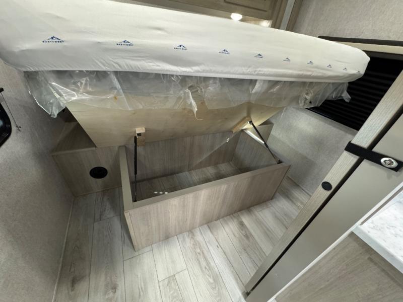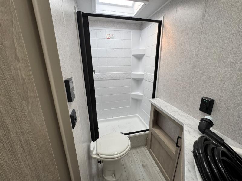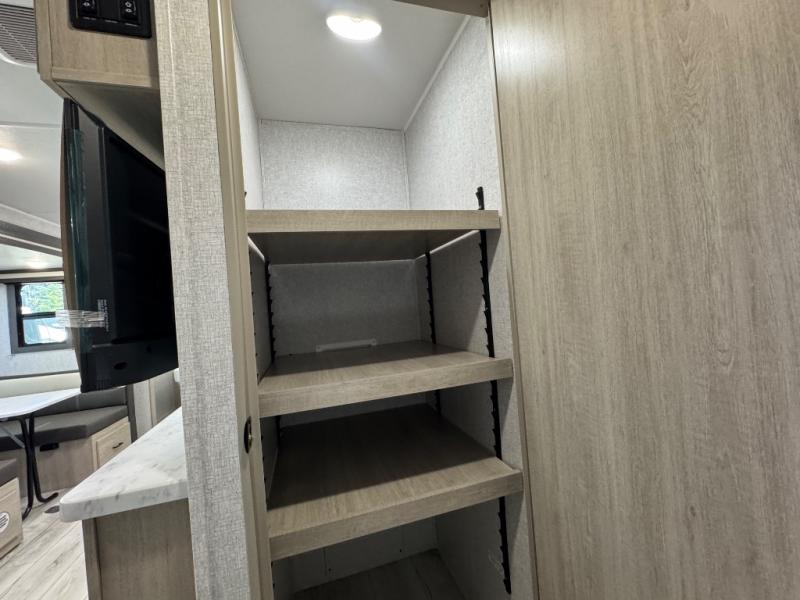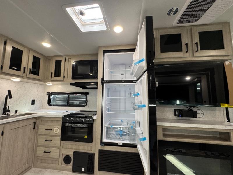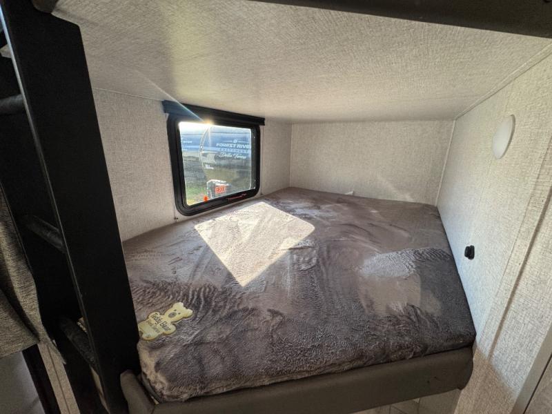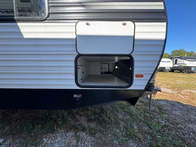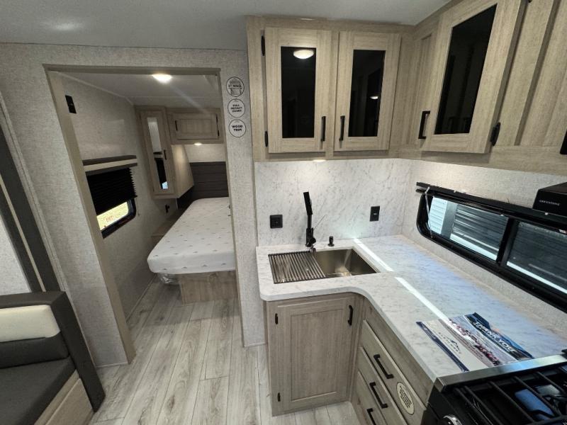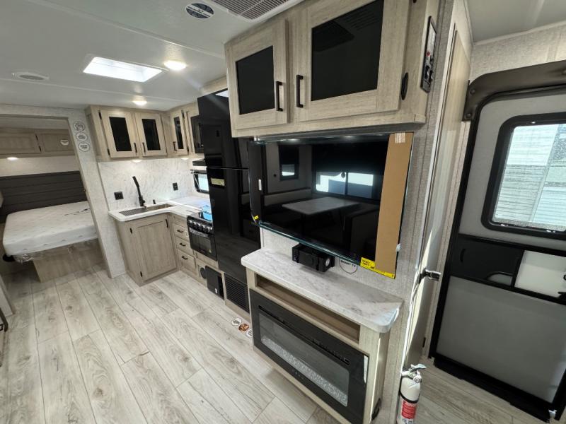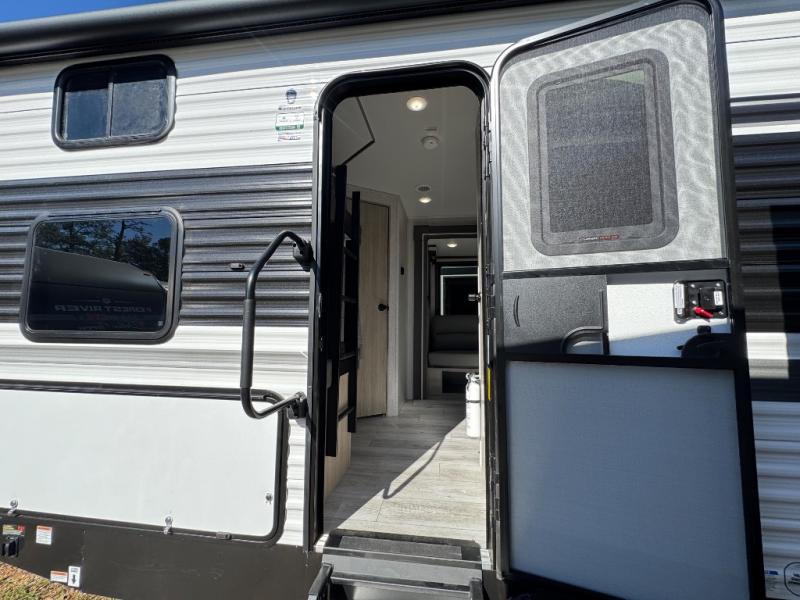 Pack up the whole gang since this unit features sleeping for eight to ten! As you enter you will find easy access to the rear corner bath including a 30" x 36" shower, toilet, and vanity with a sink, plus medicine cabinet just steps away. The slide creates an open and spacious feel for relaxing and dining inside. Here you will find a jiffy sofa and booth dinette with both featuring underneath storage. You will sleep like a king in the front private bedroom with a king bed and a space saving sliding door. Your family and or friends will love sleeping on the double-size bunks and furniture once easily setup for nighttime. This unit also features pass-through storage outside, more exterior storage beneath the double bed bunks, and an outside kitchen with a refrigerator and pull-out griddle.