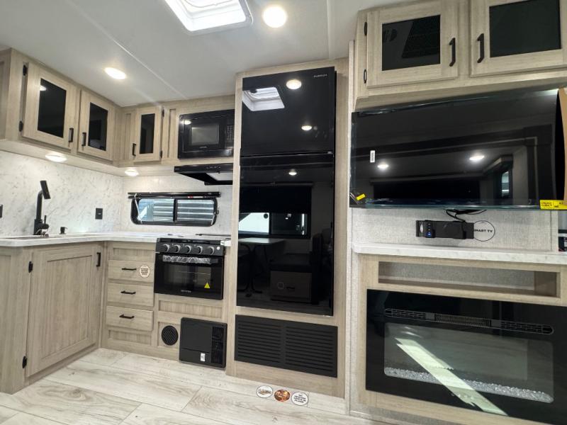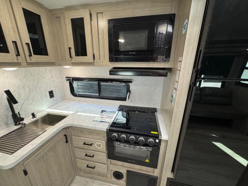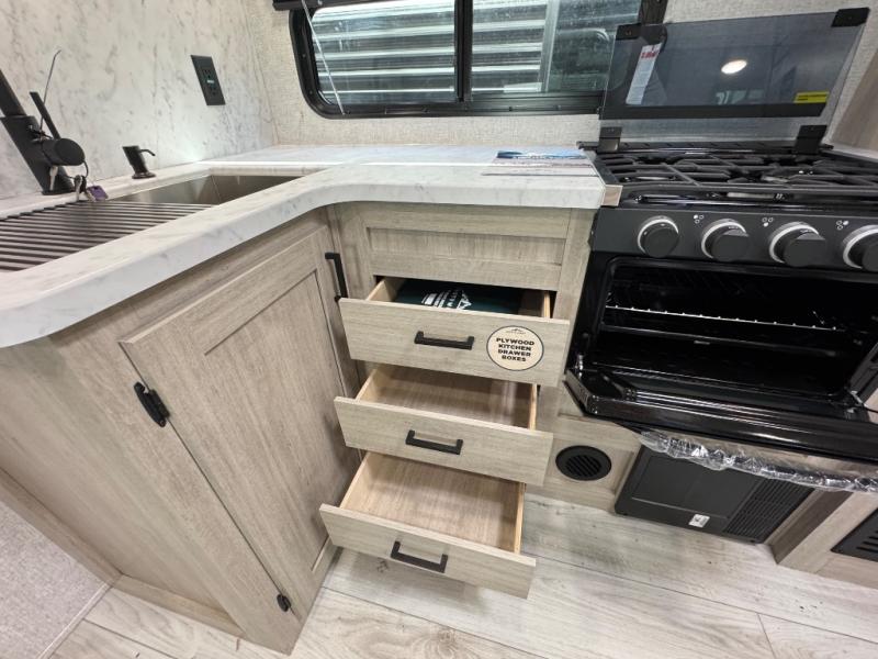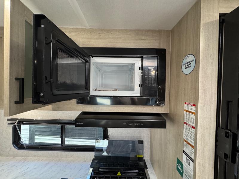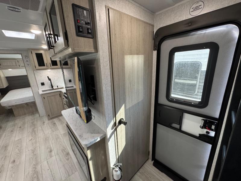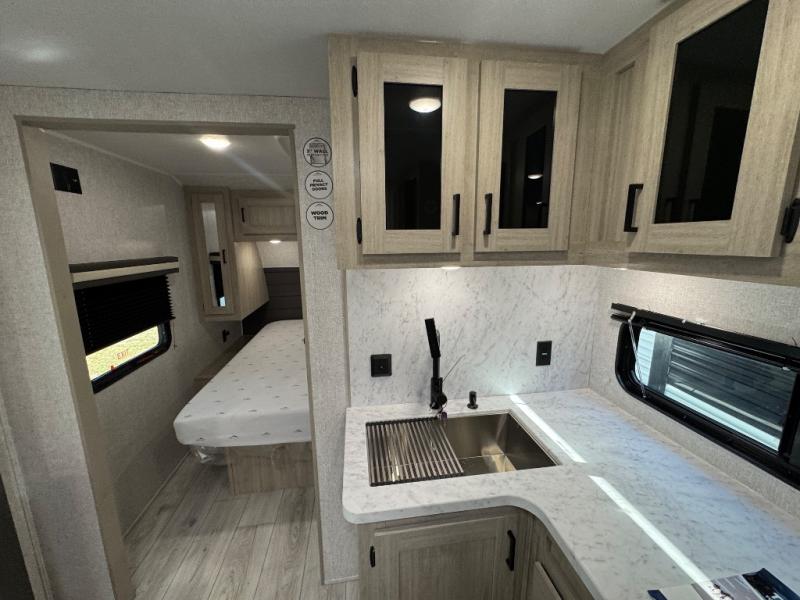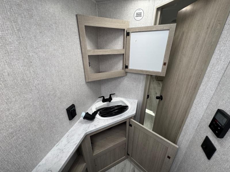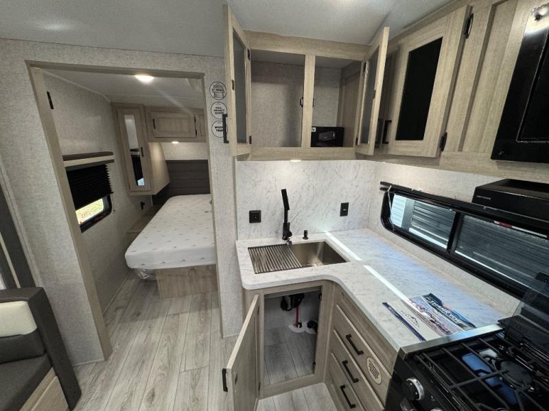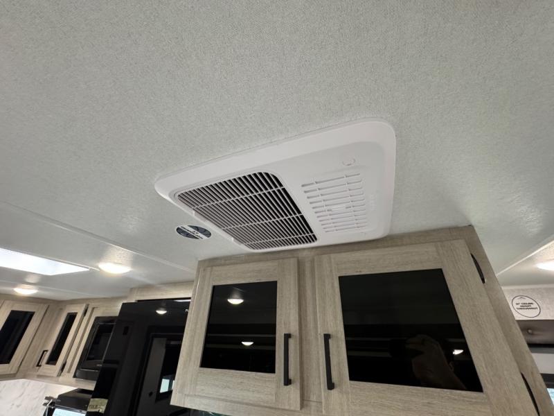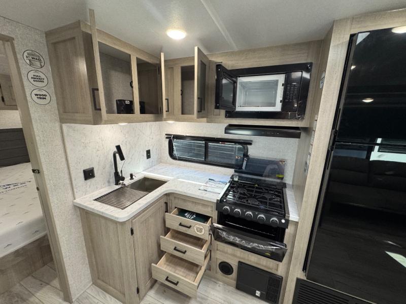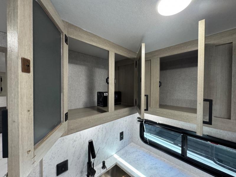 Pack up the whole gang since this unit features sleeping for eight to ten! As you enter you will find easy access to the rear corner bath including a 30" x 36" shower, toilet, and vanity with a sink, plus medicine cabinet just steps away. The slide creates an open and spacious feel for relaxing and dining inside. Here you will find a jiffy sofa and booth dinette with both featuring underneath storage. You will sleep like a king in the front private bedroom with a king bed and a space saving sliding door. Your family and or friends will love sleeping on the double-size bunks and furniture once easily setup for nighttime. This unit also features pass-through storage outside, more exterior storage beneath the double bed bunks, and an outside kitchen with a refrigerator and pull-out griddle.
