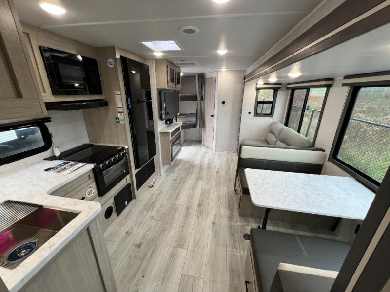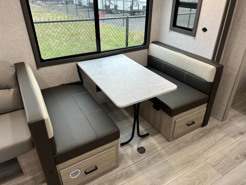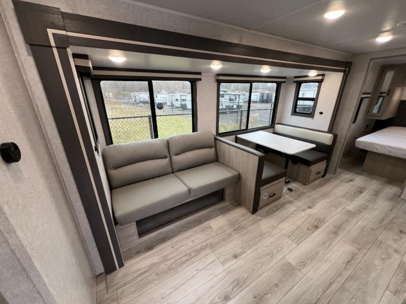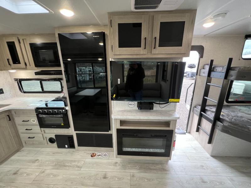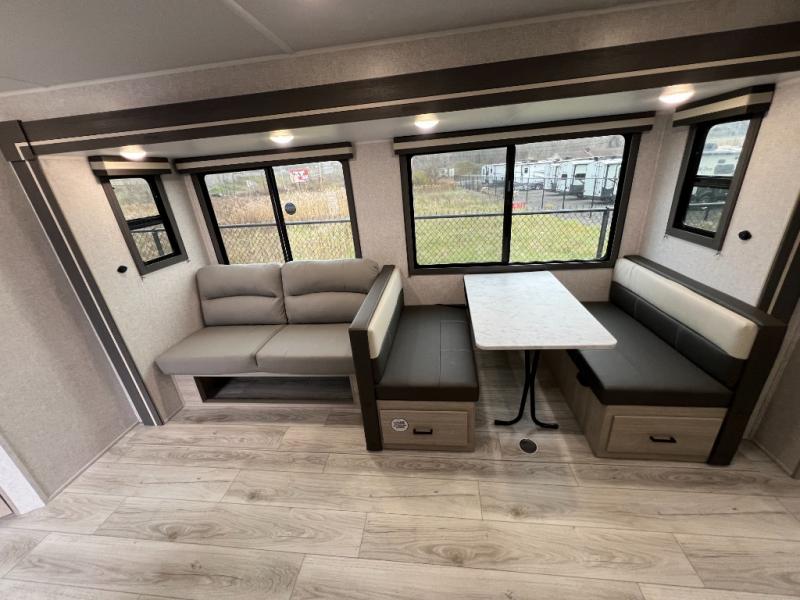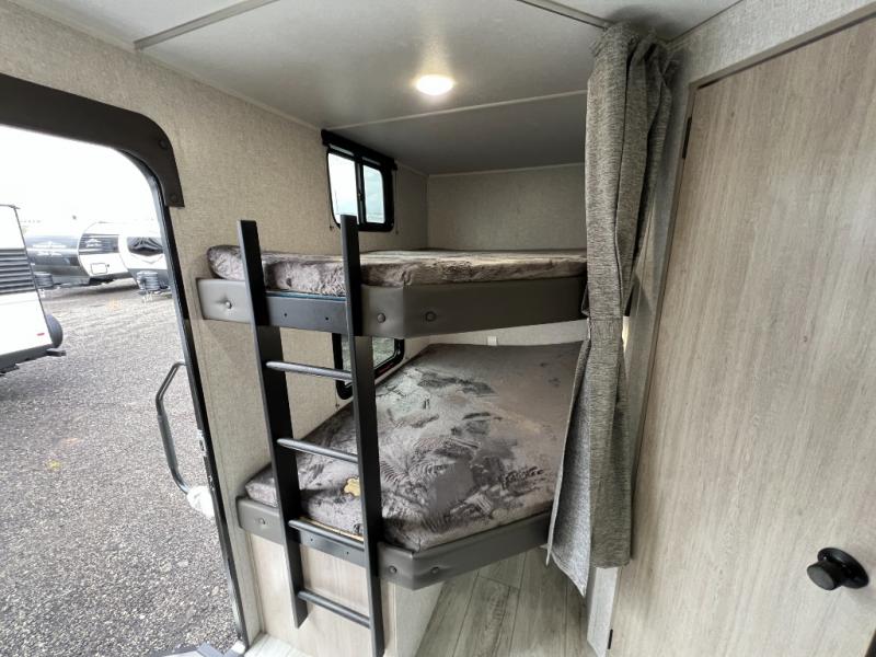 Pack up the whole gang since this unit features sleeping for eight to ten! As you enter you will find easy access to the rear corner bath including a 30" x 36" shower, toilet, and vanity with a sink, plus medicine cabinet just steps away. The slide creates an open and spacious feel for relaxing and dining inside. Here you will find a jiffy sofa and booth dinette with both featuring underneath storage. You will sleep like a king in the front private bedroom with a king bed and a space saving sliding door. Your family and or friends will love sleeping on the double-size bunks and furniture once easily setup for nighttime. This unit also features pass-through storage outside, more exterior storage beneath the double bed bunks, and an outside kitchen with a refrigerator and pull-out griddle.
