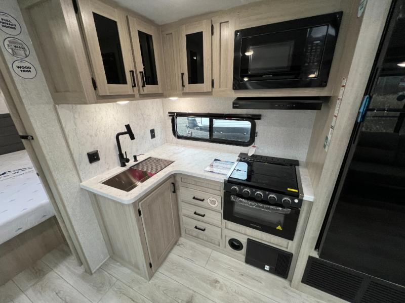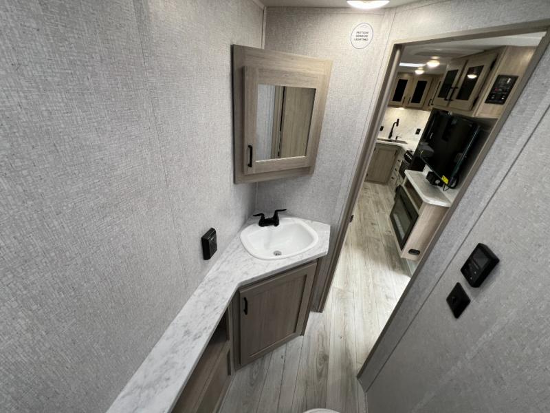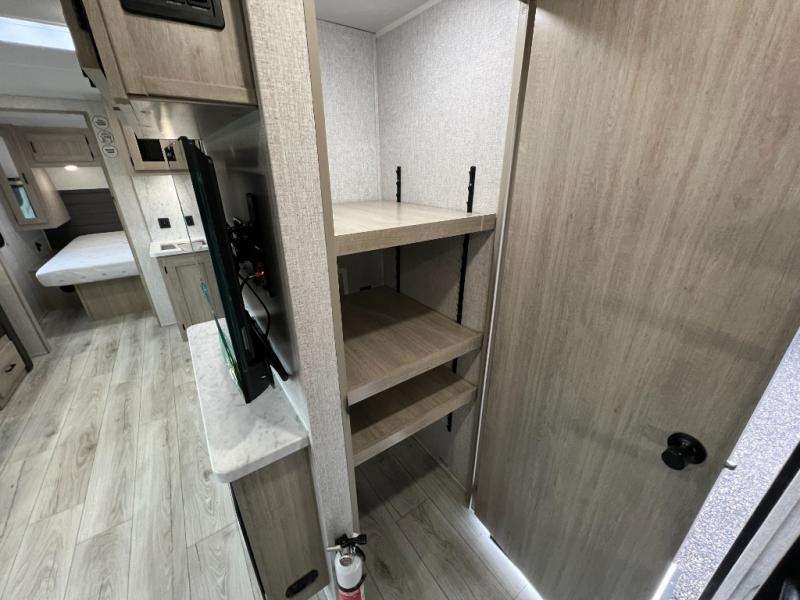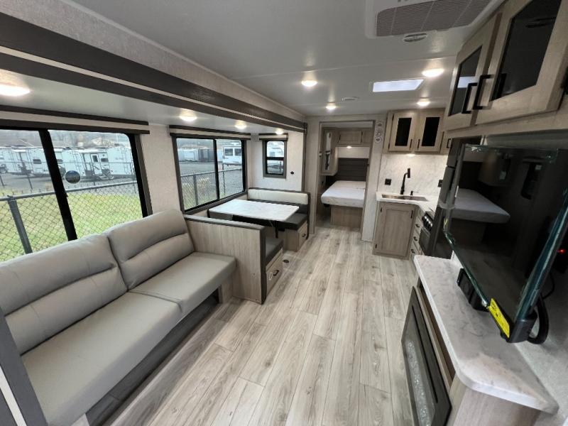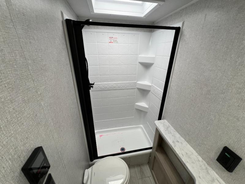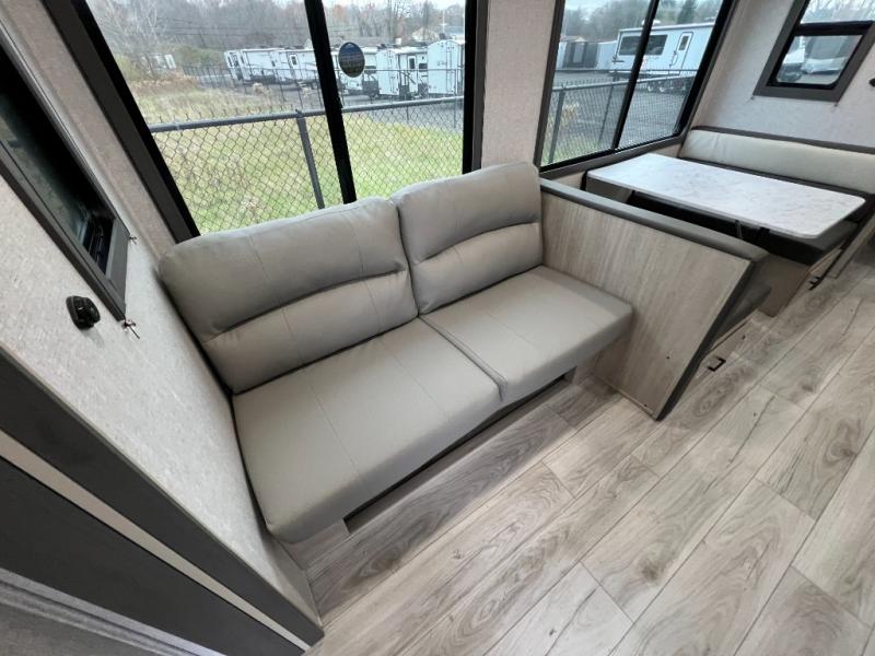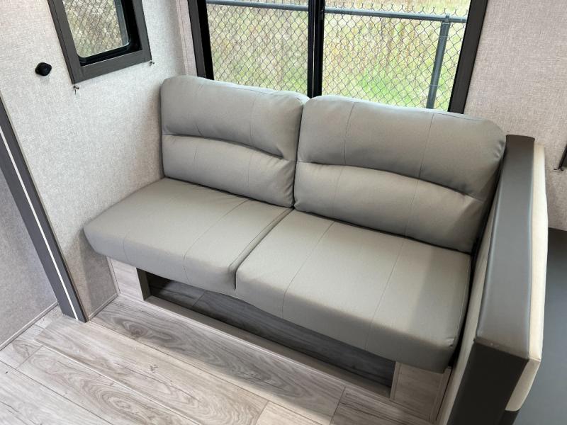 Pack up the whole gang since this unit features sleeping for eight to ten! As you enter you will find easy access to the rear corner bath including a 30" x 36" shower, toilet, and vanity with a sink, plus medicine cabinet just steps away. The slide creates an open and spacious feel for relaxing and dining inside. Here you will find a jiffy sofa and booth dinette with both featuring underneath storage. You will sleep like a king in the front private bedroom with a king bed and a space saving sliding door. Your family and or friends will love sleeping on the double-size bunks and furniture once easily setup for nighttime. This unit also features pass-through storage outside, more exterior storage beneath the double bed bunks, and an outside kitchen with a refrigerator and pull-out griddle.