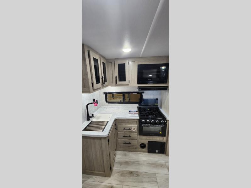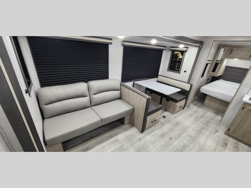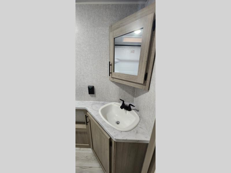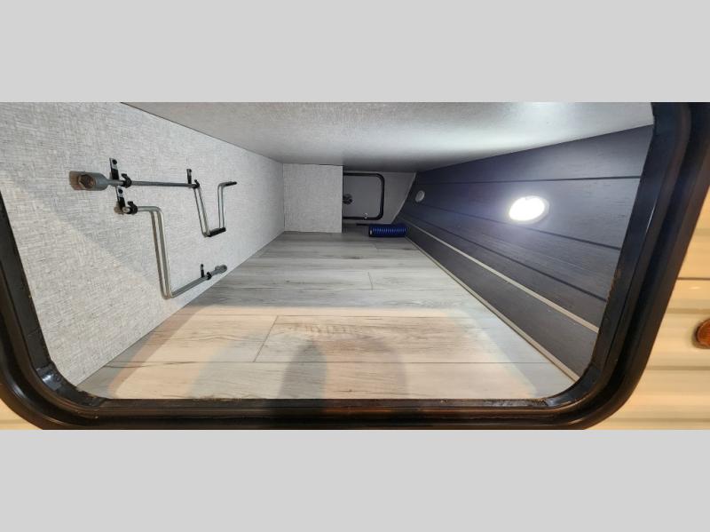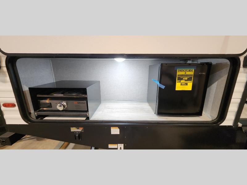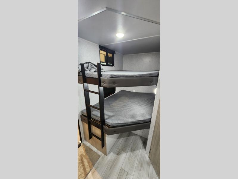 Pack up the whole gang since this unit features sleeping for eight to ten! As you enter you will find easy access to the rear corner bath including a 30" x 36" shower, toilet, and vanity with a sink, plus medicine cabinet just steps away. The slide creates an open and spacious feel for relaxing and dining inside. Here you will find a jiffy sofa and booth dinette with both featuring underneath storage. You will sleep like a king in the front private bedroom with a king bed and a space saving sliding door. Your family and or friends will love sleeping on the double-size bunks and furniture once easily setup for nighttime. This unit also features pass-through storage outside, more exterior storage beneath the double bed bunks, and an outside kitchen with a refrigerator and pull-out griddle.