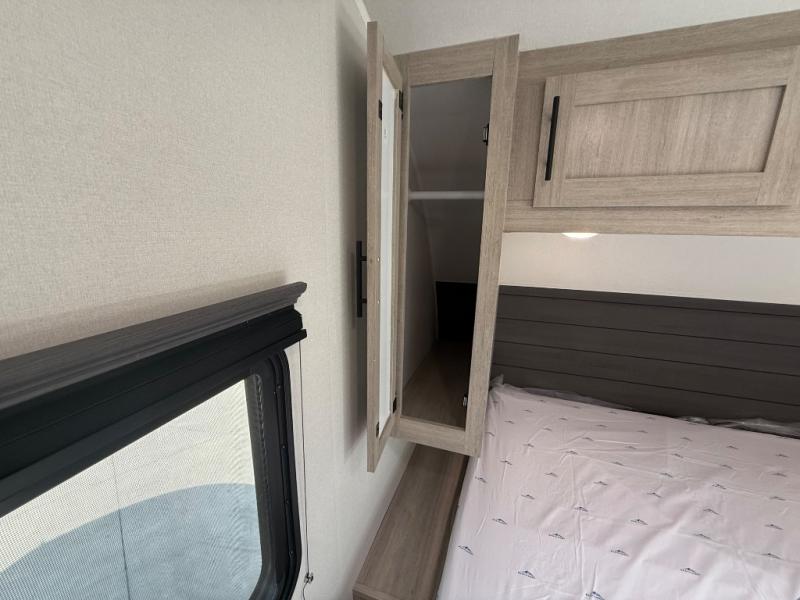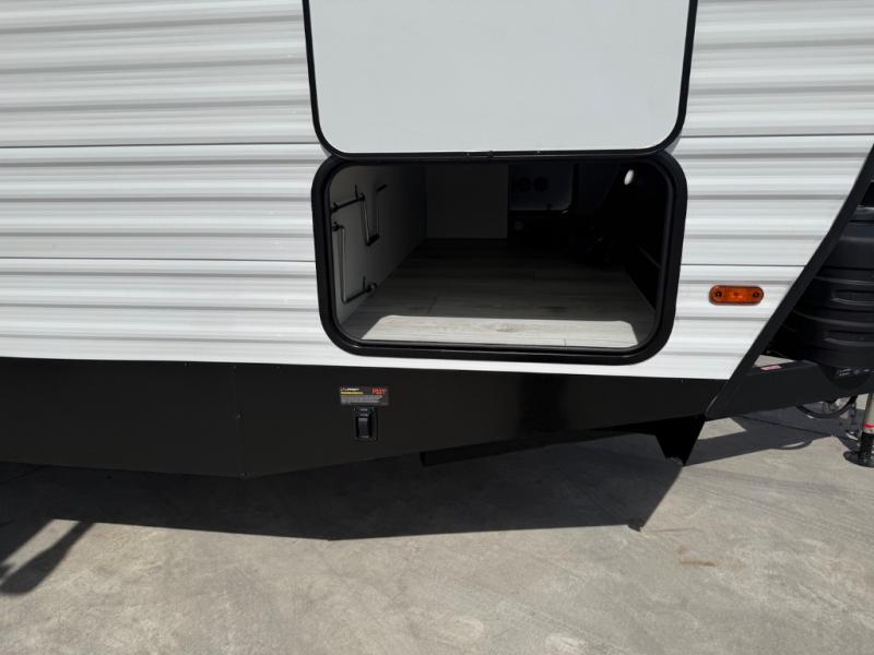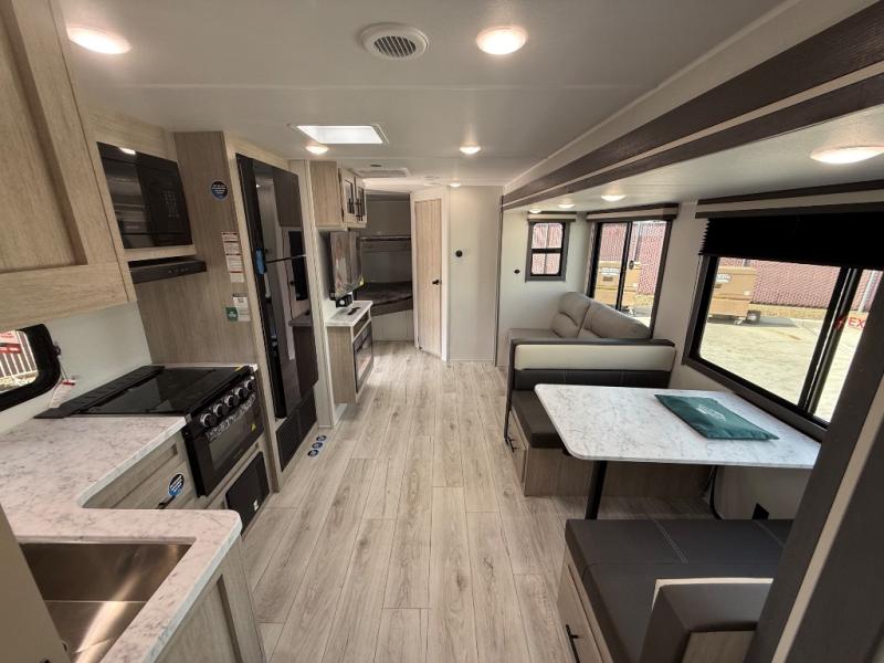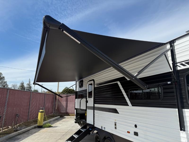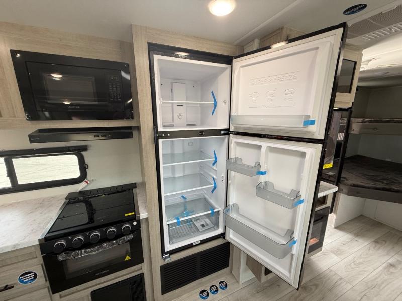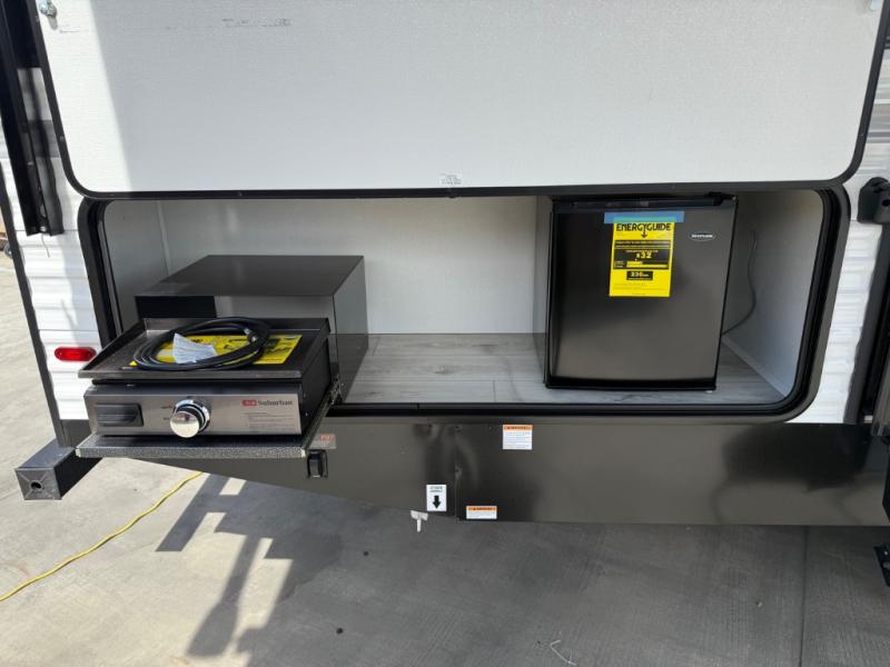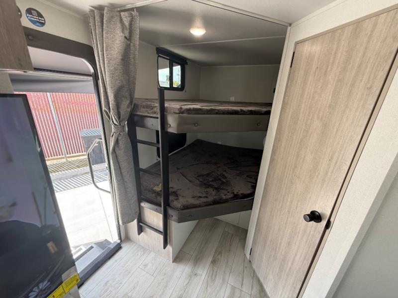 Pack up the whole gang since this unit features sleeping for eight to ten! As you enter you will find easy access to the rear corner bath including a 30" x 36" shower, toilet, and vanity with a sink, plus medicine cabinet just steps away. The slide creates an open and spacious feel for relaxing and dining inside. Here you will find a jiffy sofa and booth dinette with both featuring underneath storage. You will sleep like a king in the front private bedroom with a king bed and a space saving sliding door. Your family and or friends will love sleeping on the double-size bunks and furniture once easily setup for nighttime. This unit also features pass-through storage outside, more exterior storage beneath the double bed bunks, and an outside kitchen with a refrigerator and pull-out griddle.
