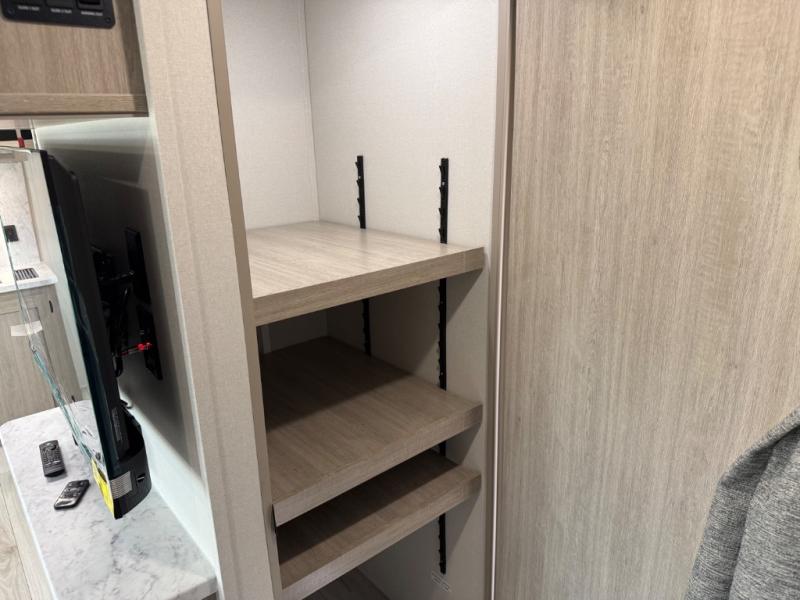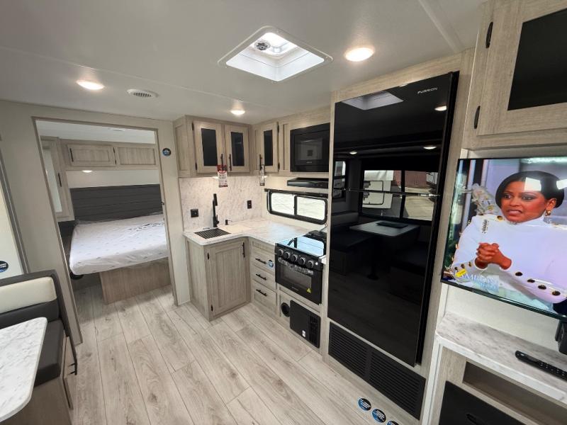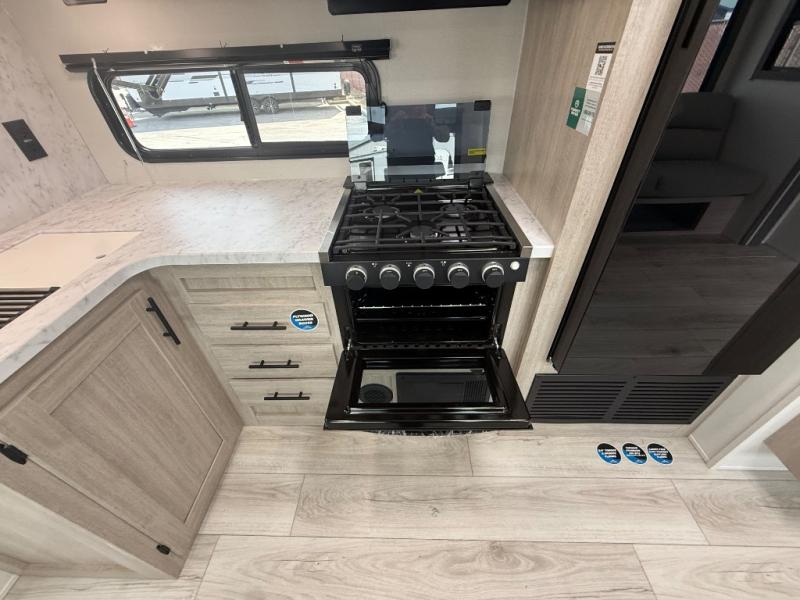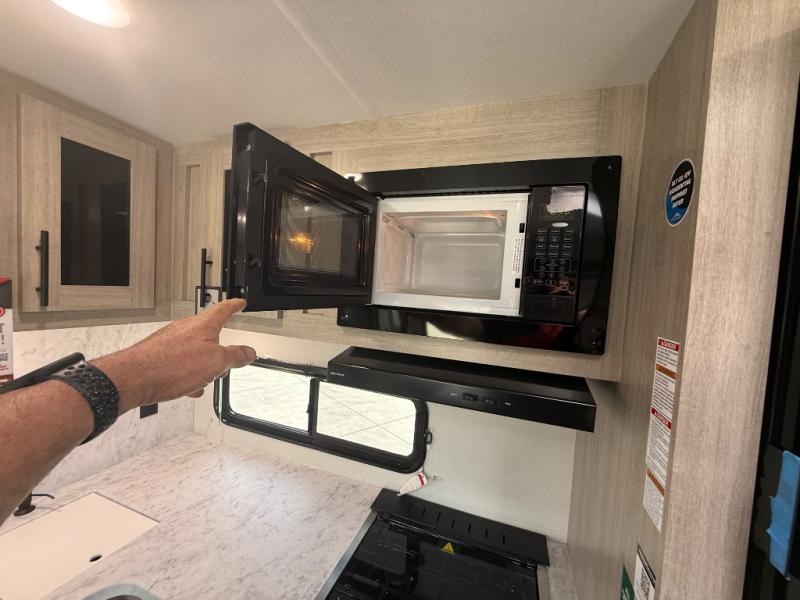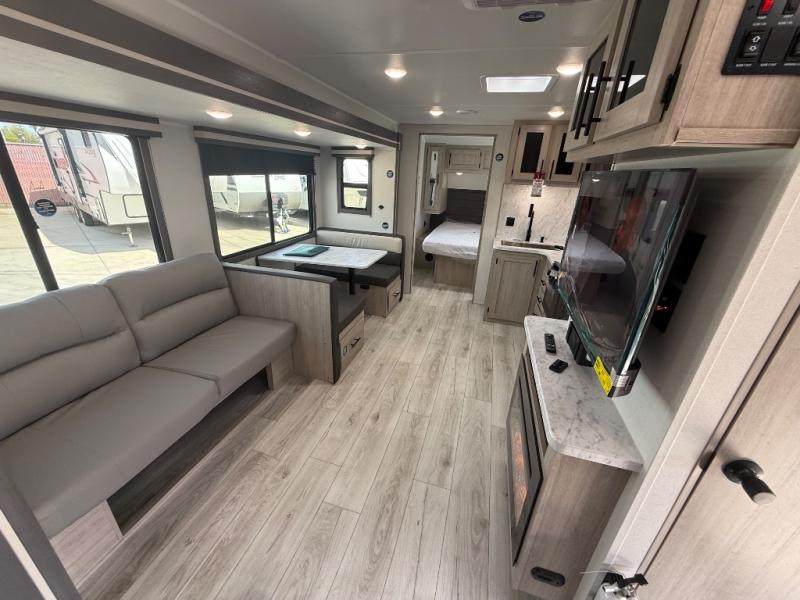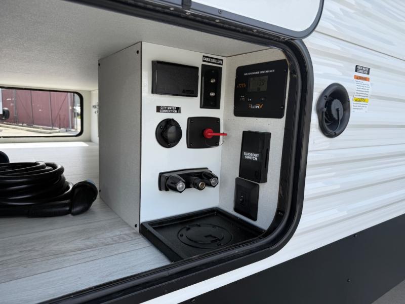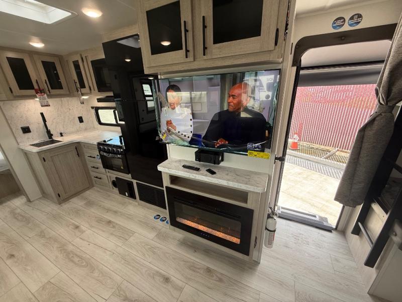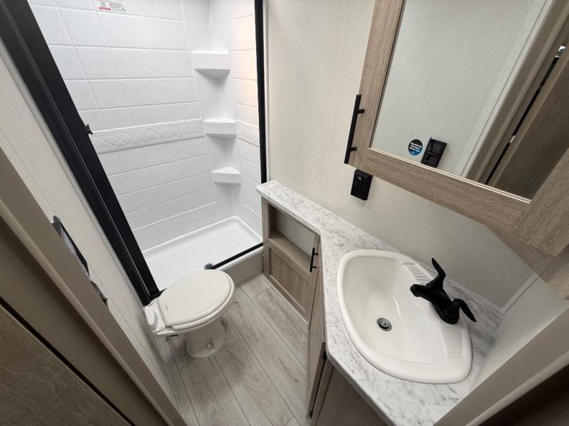 Pack up the whole gang since this unit features sleeping for eight to ten! As you enter you will find easy access to the rear corner bath including a 30" x 36" shower, toilet, and vanity with a sink, plus medicine cabinet just steps away. The slide creates an open and spacious feel for relaxing and dining inside. Here you will find a jiffy sofa and booth dinette with both featuring underneath storage. You will sleep like a king in the front private bedroom with a king bed and a space saving sliding door. Your family and or friends will love sleeping on the double-size bunks and furniture once easily setup for nighttime. This unit also features pass-through storage outside, more exterior storage beneath the double bed bunks, and an outside kitchen with a refrigerator and pull-out griddle.
