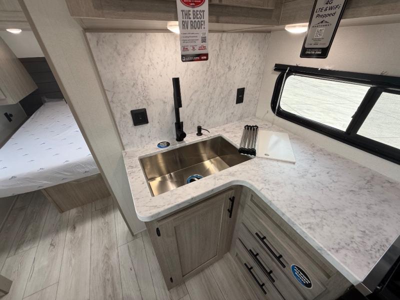 Each Della Terra travel trailer by EAST TO WEST is constructed with an enclosed and heated underbelly and enclosed holding tanks for added protection against the elements. There is also a power tongue jack with an LED light for easy set up and a power awning with LED lights you can rest under after you've unpacked. The Explore Comfort Package comes seamless pressed countertops, kitchen backsplash, window valance package with black night shades, and many more comforts. You will also appreciate the Adventure Outdoor Package with backup camera prep and solar prep, a tankless water heater, an RV grill quick disconnect, and a universal docking station with battery disconnect.