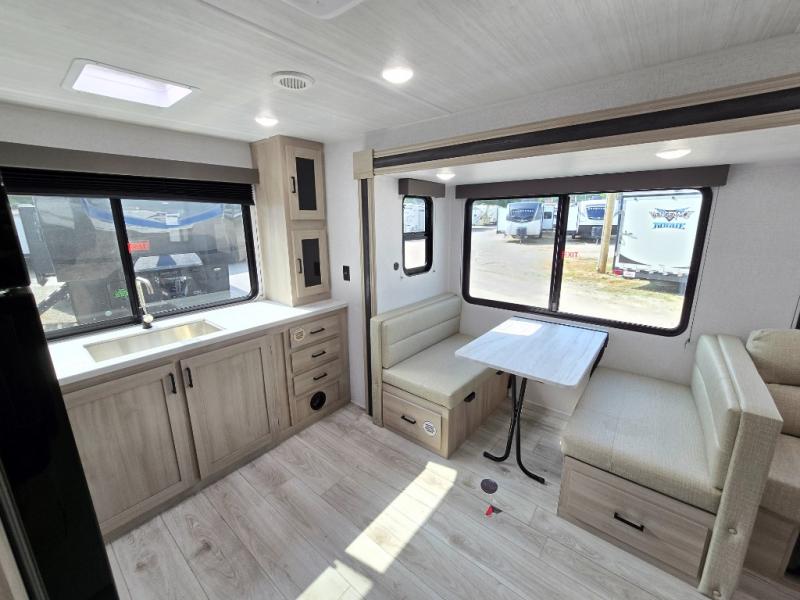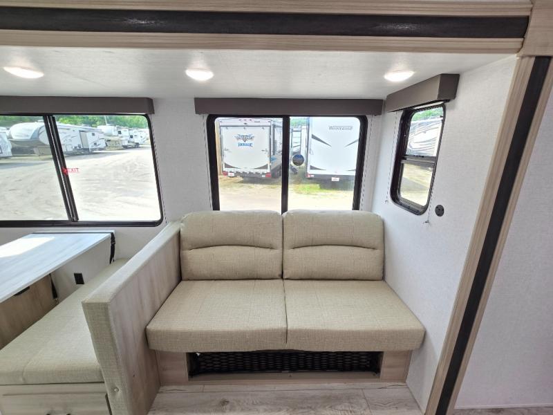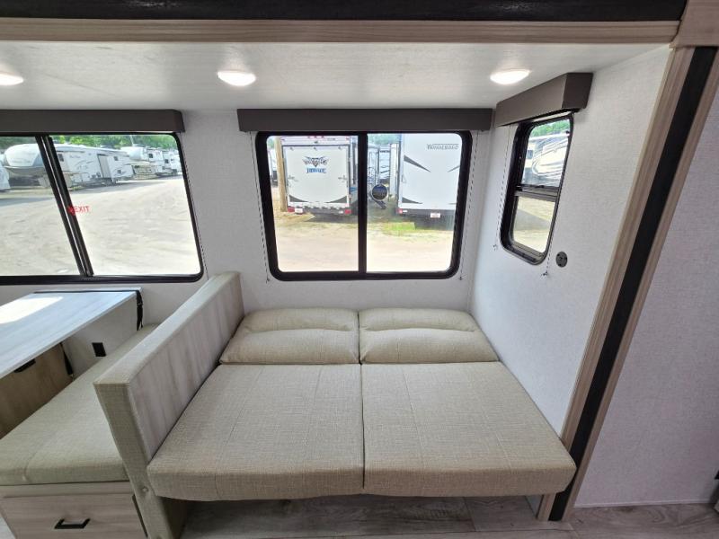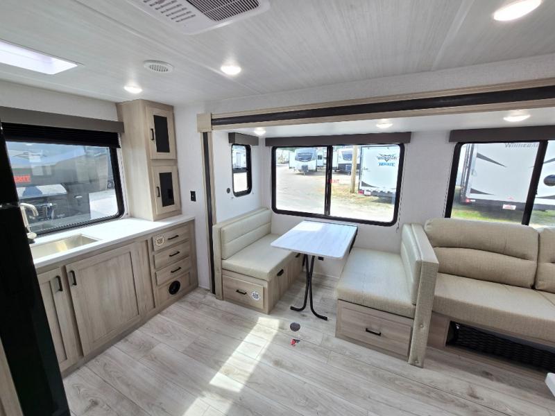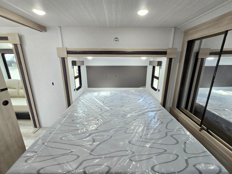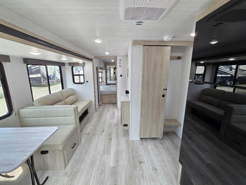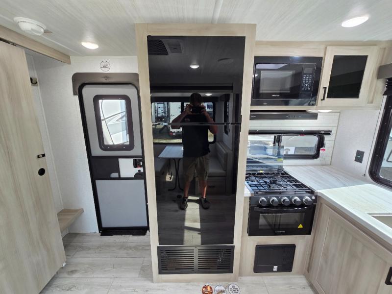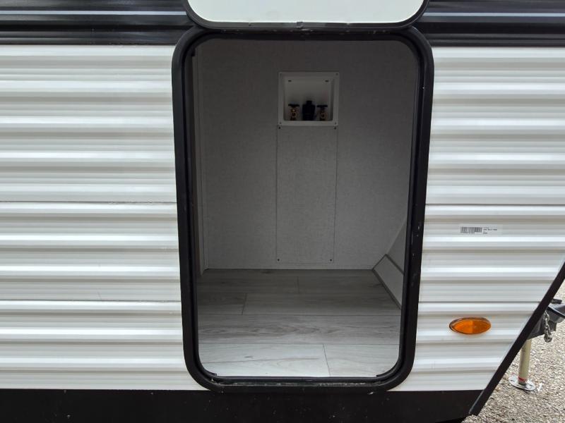 This travel trailer will feel just like home with its spacious interior and at-home comforts. Since there are dual entry doors, you can enter in through the front bedroom or the rear kitchen and living area. A king bed slide in the bedroom is sure to bring comfort, and there is a closet to keep your clothes wrinkle-free, plus washer and dryer prep. The second slide out is found in the living room, and here you can relax on the jiffy sofa or dine at the booth dinette. The chef of your group will love cooking in the rear kitchen, and there is generous counter space here to set out snacks. An entryway pantry and closet will provide additional storage for snacks, jackets, and more!