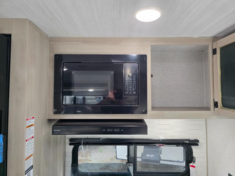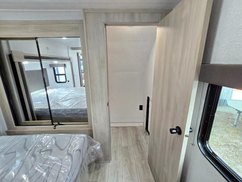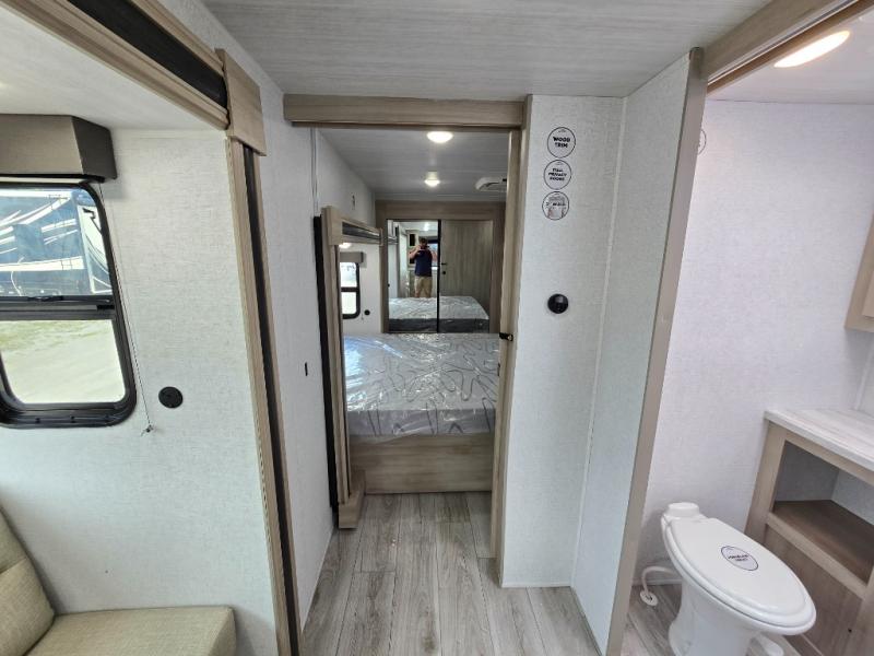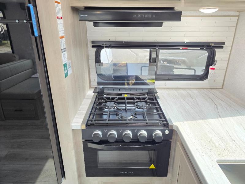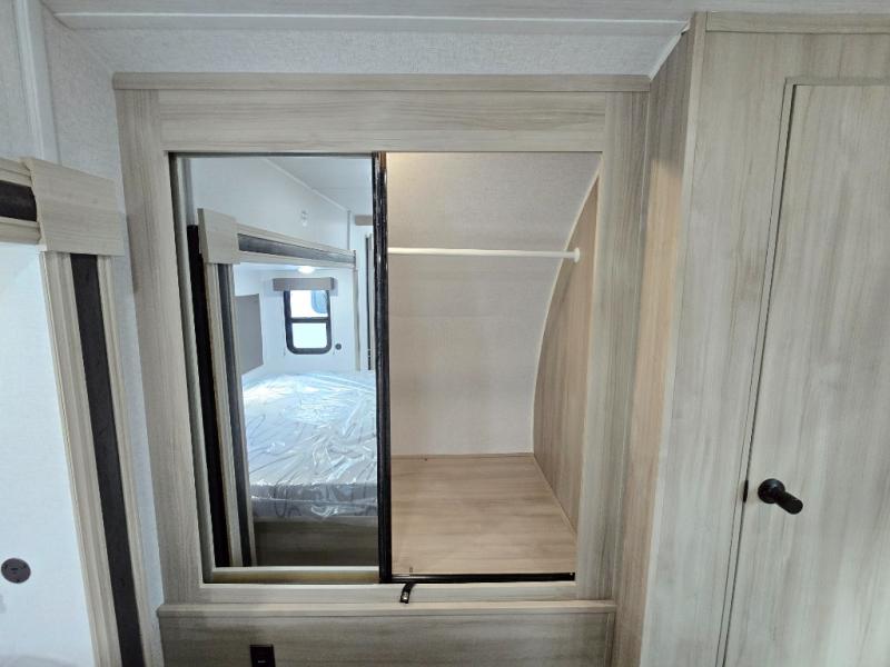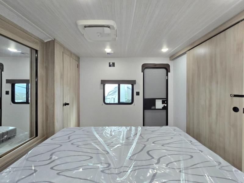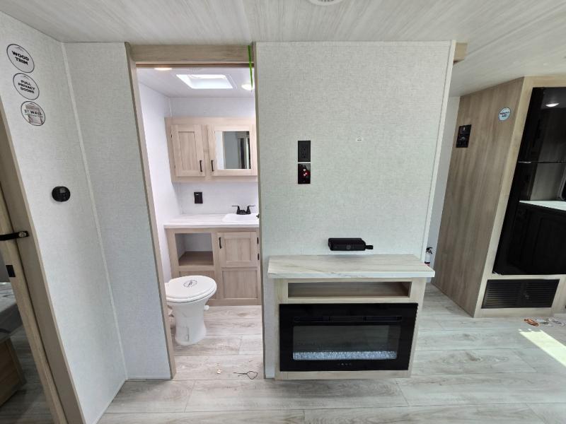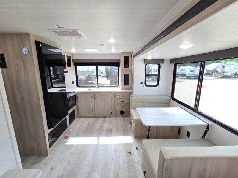 This travel trailer will feel just like home with its spacious interior and at-home comforts. Since there are dual entry doors, you can enter in through the front bedroom or the rear kitchen and living area. A king bed slide in the bedroom is sure to bring comfort, and there is a closet to keep your clothes wrinkle-free, plus washer and dryer prep. The second slide out is found in the living room, and here you can relax on the jiffy sofa or dine at the booth dinette. The chef of your group will love cooking in the rear kitchen, and there is generous counter space here to set out snacks. An entryway pantry and closet will provide additional storage for snacks, jackets, and more!