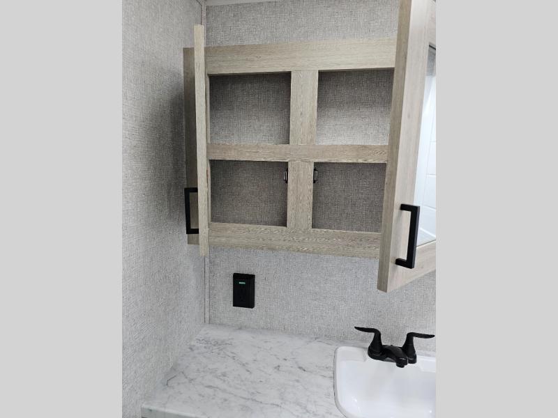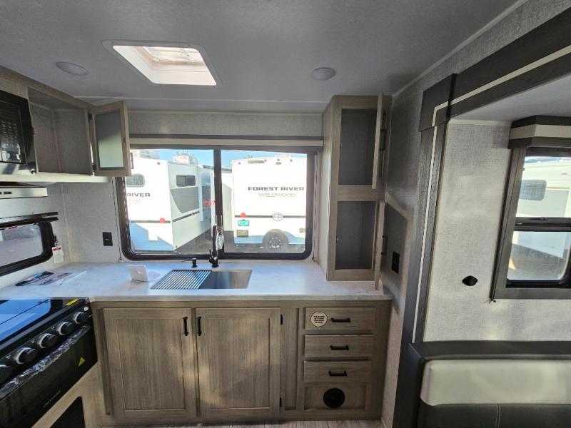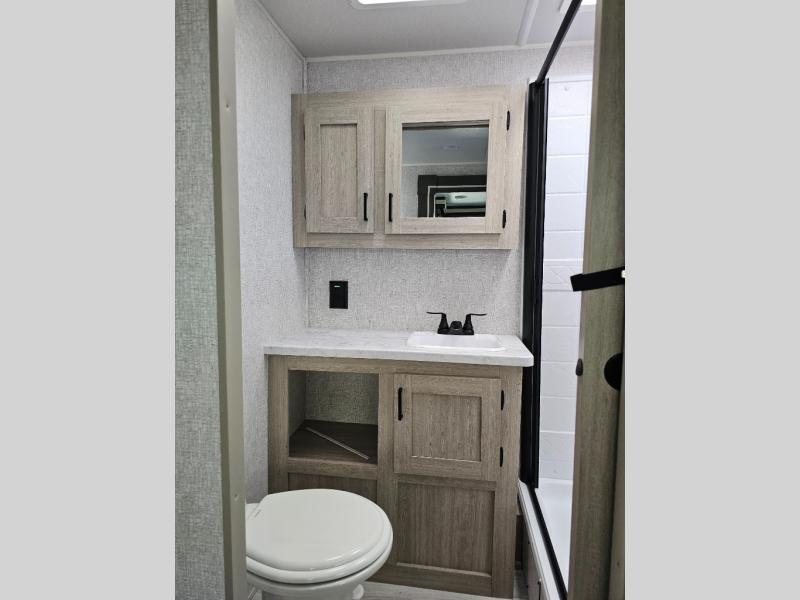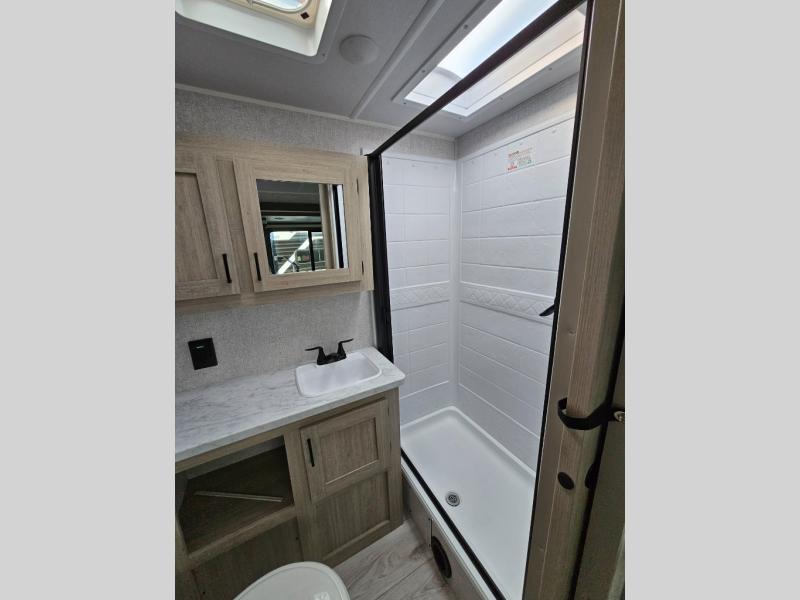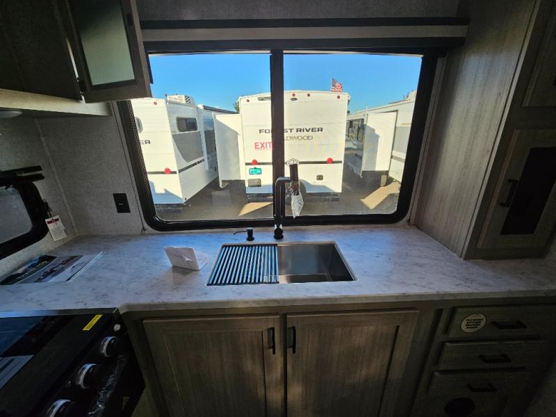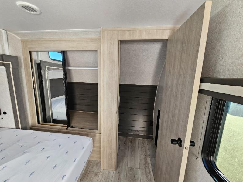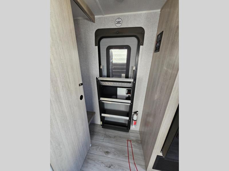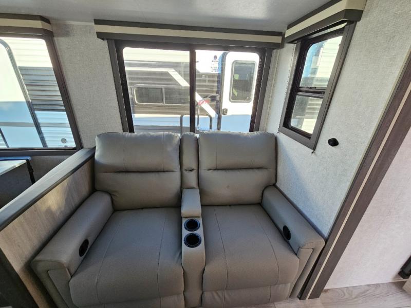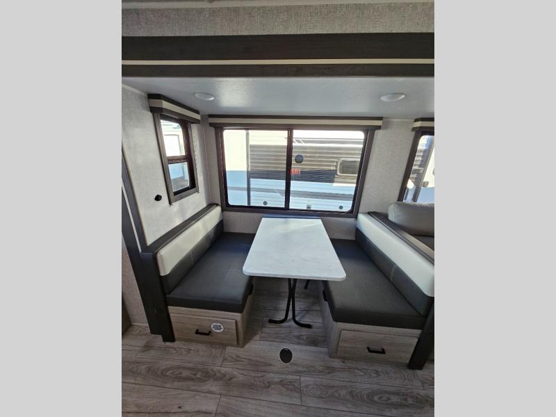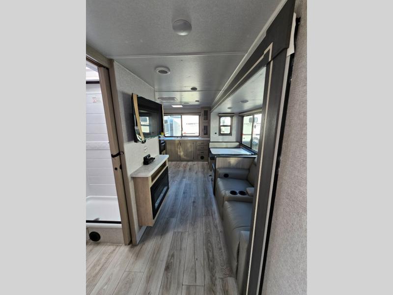 This travel trailer will feel just like home with its spacious interior and at-home comforts. Since there are dual entry doors, you can enter in through the front bedroom or the rear kitchen and living area. A king bed slide in the bedroom is sure to bring comfort, and there is a closet to keep your clothes wrinkle-free, plus washer and dryer prep. The second slide out is found in the living room, and here you can relax on the jiffy sofa or dine at the booth dinette. The chef of your group will love cooking in the rear kitchen, and there is generous counter space here to set out snacks. An entryway pantry and closet will provide additional storage for snacks, jackets, and more!
