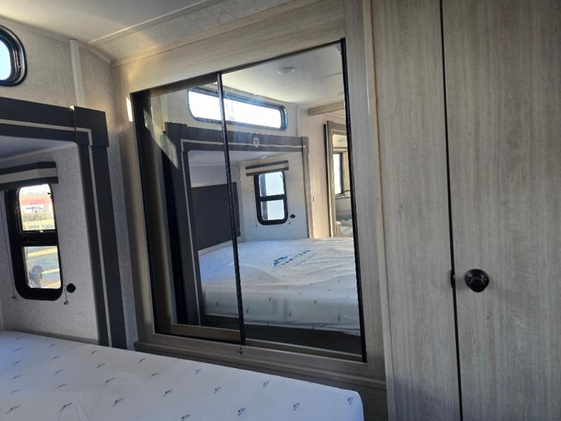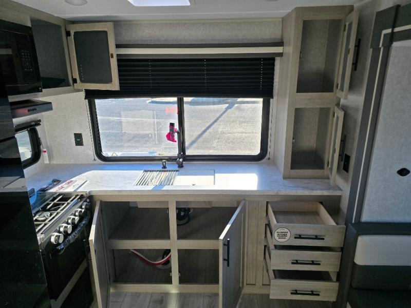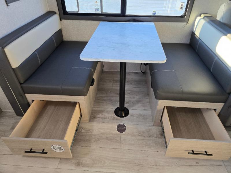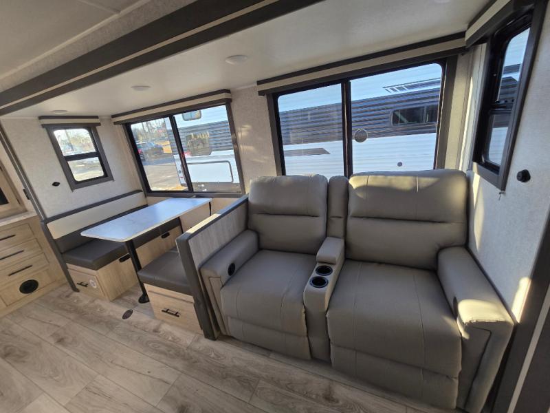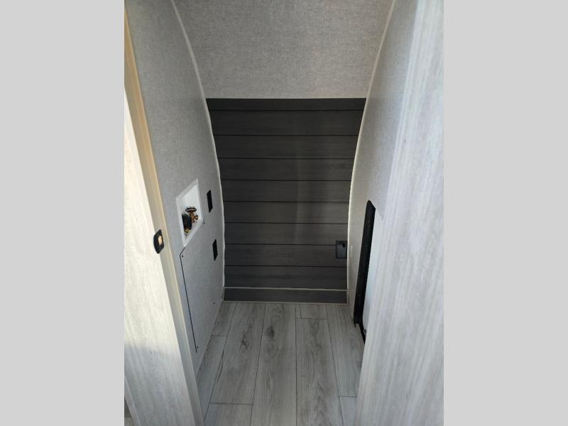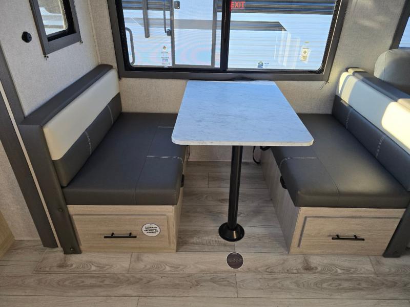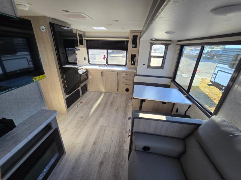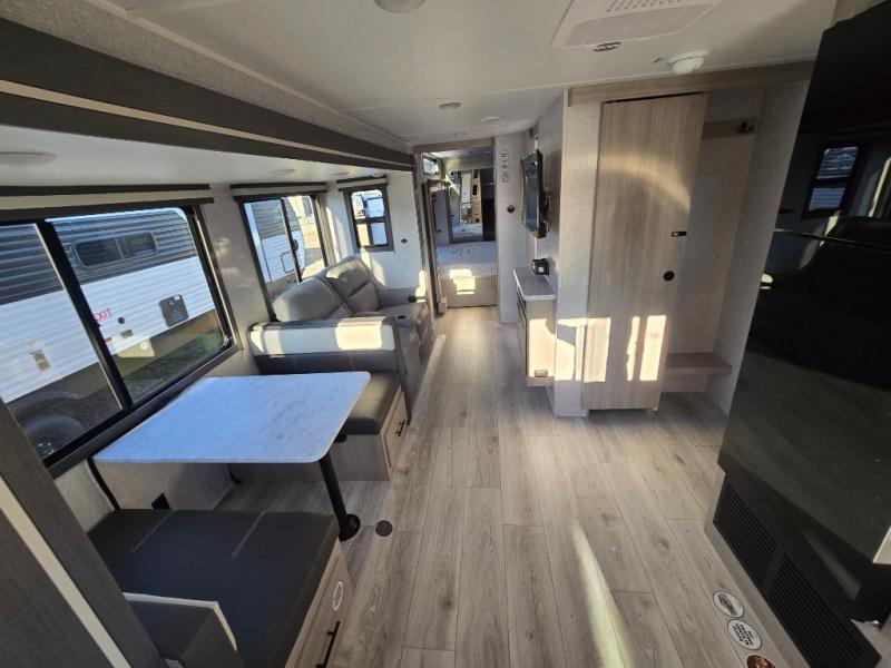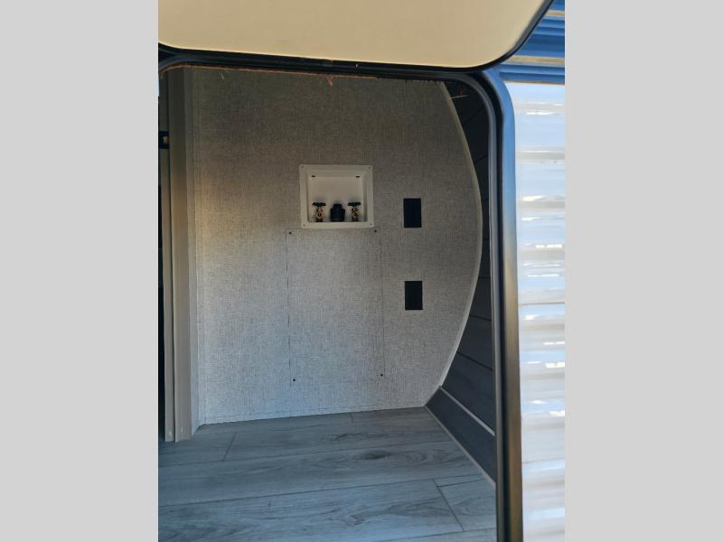 This travel trailer will feel just like home with its spacious interior and at-home comforts. Since there are dual entry doors, you can enter in through the front bedroom or the rear kitchen and living area. A king bed slide in the bedroom is sure to bring comfort, and there is a closet to keep your clothes wrinkle-free, plus washer and dryer prep. The second slide out is found in the living room, and here you can relax on the jiffy sofa or dine at the booth dinette. The chef of your group will love cooking in the rear kitchen, and there is generous counter space here to set out snacks. An entryway pantry and closet will provide additional storage for snacks, jackets, and more!