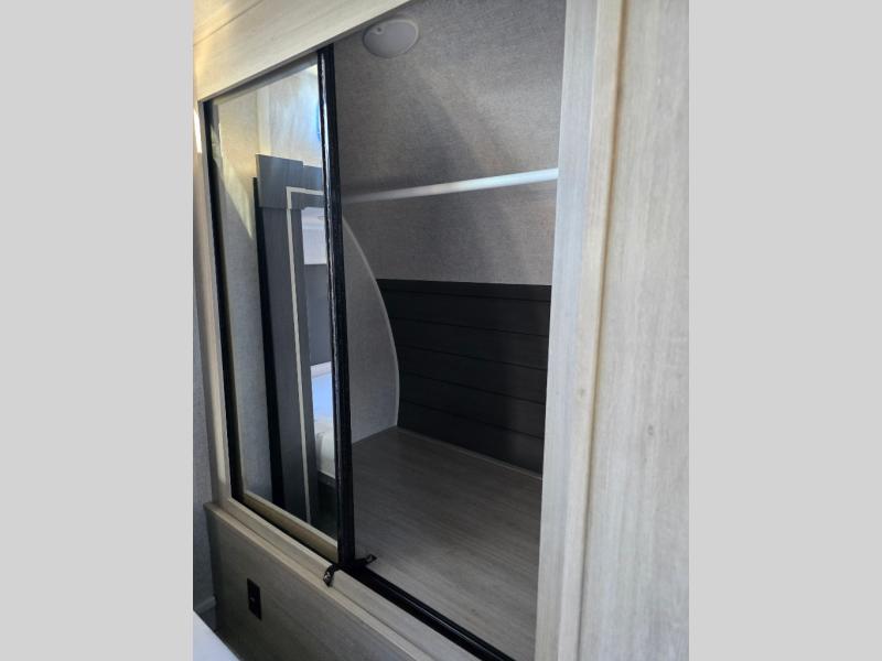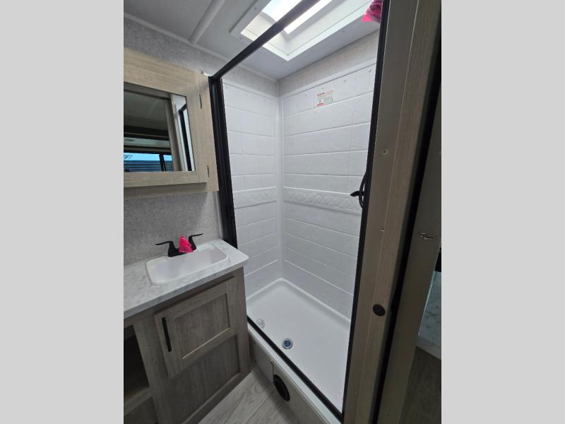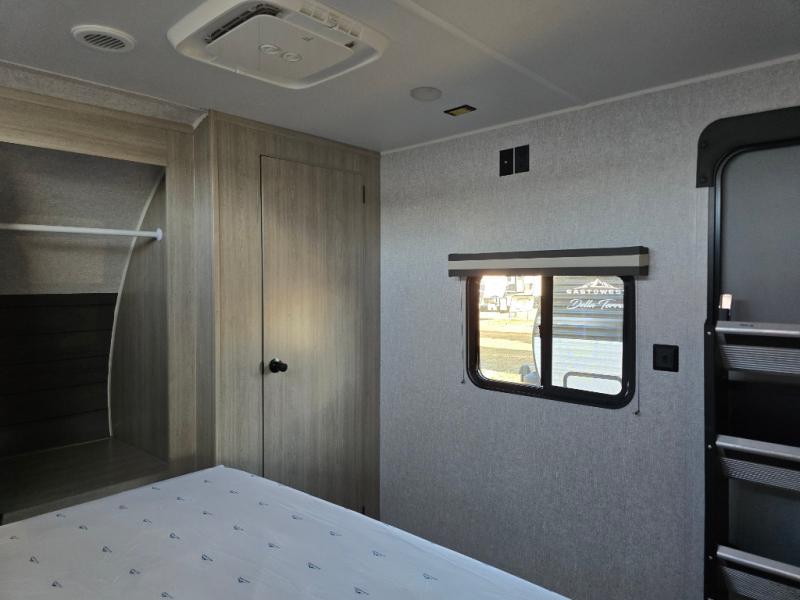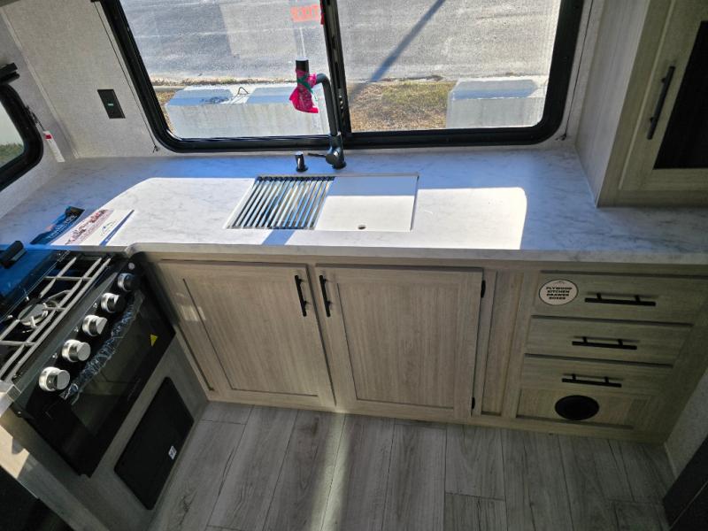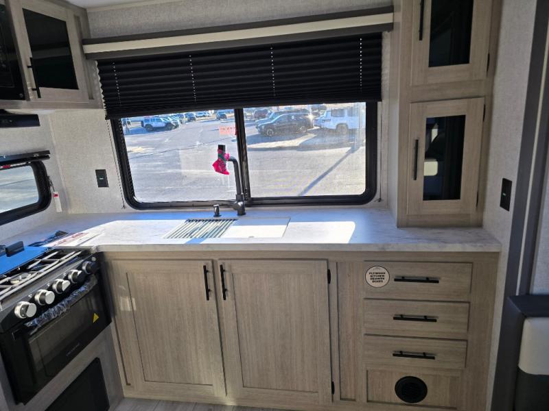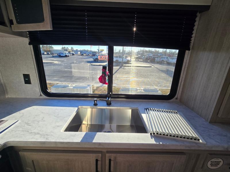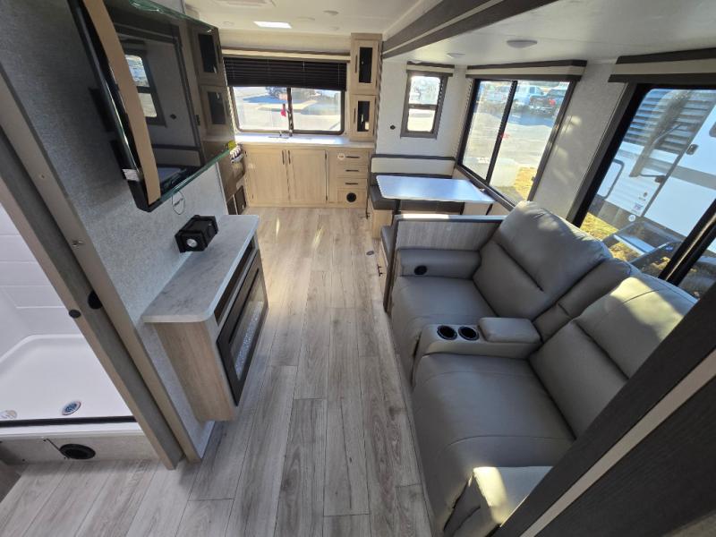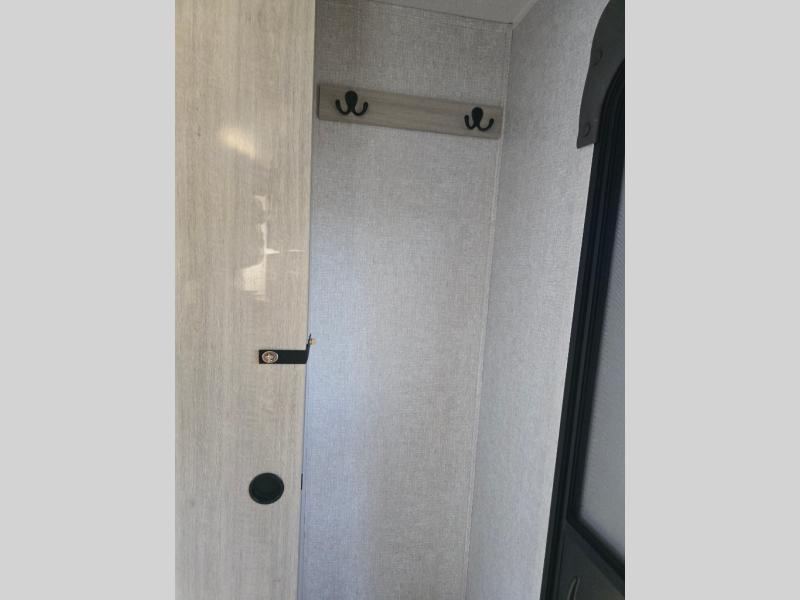 This travel trailer will feel just like home with its spacious interior and at-home comforts. Since there are dual entry doors, you can enter in through the front bedroom or the rear kitchen and living area. A king bed slide in the bedroom is sure to bring comfort, and there is a closet to keep your clothes wrinkle-free, plus washer and dryer prep. The second slide out is found in the living room, and here you can relax on the jiffy sofa or dine at the booth dinette. The chef of your group will love cooking in the rear kitchen, and there is generous counter space here to set out snacks. An entryway pantry and closet will provide additional storage for snacks, jackets, and more!