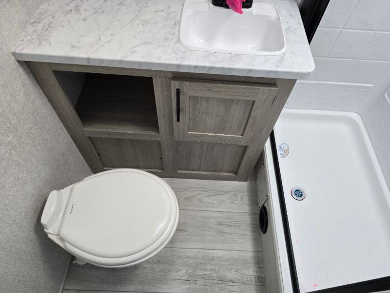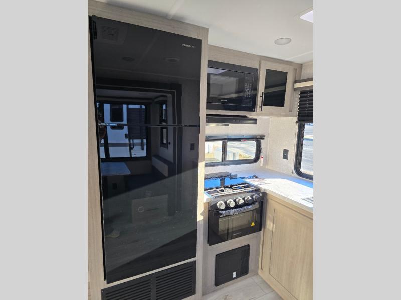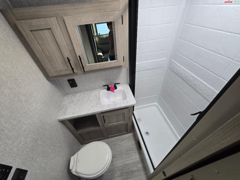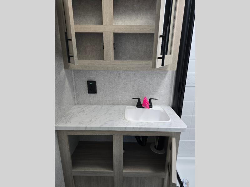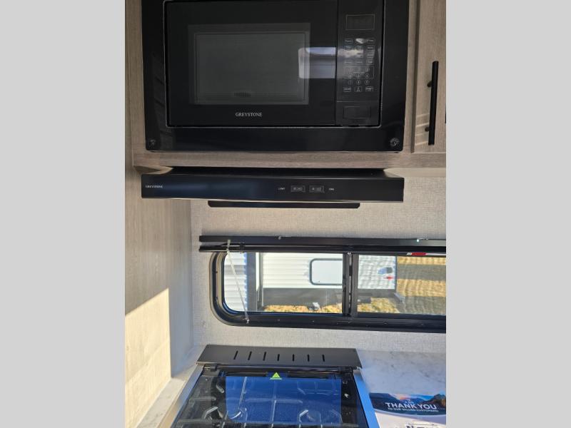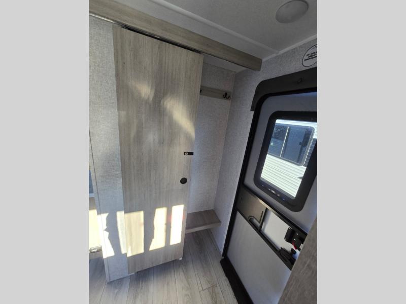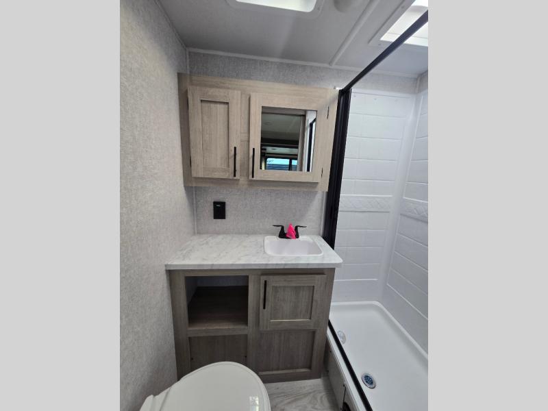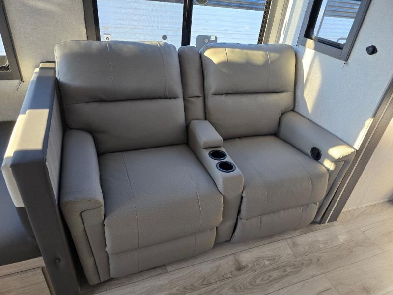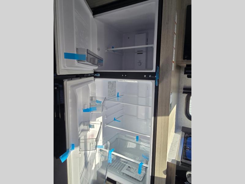 This travel trailer will feel just like home with its spacious interior and at-home comforts. Since there are dual entry doors, you can enter in through the front bedroom or the rear kitchen and living area. A king bed slide in the bedroom is sure to bring comfort, and there is a closet to keep your clothes wrinkle-free, plus washer and dryer prep. The second slide out is found in the living room, and here you can relax on the jiffy sofa or dine at the booth dinette. The chef of your group will love cooking in the rear kitchen, and there is generous counter space here to set out snacks. An entryway pantry and closet will provide additional storage for snacks, jackets, and more!