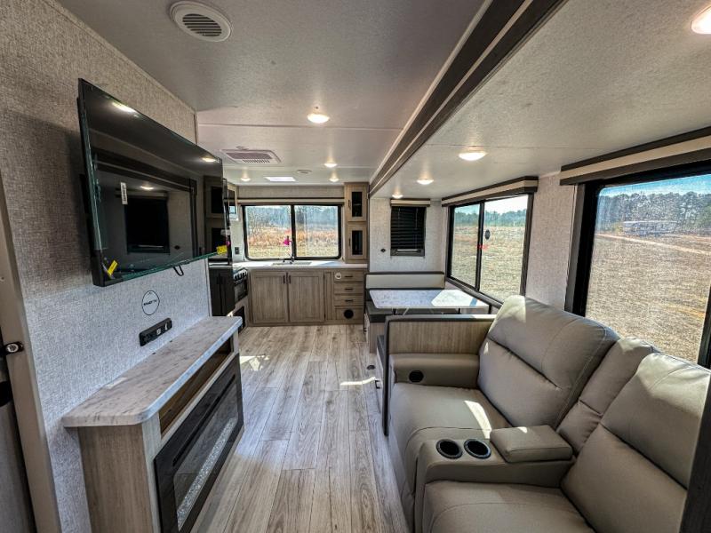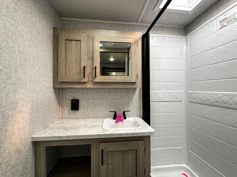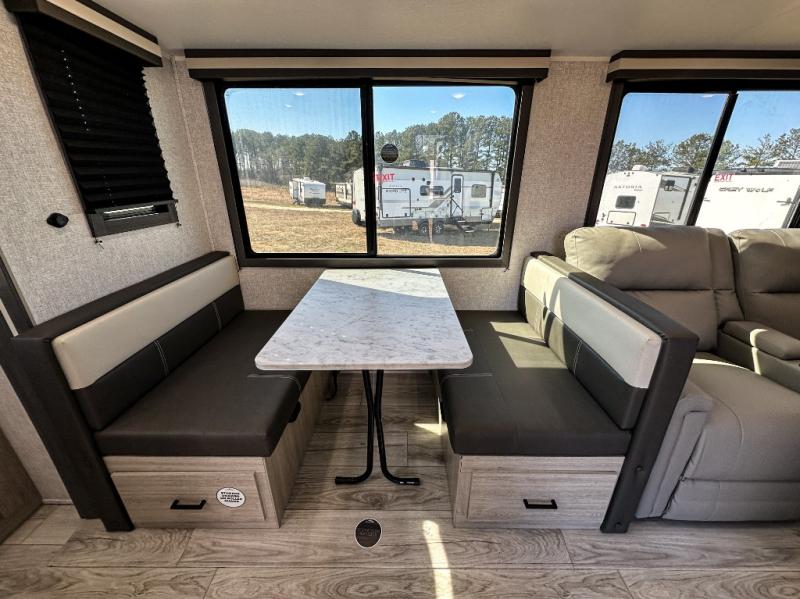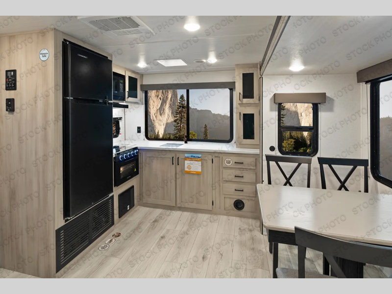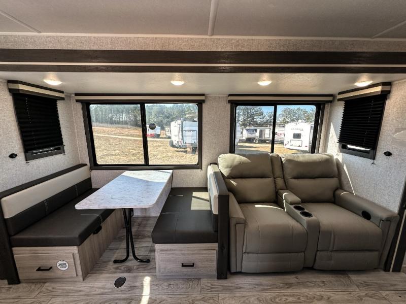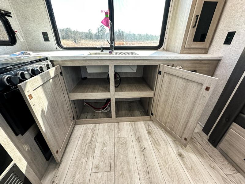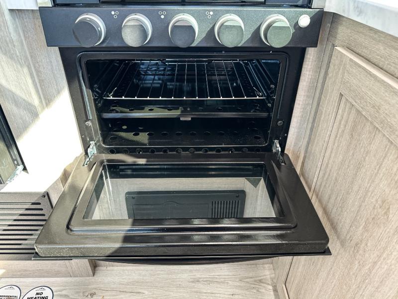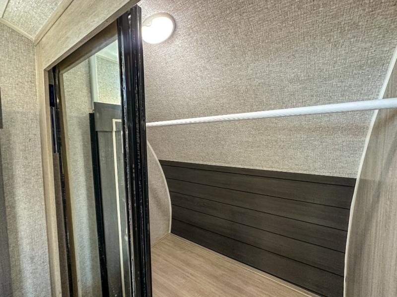 This travel trailer will feel just like home with its spacious interior and at-home comforts. Since there are dual entry doors, you can enter in through the front bedroom or the rear kitchen and living area. A king bed slide in the bedroom is sure to bring comfort, and there is a closet to keep your clothes wrinkle-free, plus washer and dryer prep. The second slide out is found in the living room, and here you can relax on the jiffy sofa or dine at the booth dinette. The chef of your group will love cooking in the rear kitchen, and there is generous counter space here to set out snacks. An entryway pantry and closet will provide additional storage for snacks, jackets, and more!