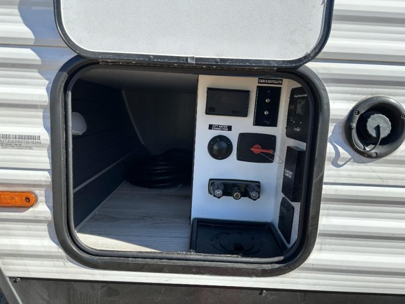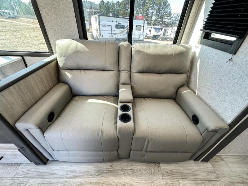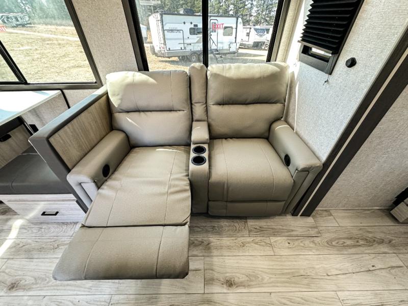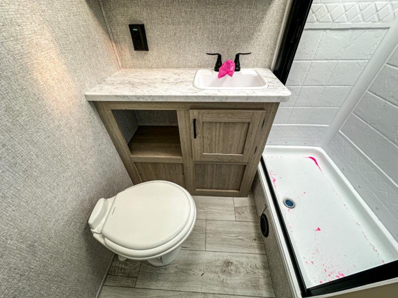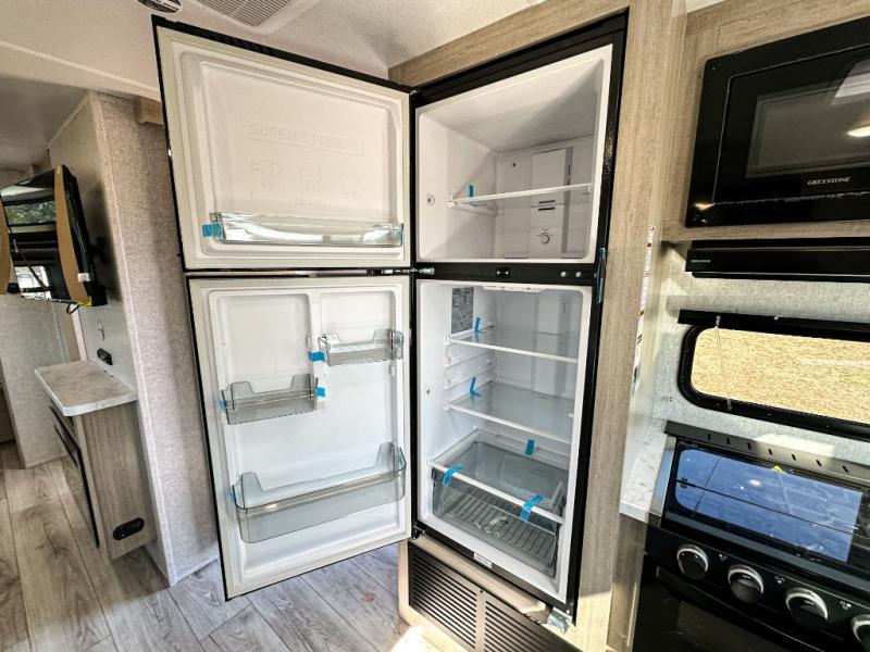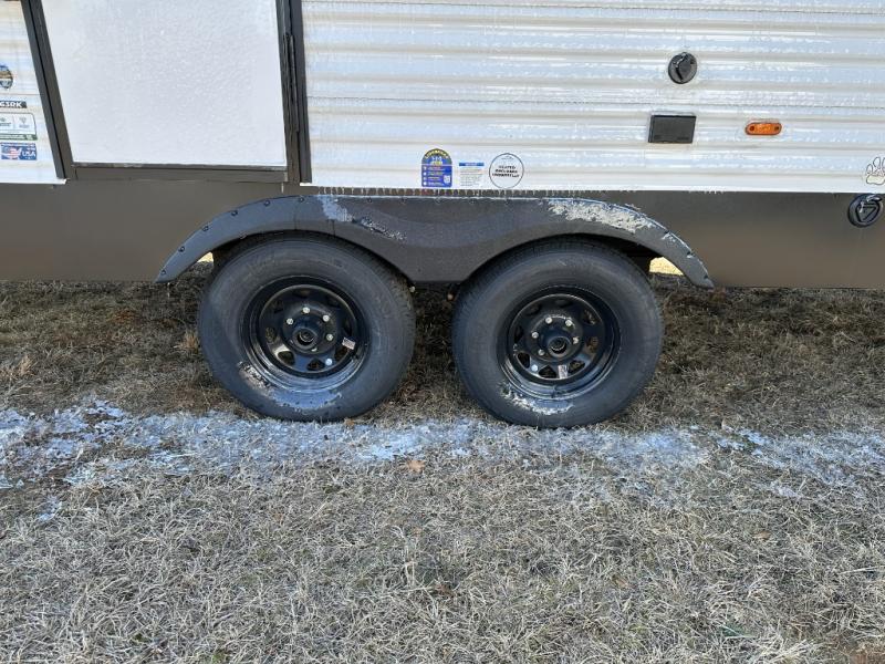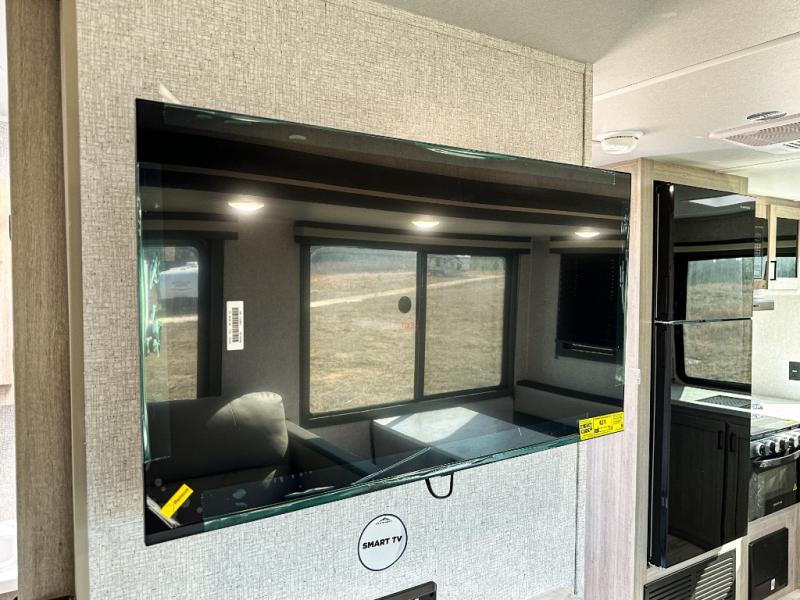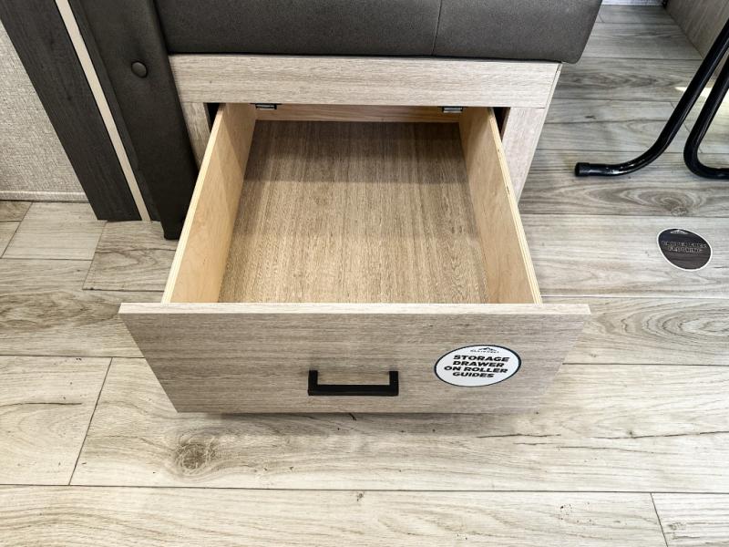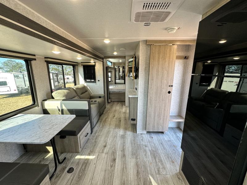 This travel trailer will feel just like home with its spacious interior and at-home comforts. Since there are dual entry doors, you can enter in through the front bedroom or the rear kitchen and living area. A king bed slide in the bedroom is sure to bring comfort, and there is a closet to keep your clothes wrinkle-free, plus washer and dryer prep. The second slide out is found in the living room, and here you can relax on the jiffy sofa or dine at the booth dinette. The chef of your group will love cooking in the rear kitchen, and there is generous counter space here to set out snacks. An entryway pantry and closet will provide additional storage for snacks, jackets, and more!