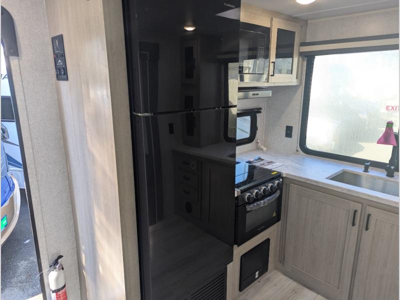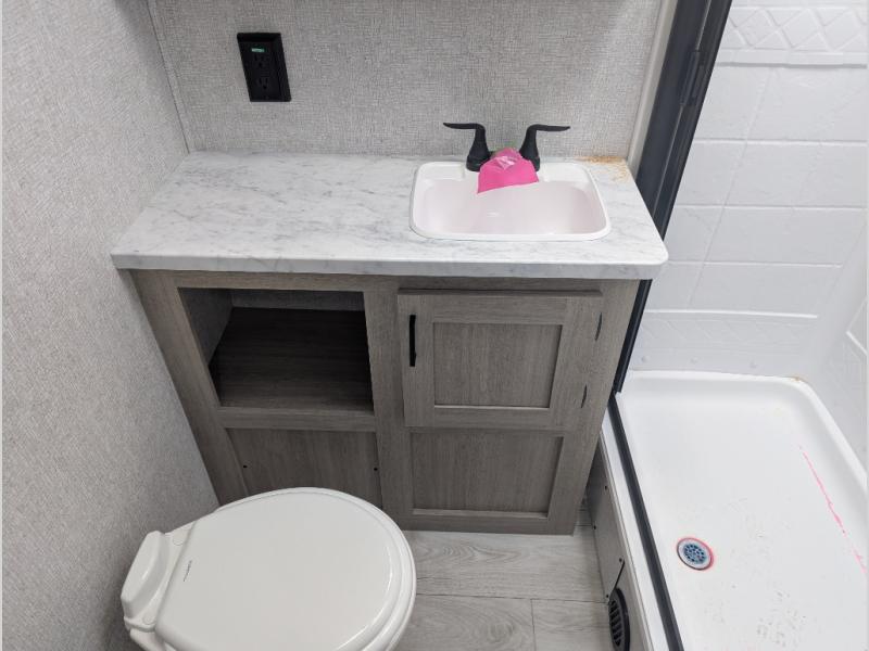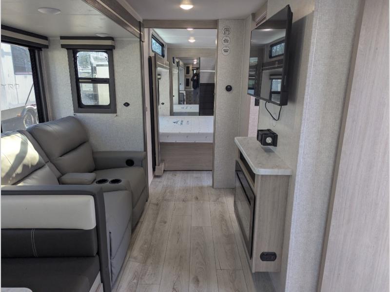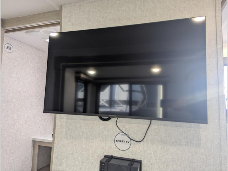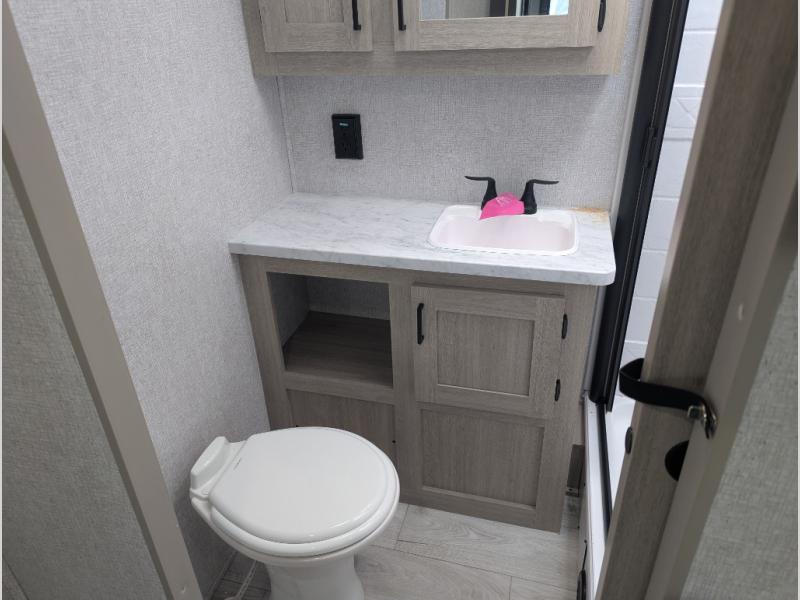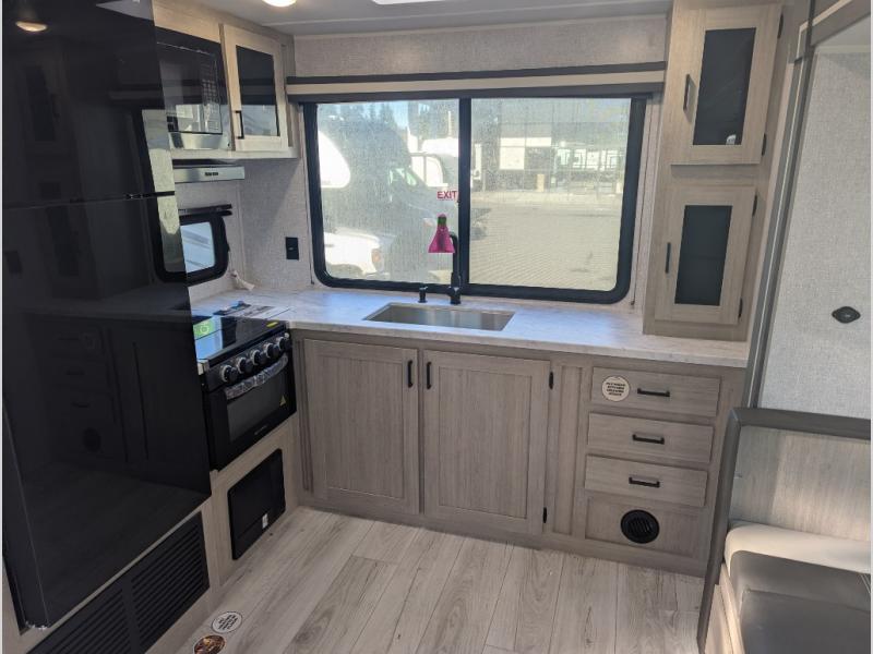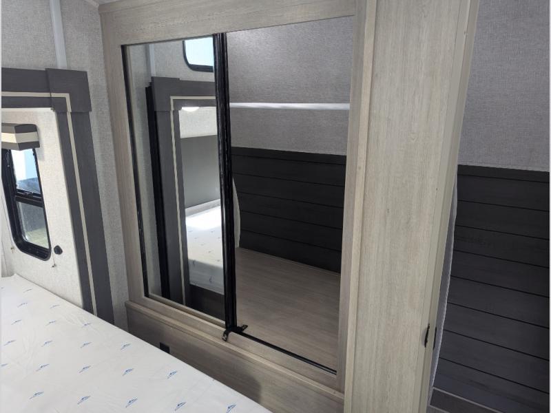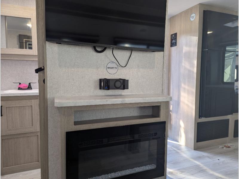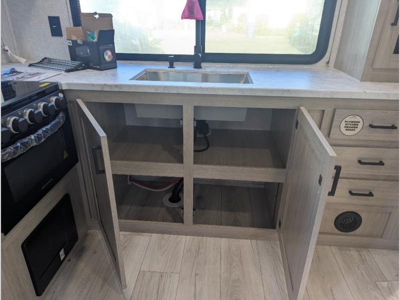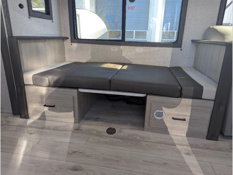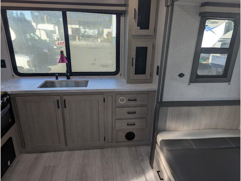 This travel trailer will feel just like home with its spacious interior and at-home comforts. Since there are dual entry doors, you can enter in through the front bedroom or the rear kitchen and living area. A king bed slide in the bedroom is sure to bring comfort, and there is a closet to keep your clothes wrinkle-free, plus washer and dryer prep. The second slide out is found in the living room, and here you can relax on the jiffy sofa or dine at the booth dinette. The chef of your group will love cooking in the rear kitchen, and there is generous counter space here to set out snacks. An entryway pantry and closet will provide additional storage for snacks, jackets, and more!