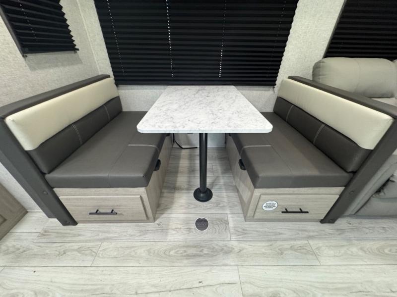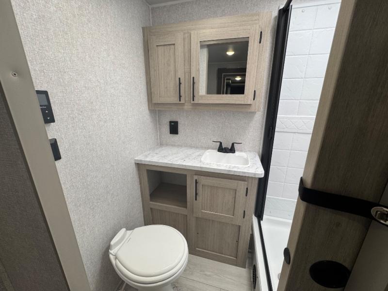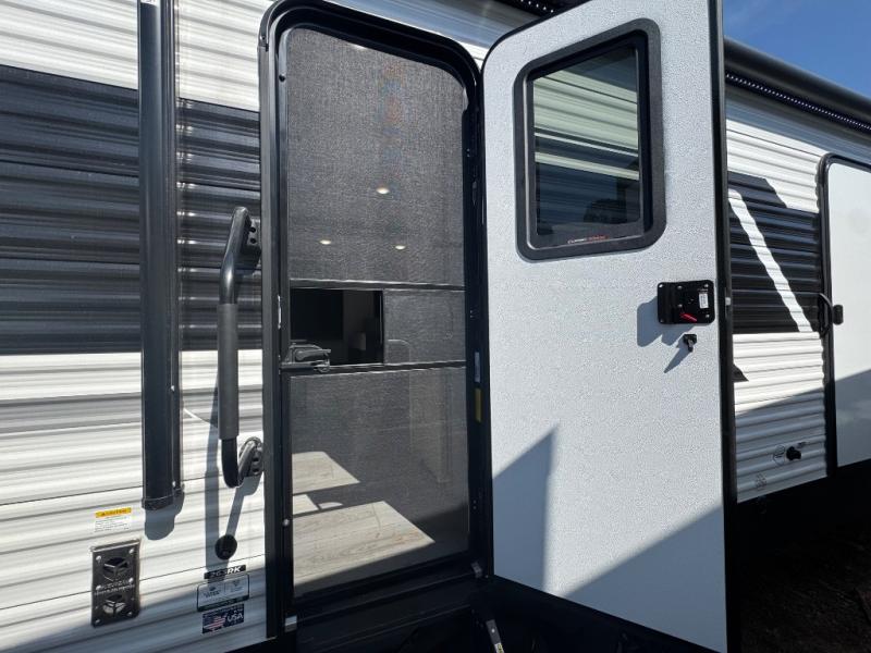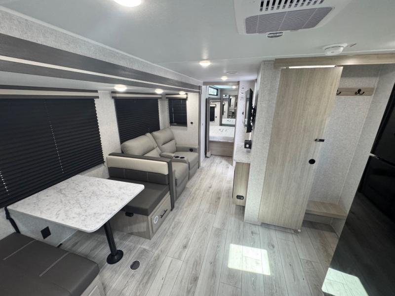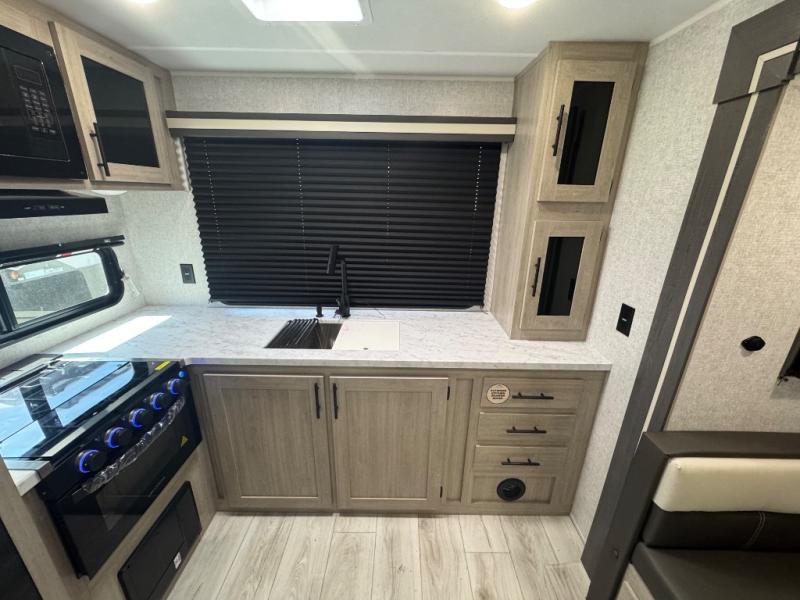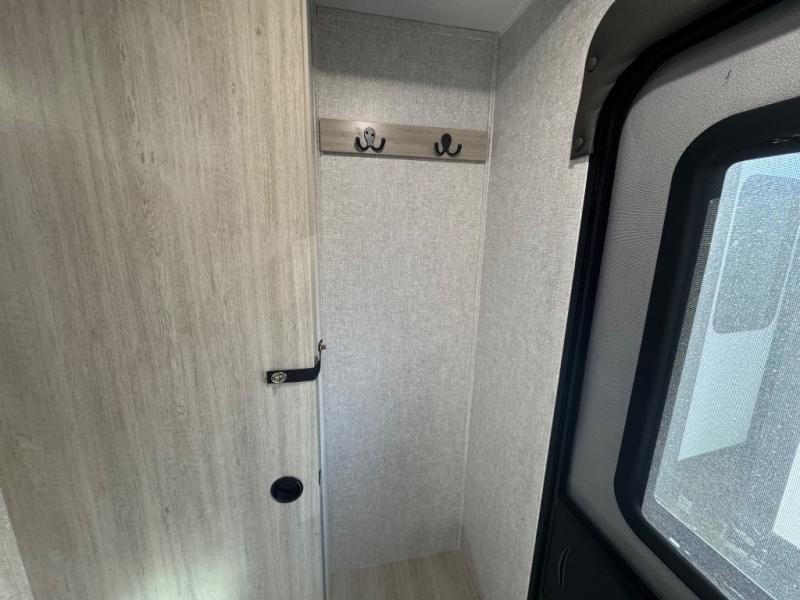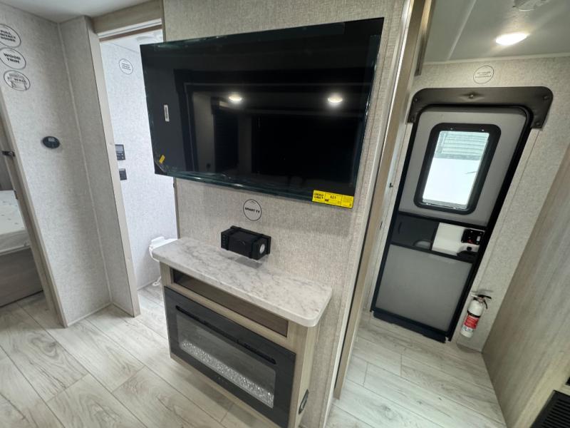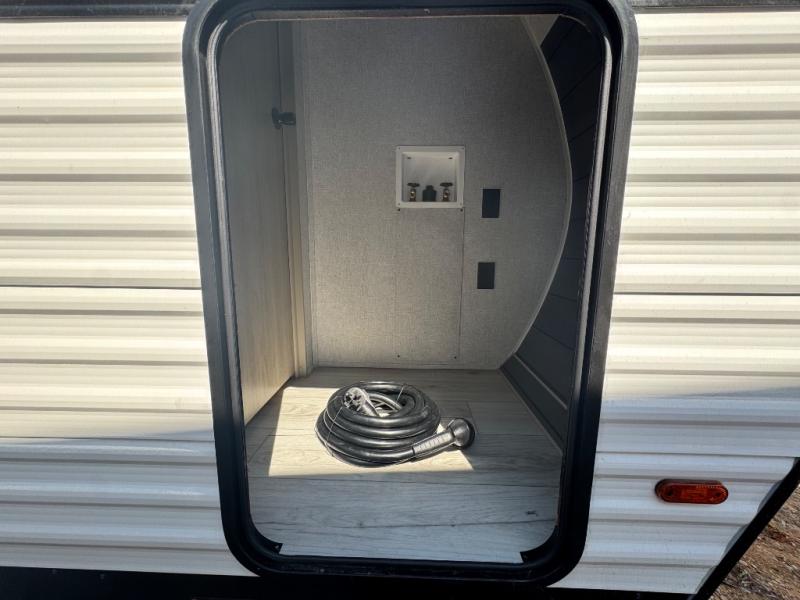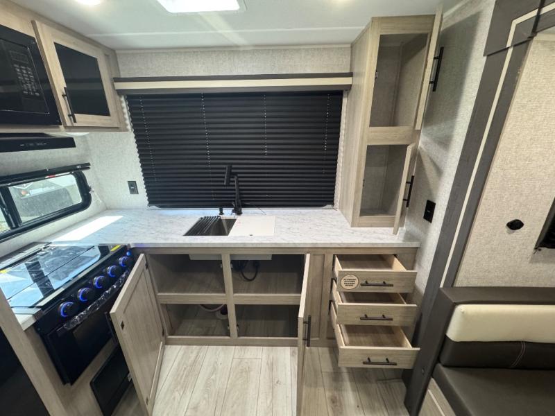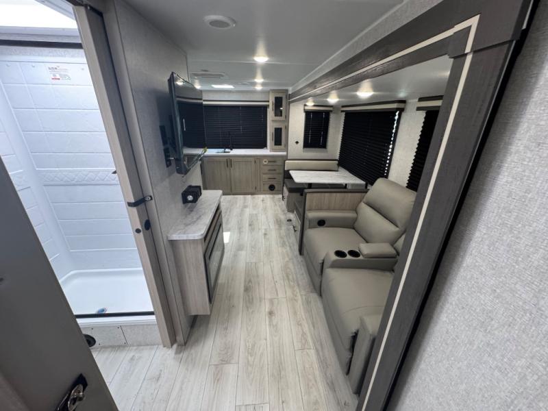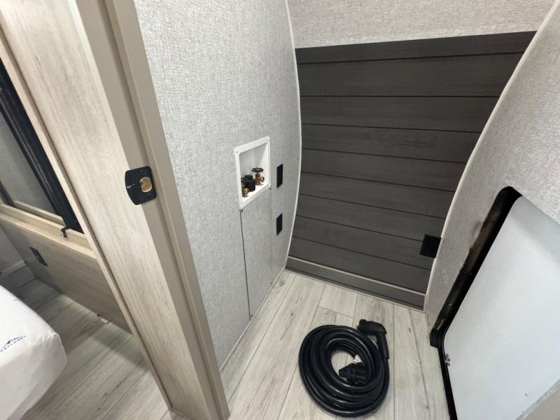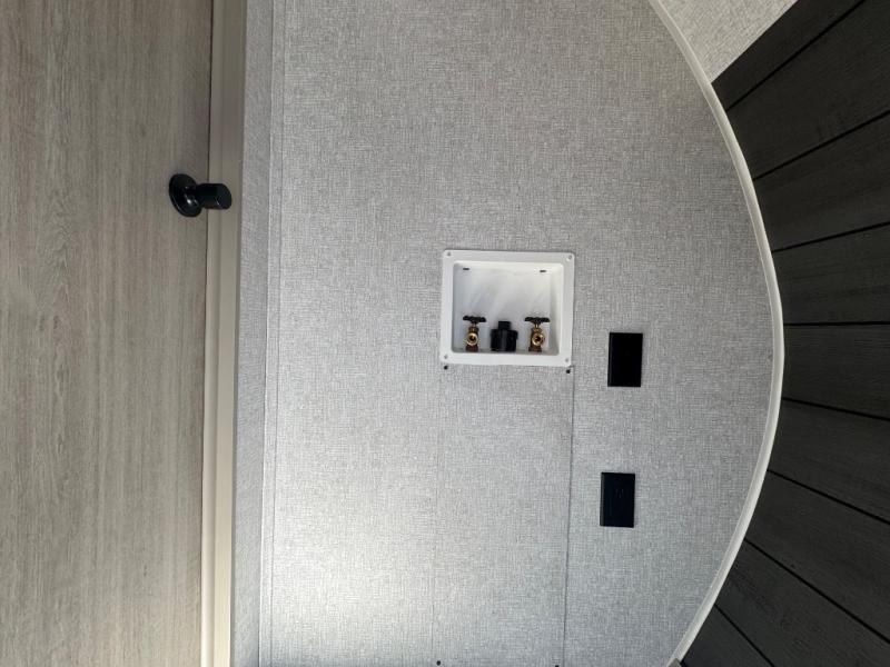This travel trailer will feel just like home with its spacious interior and at-home comforts. Since there are dual entry doors, you can enter in through the front bedroom or the rear kitchen and living area. A king bed slide in the bedroom is sure to bring comfort, and there is a closet to keep your clothes wrinkle-free, plus washer and dryer prep. The second slide out is found in the living room, and here you can relax on the jiffy sofa or dine at the booth dinette. The chef of your group will love cooking in the rear kitchen, and there is generous counter space here to set out snacks. An entryway pantry and closet will provide additional storage for snacks, jackets, and more!