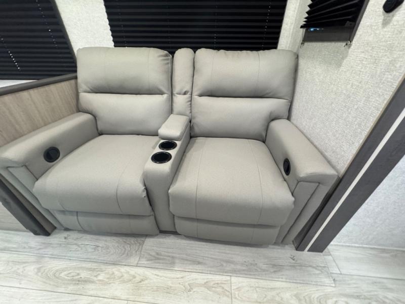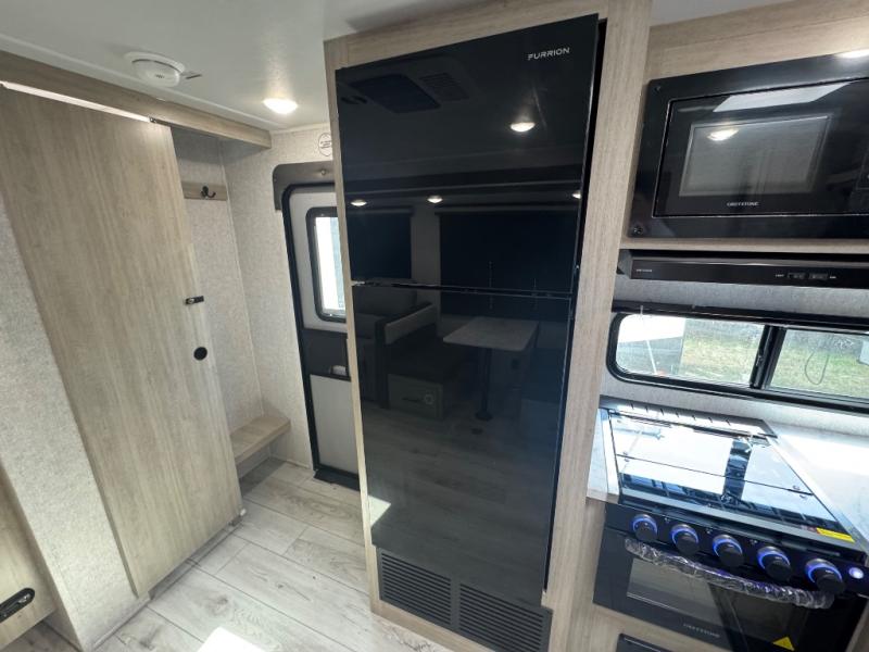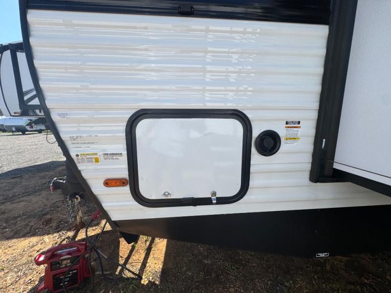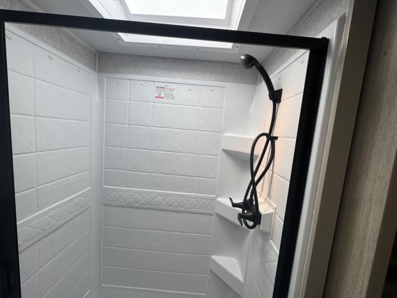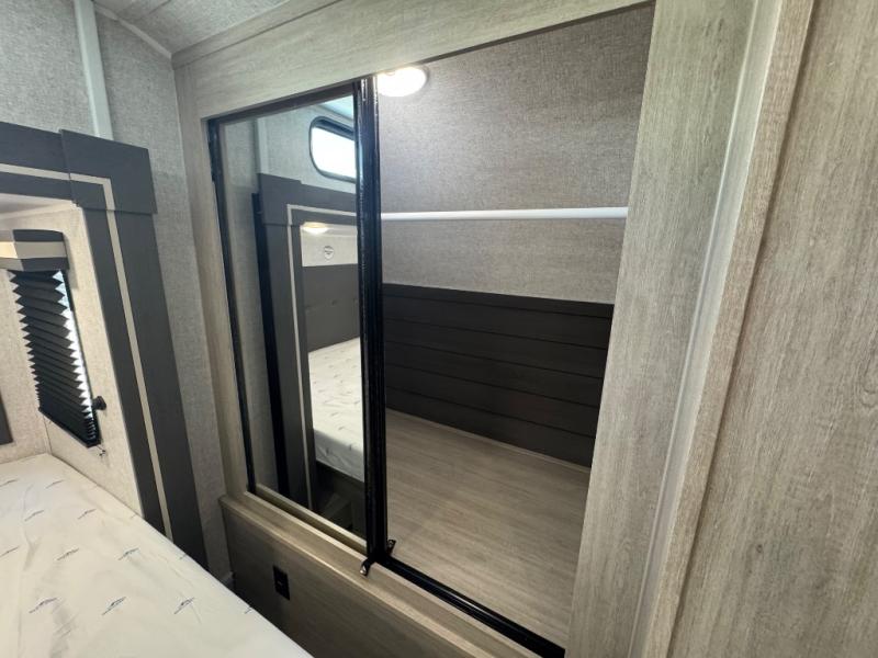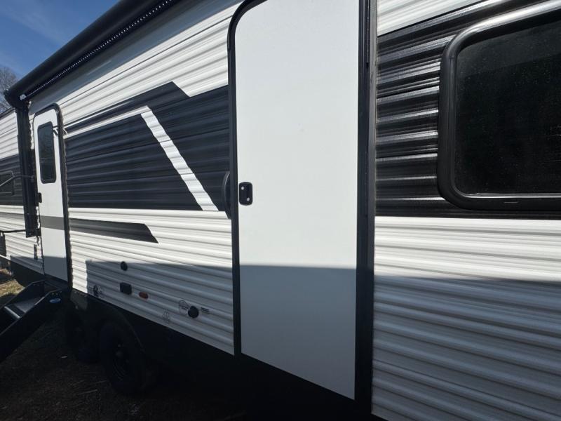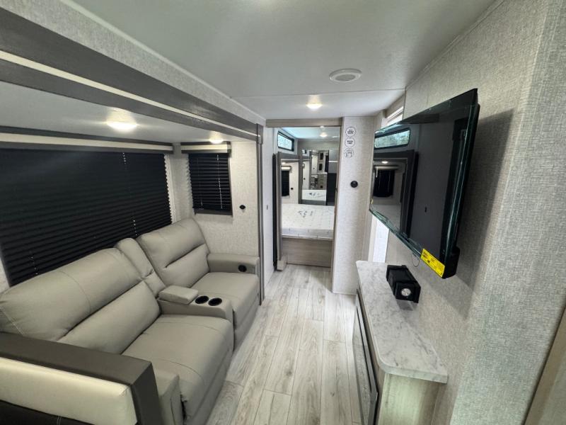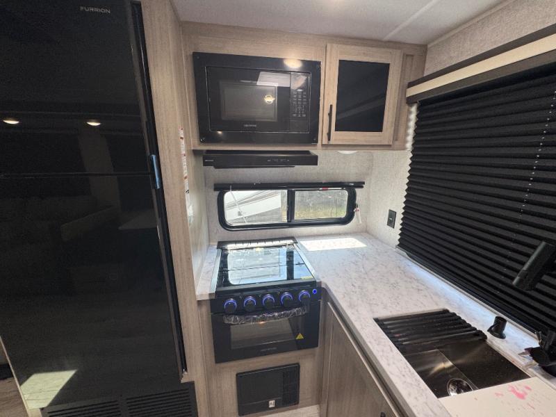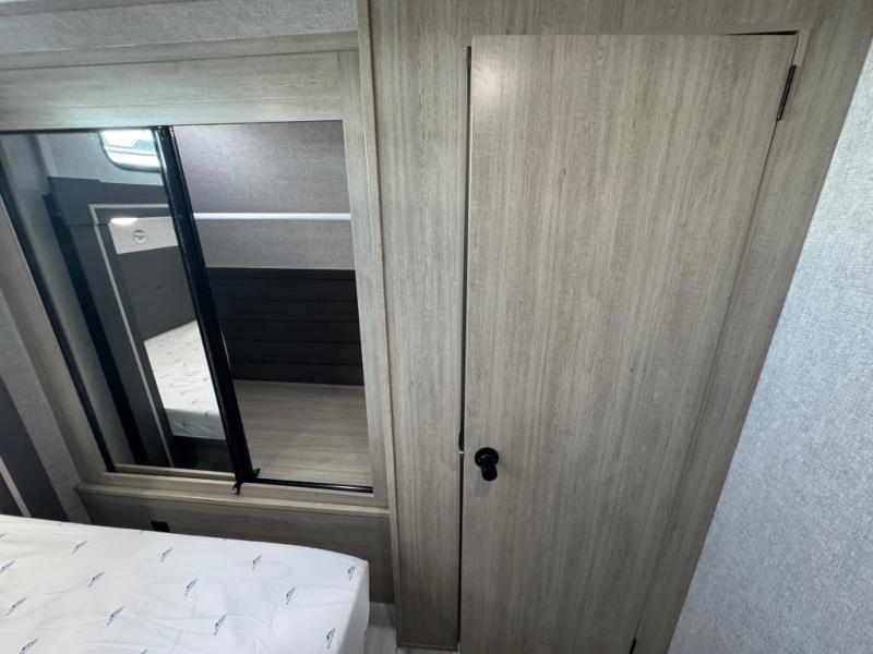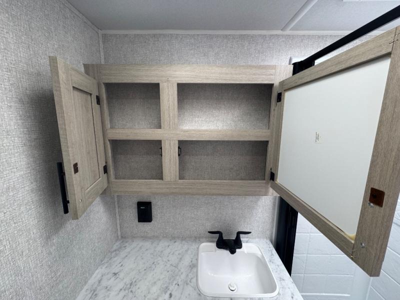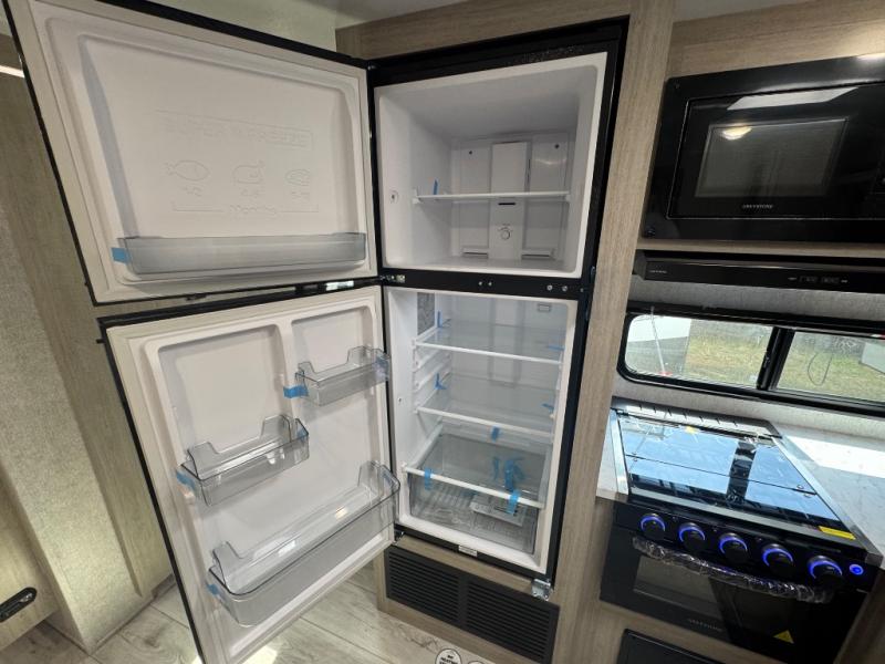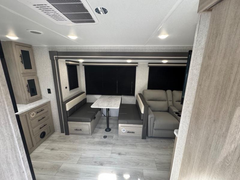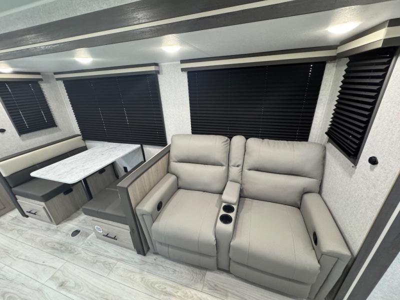 This travel trailer will feel just like home with its spacious interior and at-home comforts. Since there are dual entry doors, you can enter in through the front bedroom or the rear kitchen and living area. A king bed slide in the bedroom is sure to bring comfort, and there is a closet to keep your clothes wrinkle-free, plus washer and dryer prep. The second slide out is found in the living room, and here you can relax on the jiffy sofa or dine at the booth dinette. The chef of your group will love cooking in the rear kitchen, and there is generous counter space here to set out snacks. An entryway pantry and closet will provide additional storage for snacks, jackets, and more!