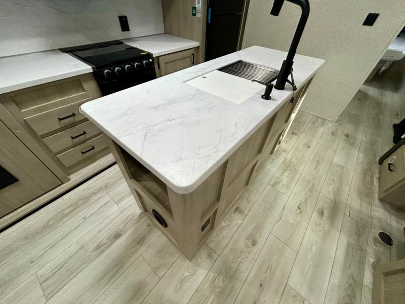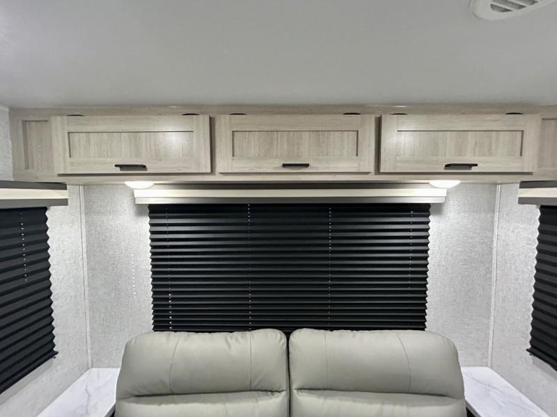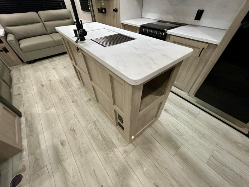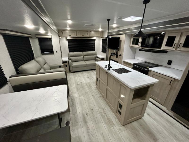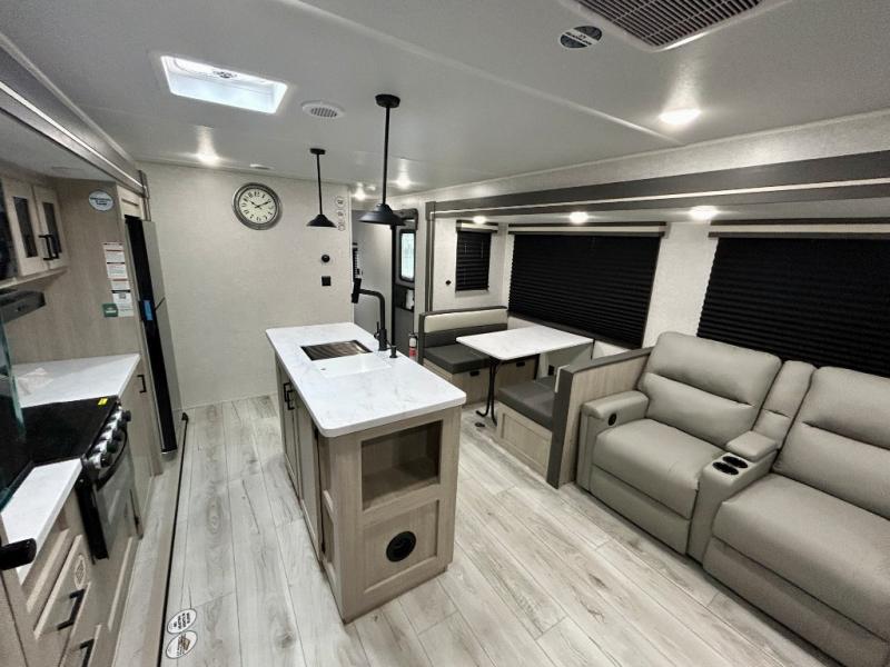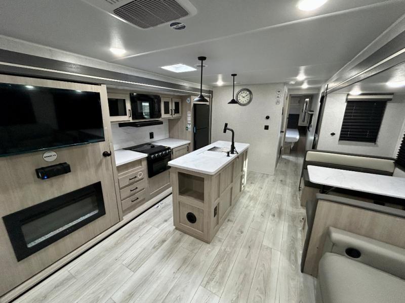 Camping in this double slide out travel trailer will be easier than ever! Once you arrive at your destination, set up the power awning, unload the pass-through storage, and head inside to make lunch in the full kitchen. There is a kitchen island for more prep space, along with a 10.7 cu. ft. 12V refrigerator, three burner range, and microwave oven. You'll find comfortable seating space on the booth dinette, jiffy sofa, and dual lounge chairs, and the fireplace is sure to make your space feel more like home. There is also hidden storage behind the fireplace for pantry items, board games, and more! Up front, a full bath and front private bedroom will let you freshen up before a great night's rest on the king bed!