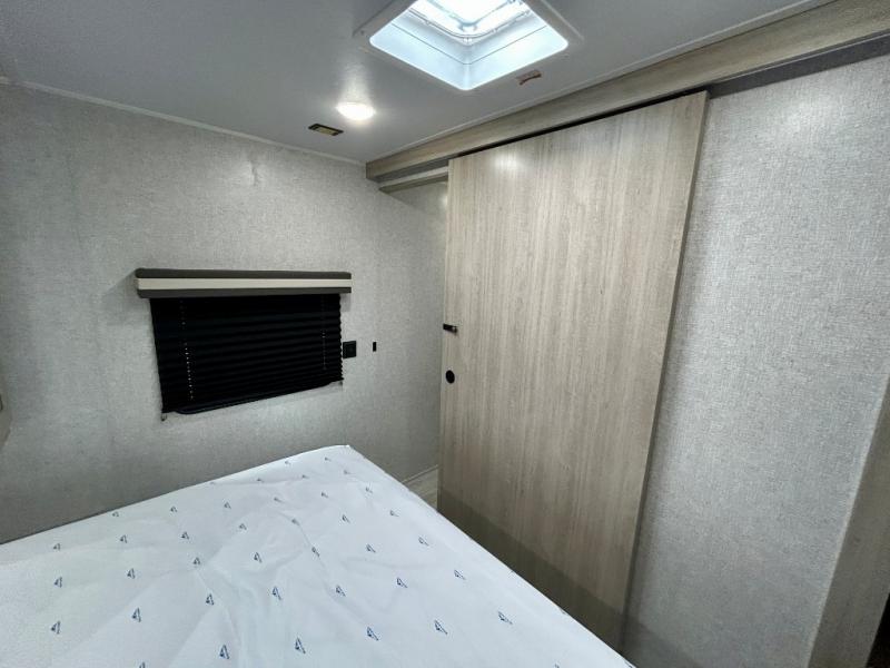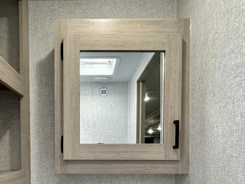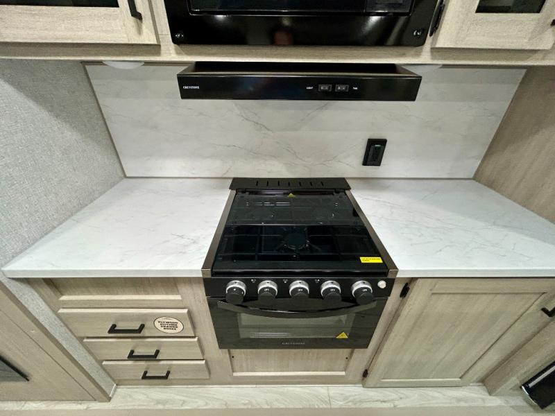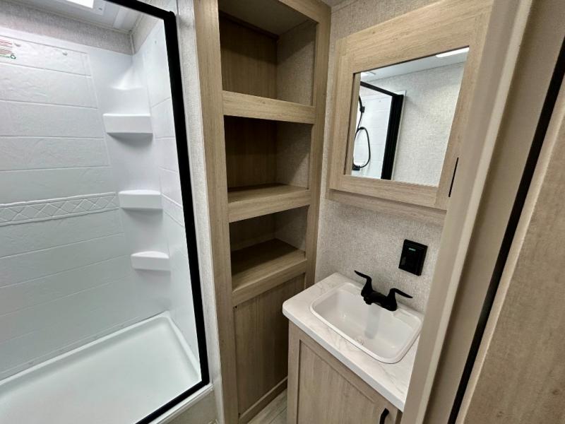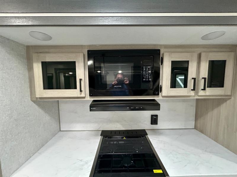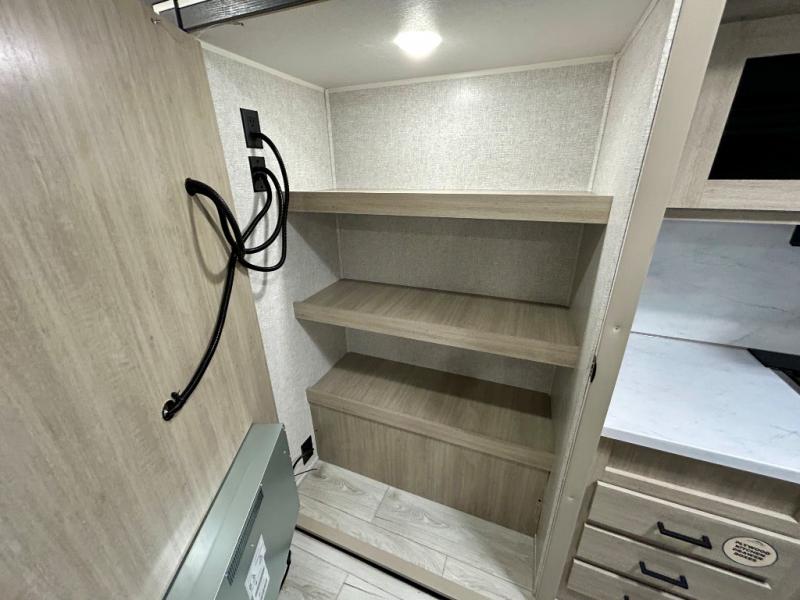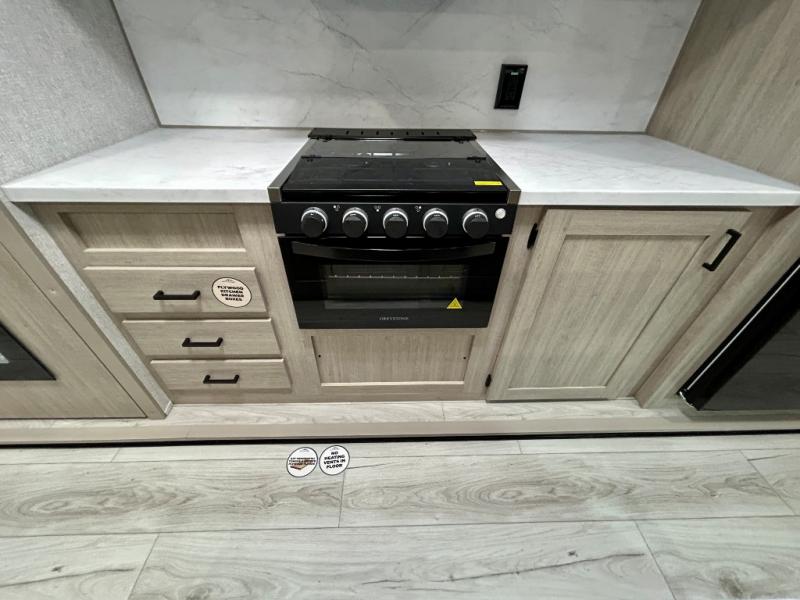 Camping in this double slide out travel trailer will be easier than ever! Once you arrive at your destination, set up the power awning, unload the pass-through storage, and head inside to make lunch in the full kitchen. There is a kitchen island for more prep space, along with a 10.7 cu. ft. 12V refrigerator, three burner range, and microwave oven. You'll find comfortable seating space on the booth dinette, jiffy sofa, and dual lounge chairs, and the fireplace is sure to make your space feel more like home. There is also hidden storage behind the fireplace for pantry items, board games, and more! Up front, a full bath and front private bedroom will let you freshen up before a great night's rest on the king bed!