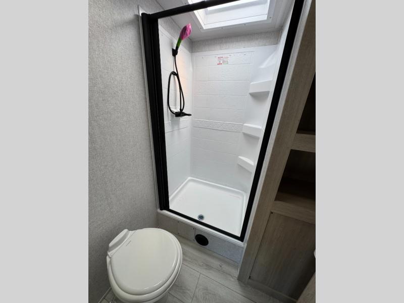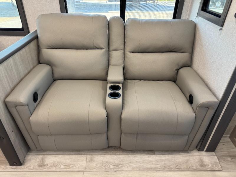 Camping in this double slide out travel trailer will be easier than ever! Once you arrive at your destination, set up the power awning, unload the pass-through storage, and head inside to make lunch in the full kitchen. There is a kitchen island for more prep space, along with a 10.7 cu. ft. 12V refrigerator, three burner range, and microwave oven. You'll find comfortable seating space on the booth dinette, jiffy sofa, and dual lounge chairs, and the fireplace is sure to make your space feel more like home. There is also hidden storage behind the fireplace for pantry items, board games, and more! Up front, a full bath and front private bedroom will let you freshen up before a great night's rest on the king bed!