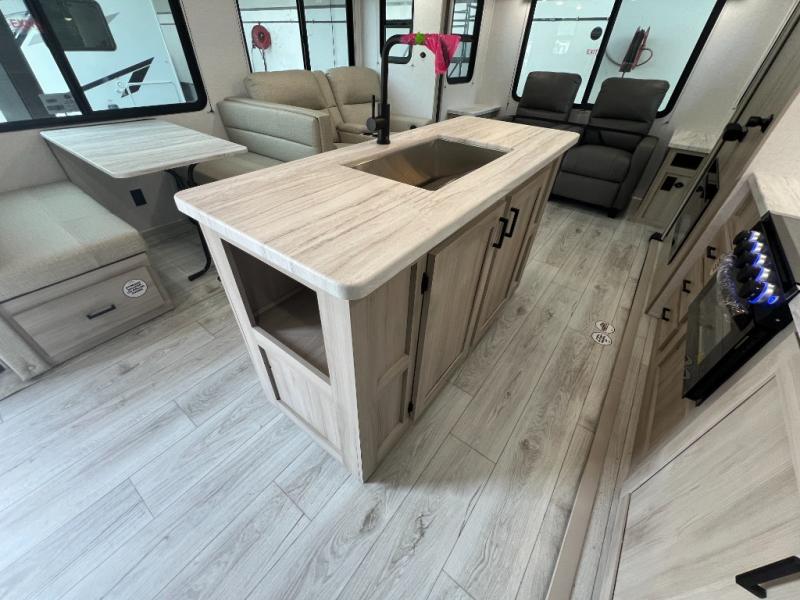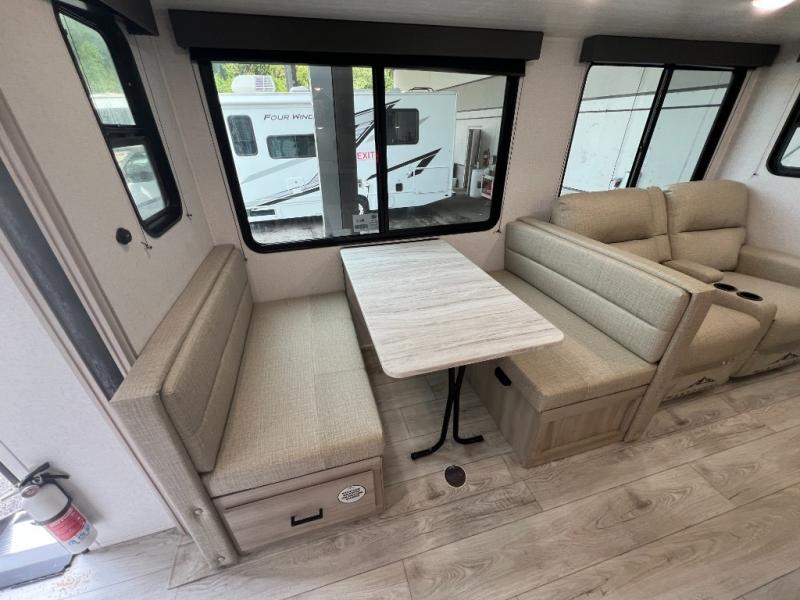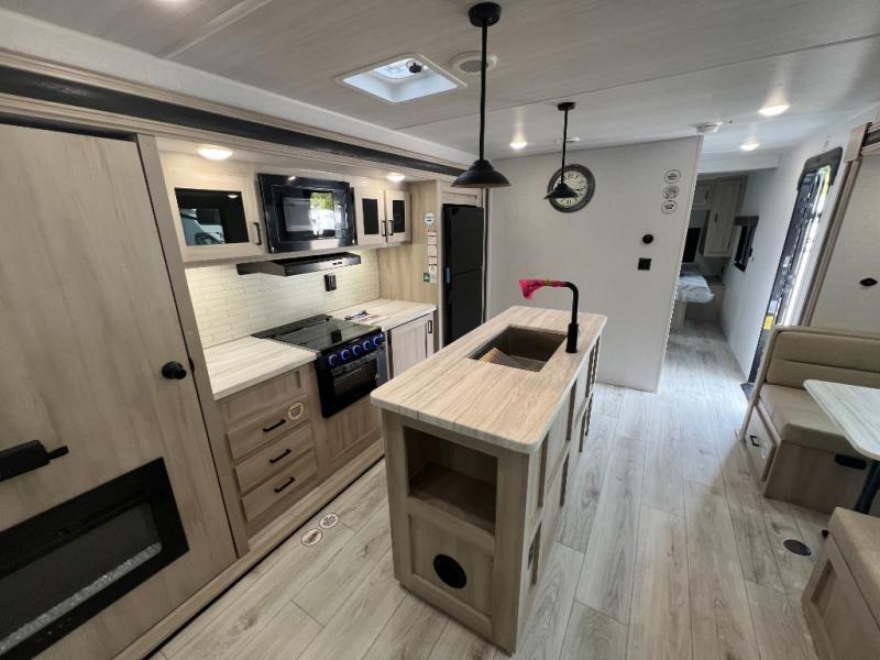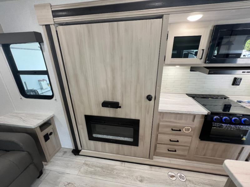 Camping in this double slide out travel trailer will be easier than ever! Once you arrive at your destination, set up the power awning, unload the pass-through storage, and head inside to make lunch in the full kitchen. There is a kitchen island for more prep space, along with a 10.7 cu. ft. 12V refrigerator, three burner range, and microwave oven. You'll find comfortable seating space on the booth dinette, jiffy sofa, and dual lounge chairs, and the fireplace is sure to make your space feel more like home. There is also hidden storage behind the fireplace for pantry items, board games, and more! Up front, a full bath and front private bedroom will let you freshen up before a great night's rest on the king bed!