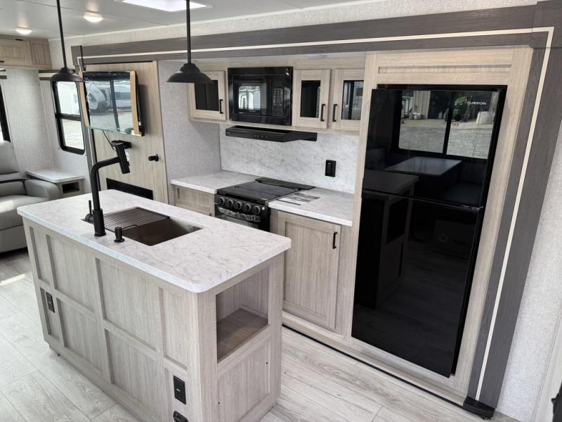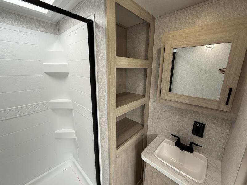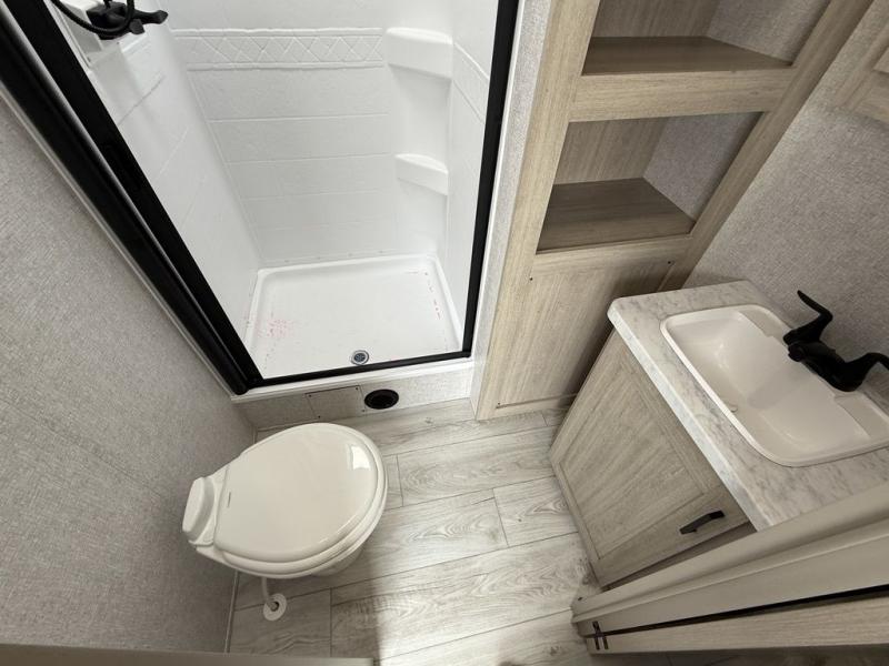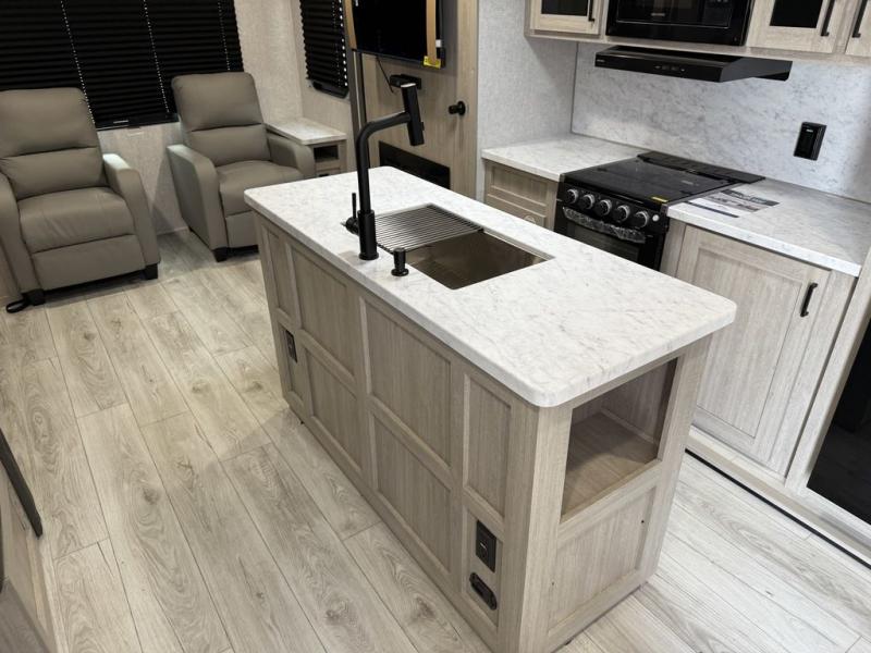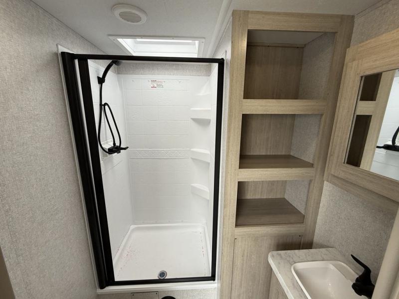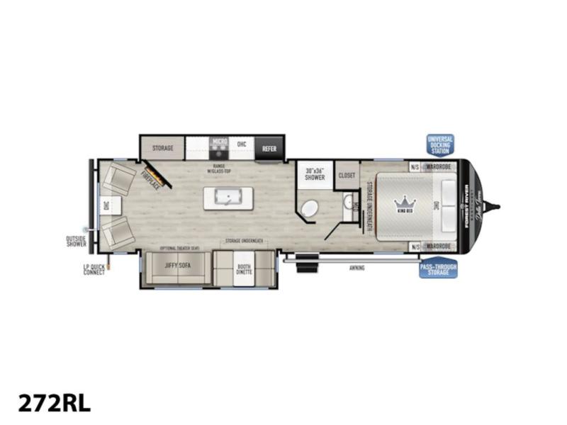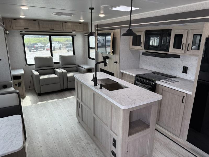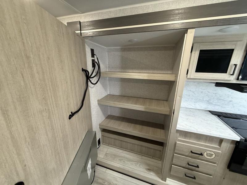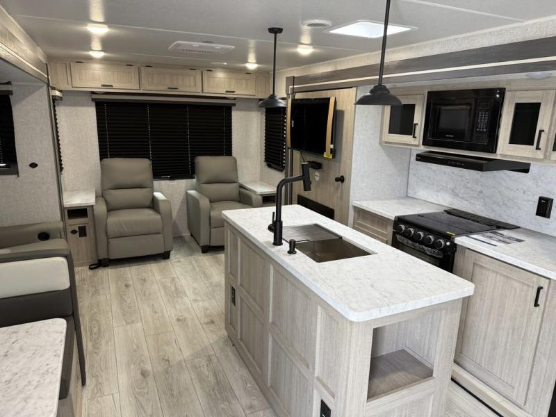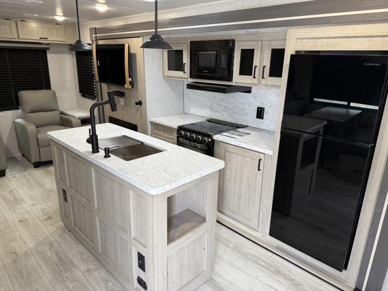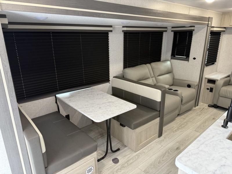 Camping in this double slide out travel trailer will be easier than ever! Once you arrive at your destination, set up the power awning, unload the pass-through storage, and head inside to make lunch in the full kitchen. There is a kitchen island for more prep space, along with a 10.7 cu. ft. 12V refrigerator, three burner range, and microwave oven. You'll find comfortable seating space on the booth dinette, jiffy sofa, and dual lounge chairs, and the fireplace is sure to make your space feel more like home. There is also hidden storage behind the fireplace for pantry items, board games, and more! Up front, a full bath and front private bedroom will let you freshen up before a great night's rest on the king bed!