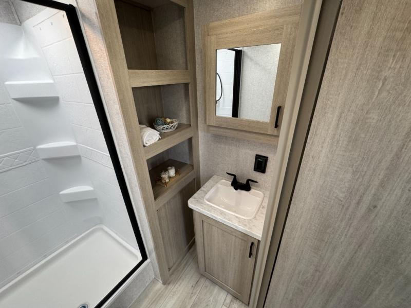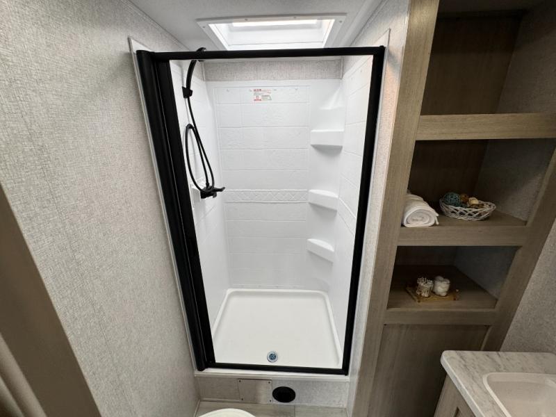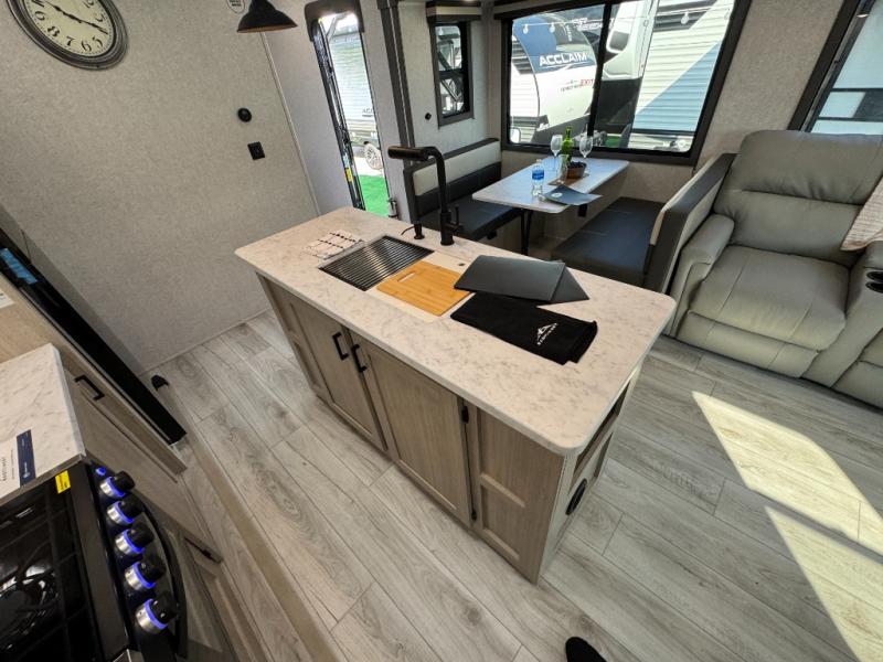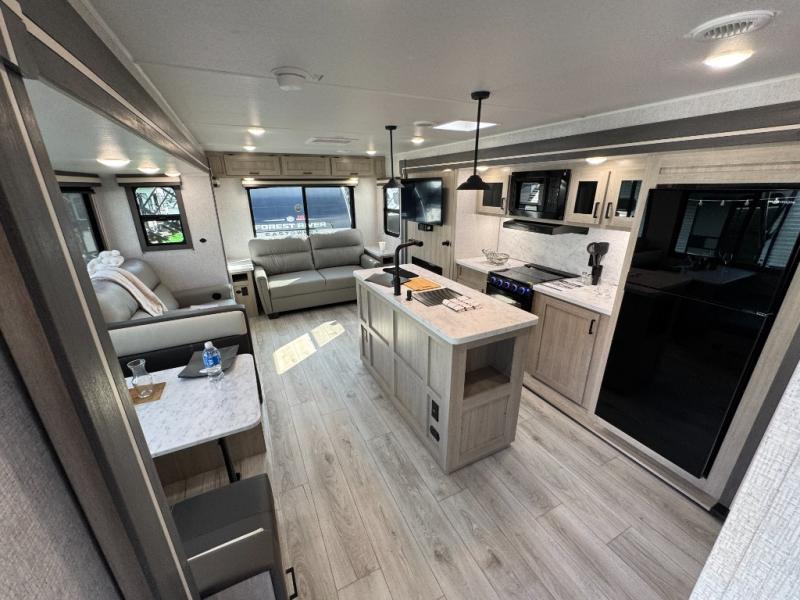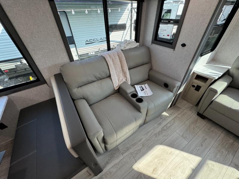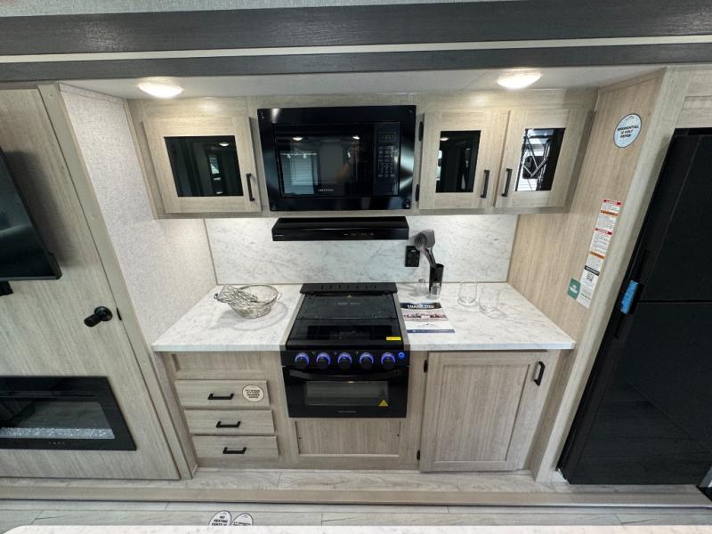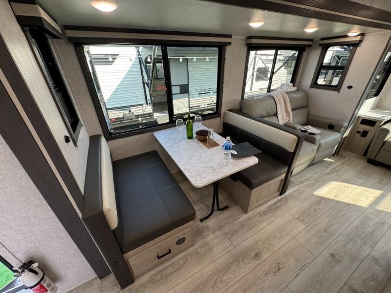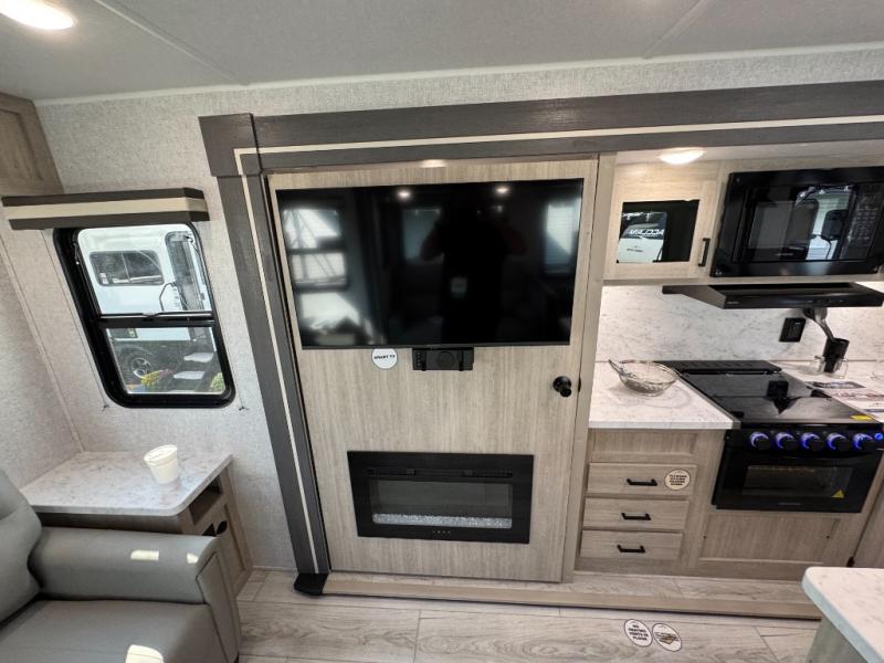 Camping in this double slide out travel trailer will be easier than ever! Once you arrive at your destination, set up the power awning, unload the pass-through storage, and head inside to make lunch in the full kitchen. There is a kitchen island for more prep space, along with a 10.7 cu. ft. 12V refrigerator, three burner range, and microwave oven. You'll find comfortable seating space on the booth dinette, jiffy sofa, and dual lounge chairs, and the fireplace is sure to make your space feel more like home. There is also hidden storage behind the fireplace for pantry items, board games, and more! Up front, a full bath and front private bedroom will let you freshen up before a great night's rest on the king bed!